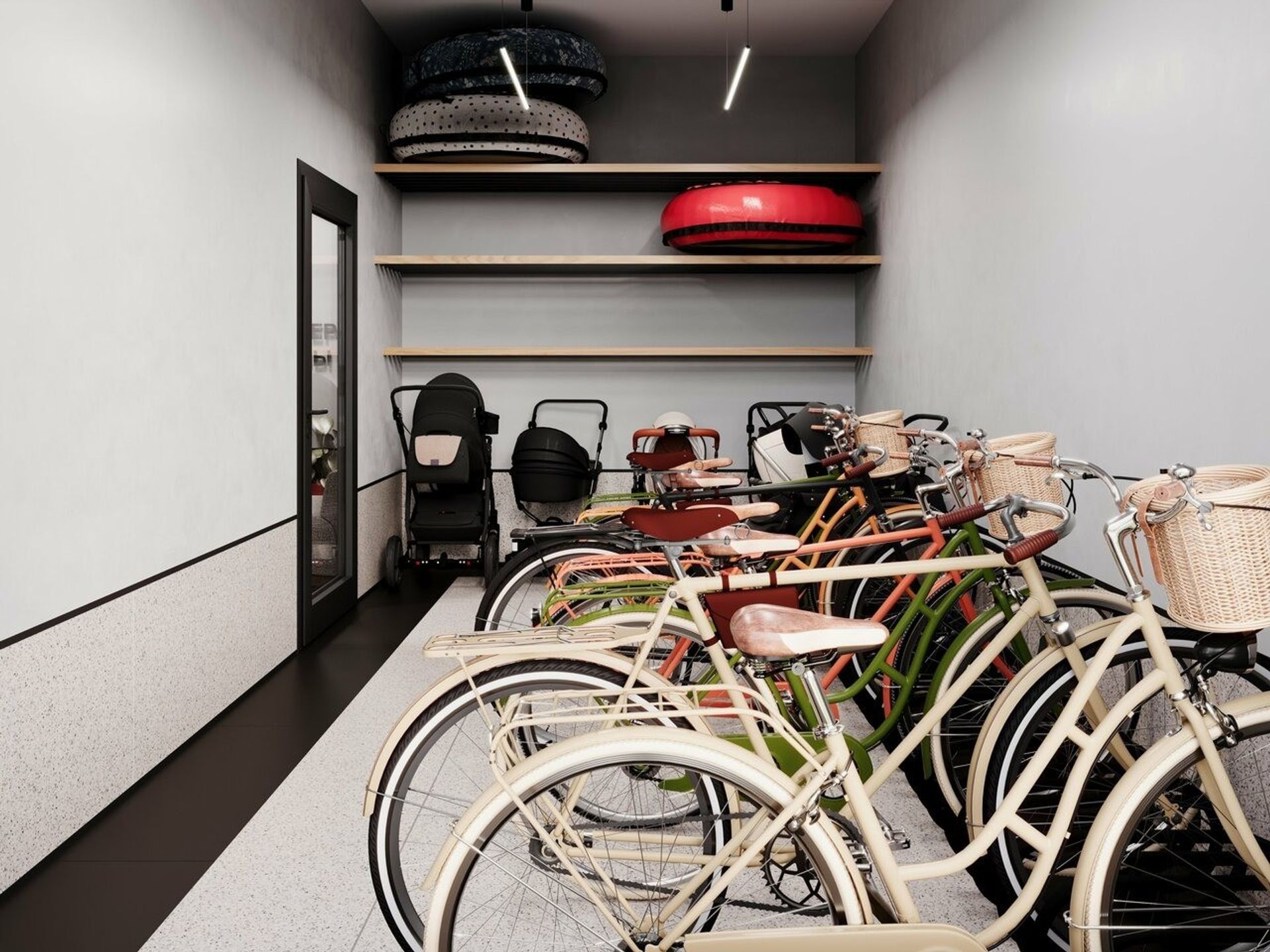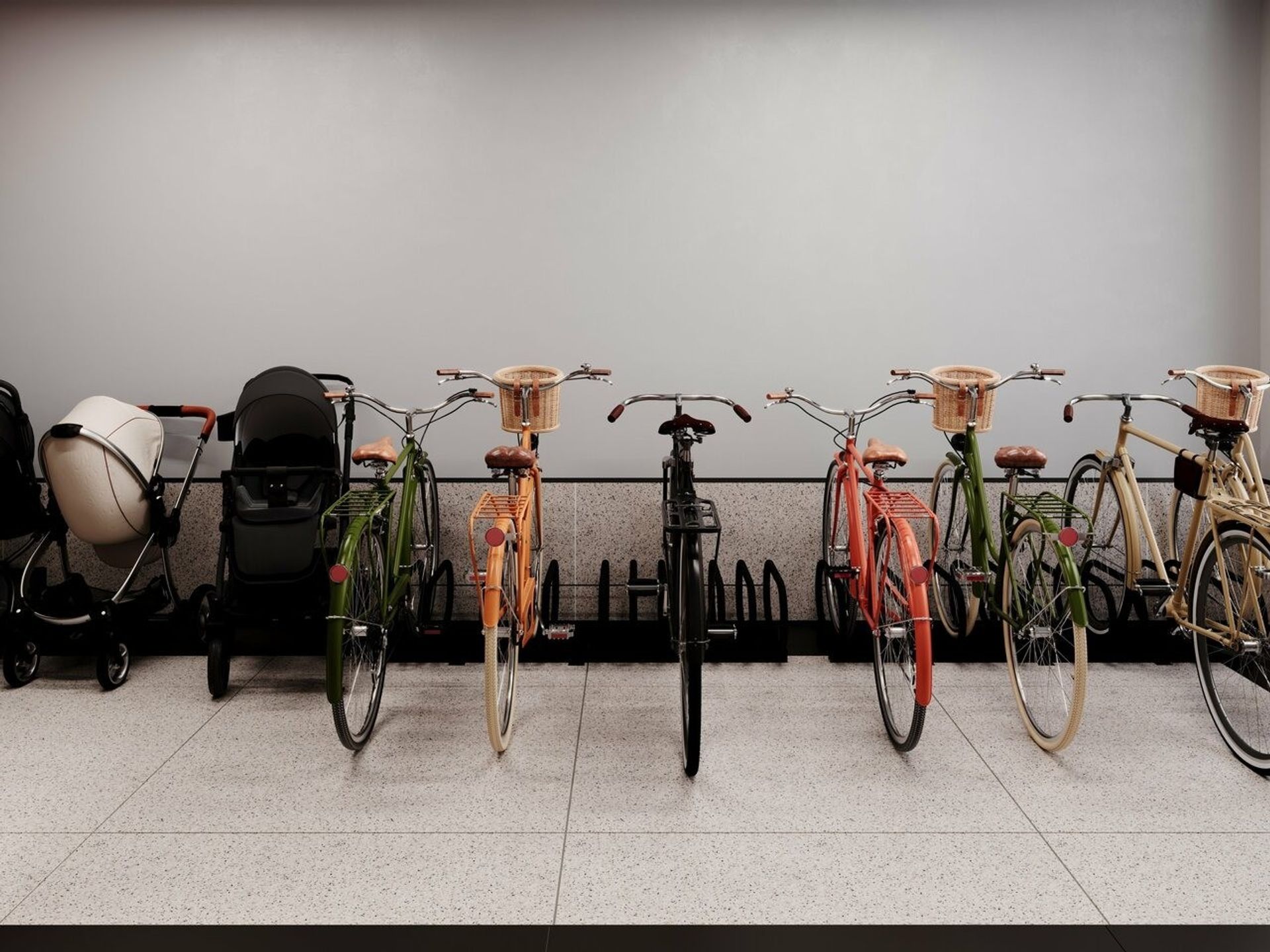 - Колясочные в каждой секции: велосипеды, самокаты, сезонный инвентарь