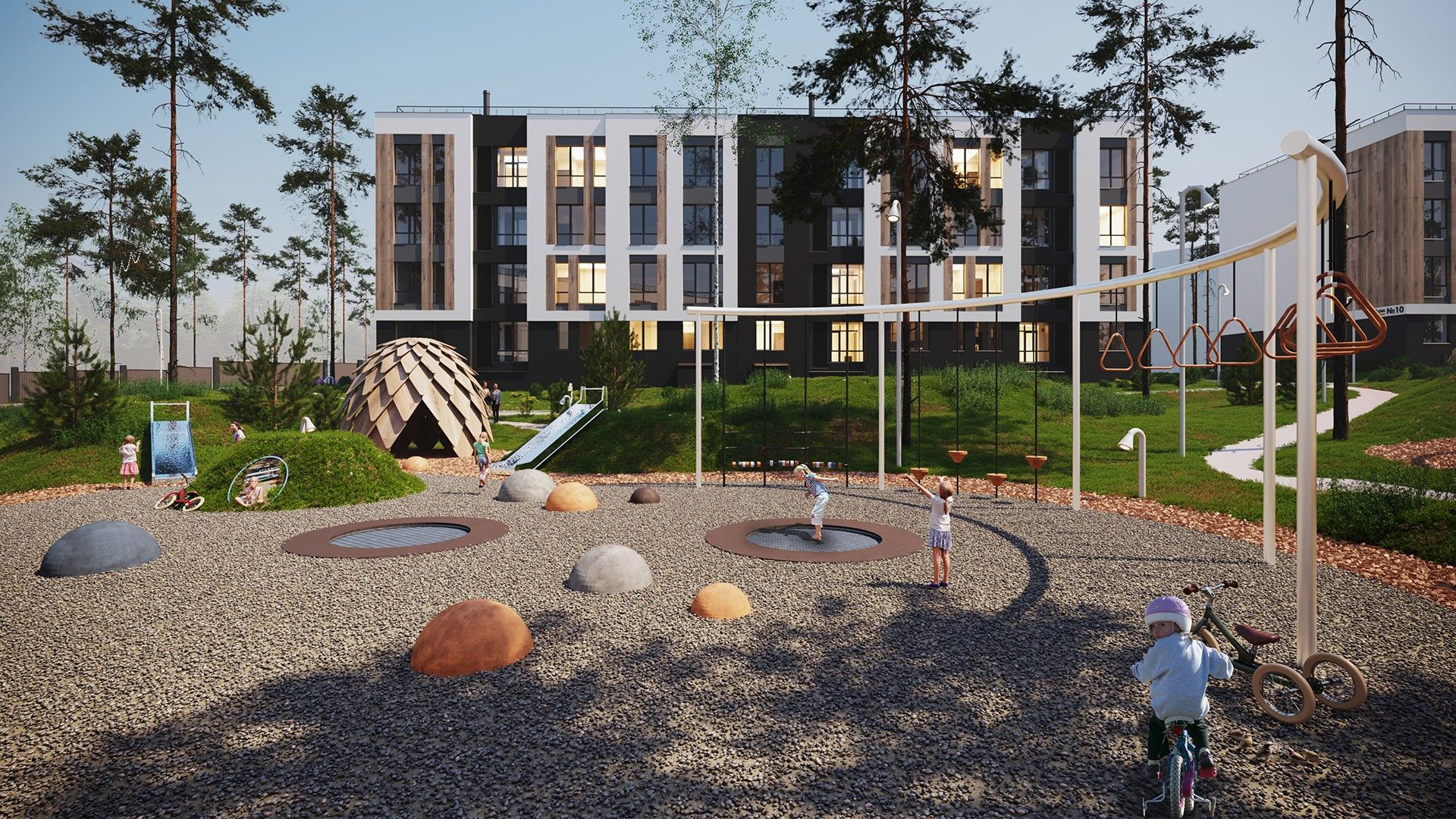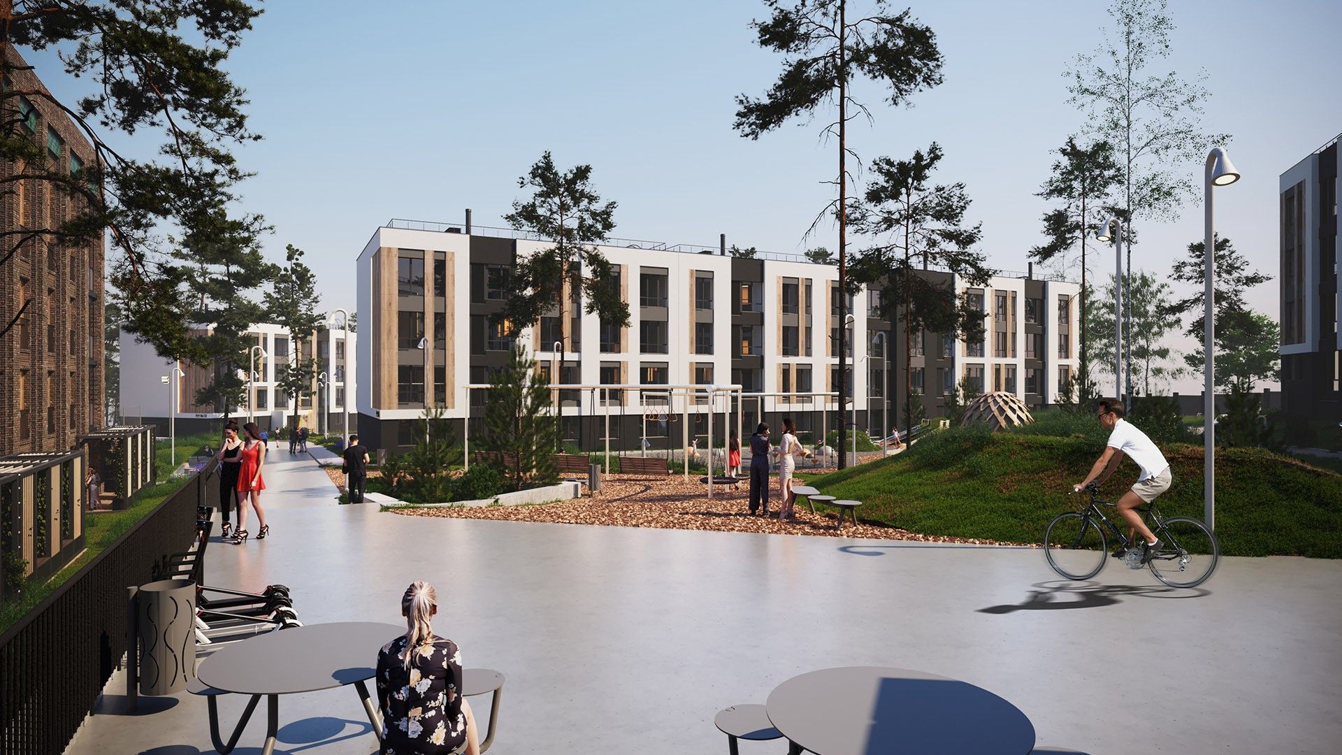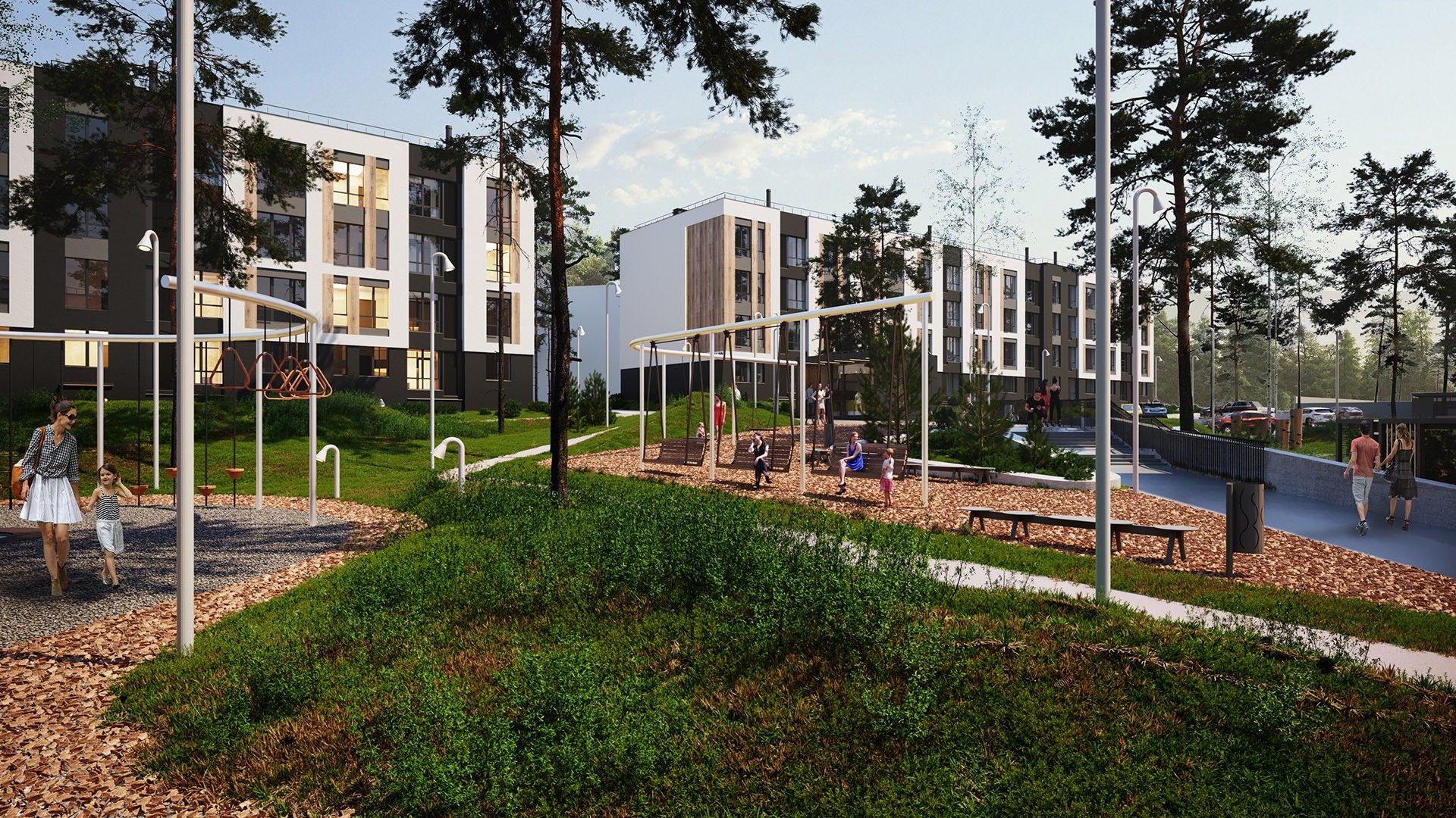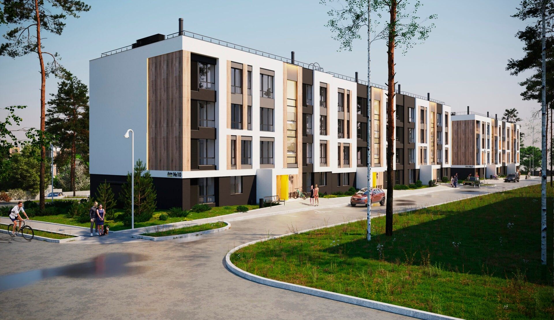 Малоэтажные четырёхэтажные дома объединены большим зелёным пространством и центральным пешеходным бульваром длиной около 700 метров. Внутри — спокойные дворы без машин и продуманная среда для детей и взрослых.