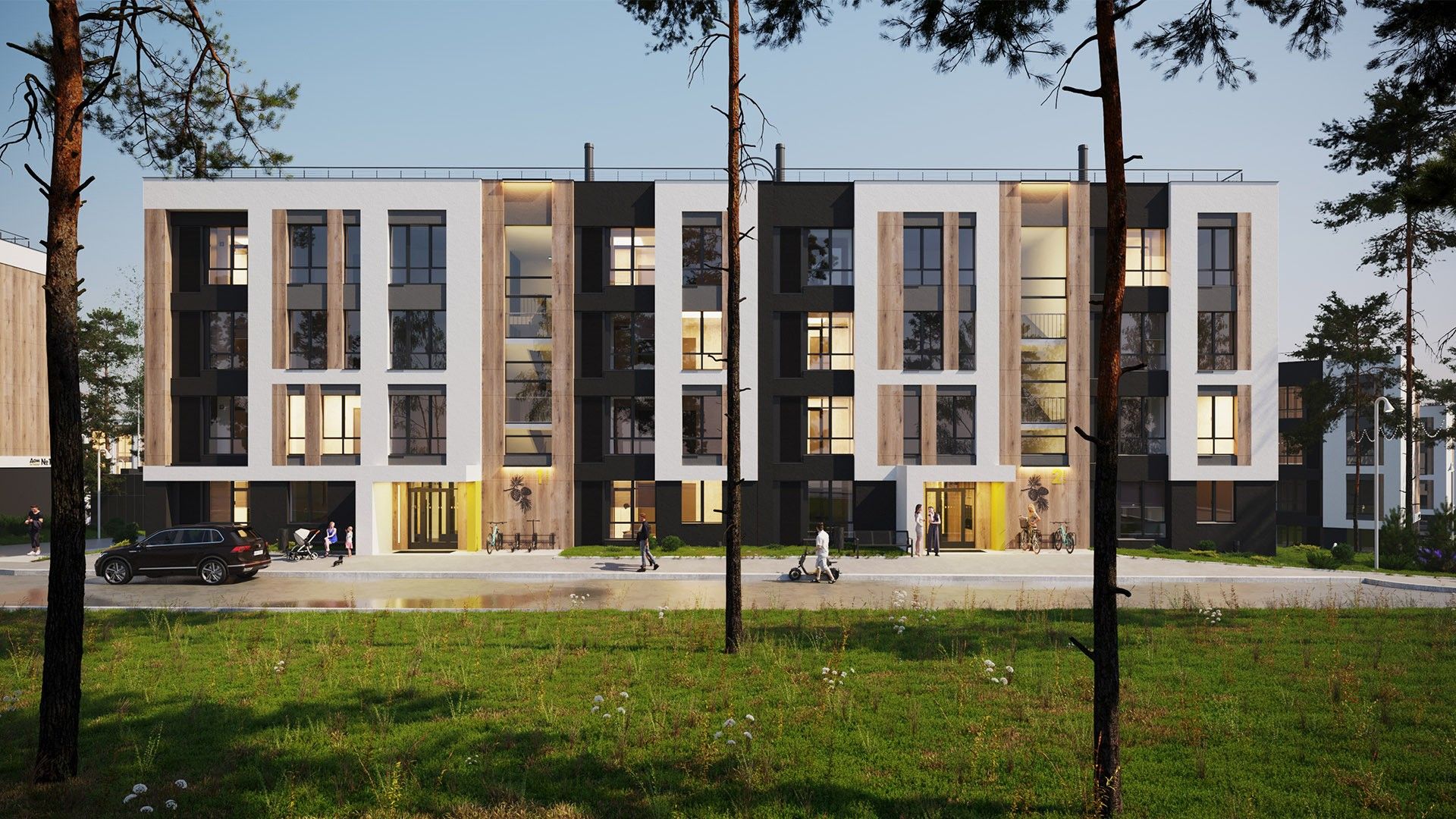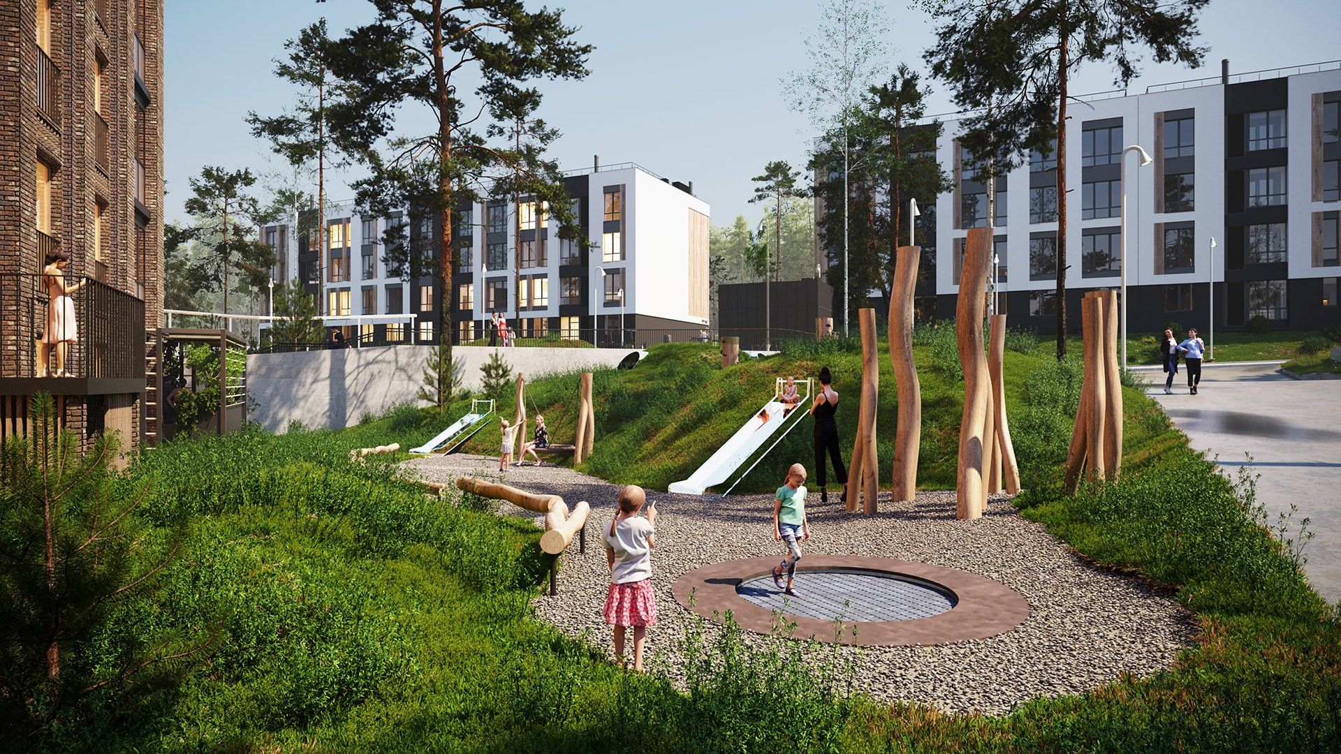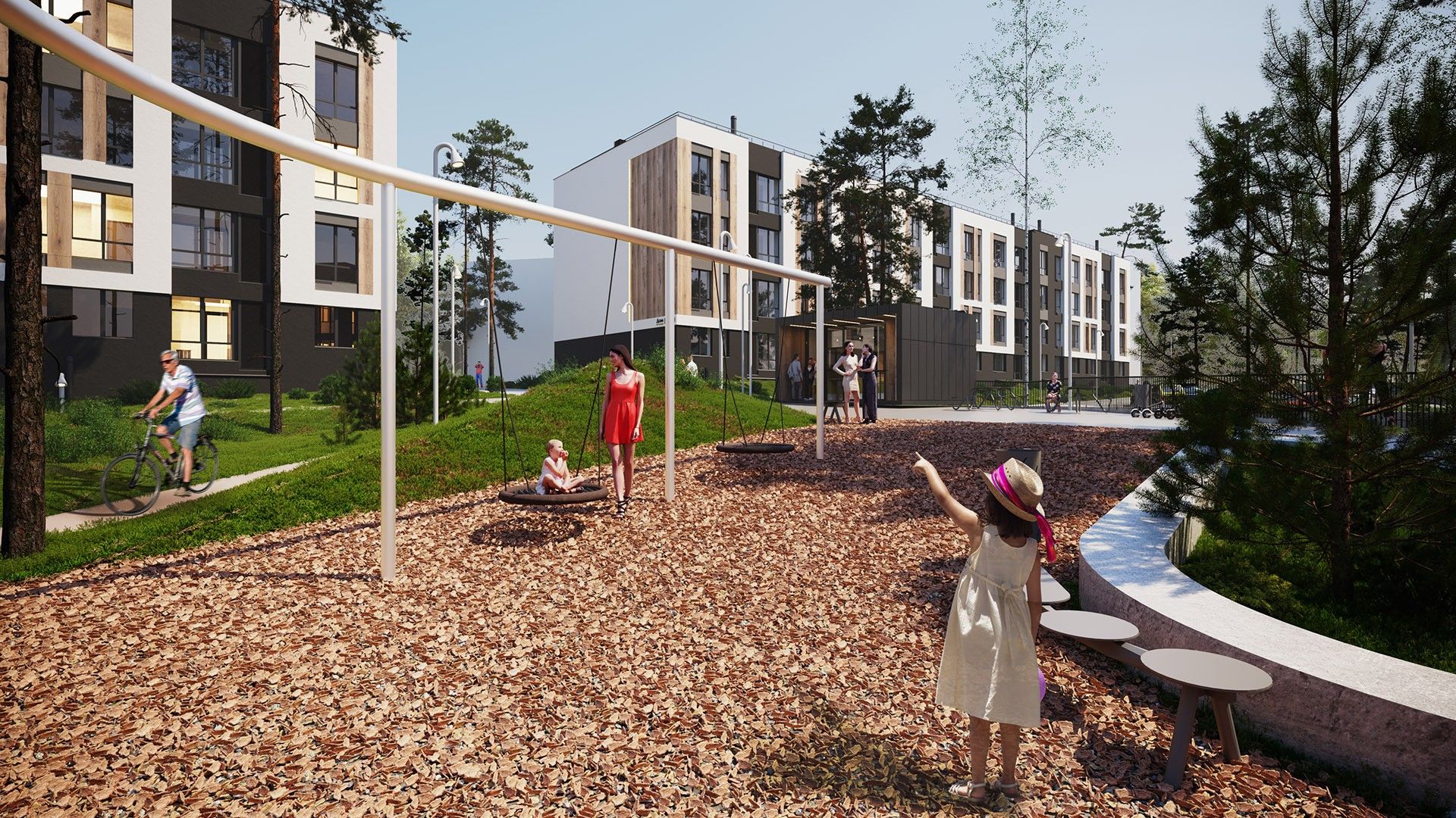 Малоэтажные четырёхэтажные дома объединены большим зелёным пространством и центральным пешеходным бульваром длиной около 700 метров. Внутри — спокойные дворы без машин и продуманная среда для детей и взрослых.