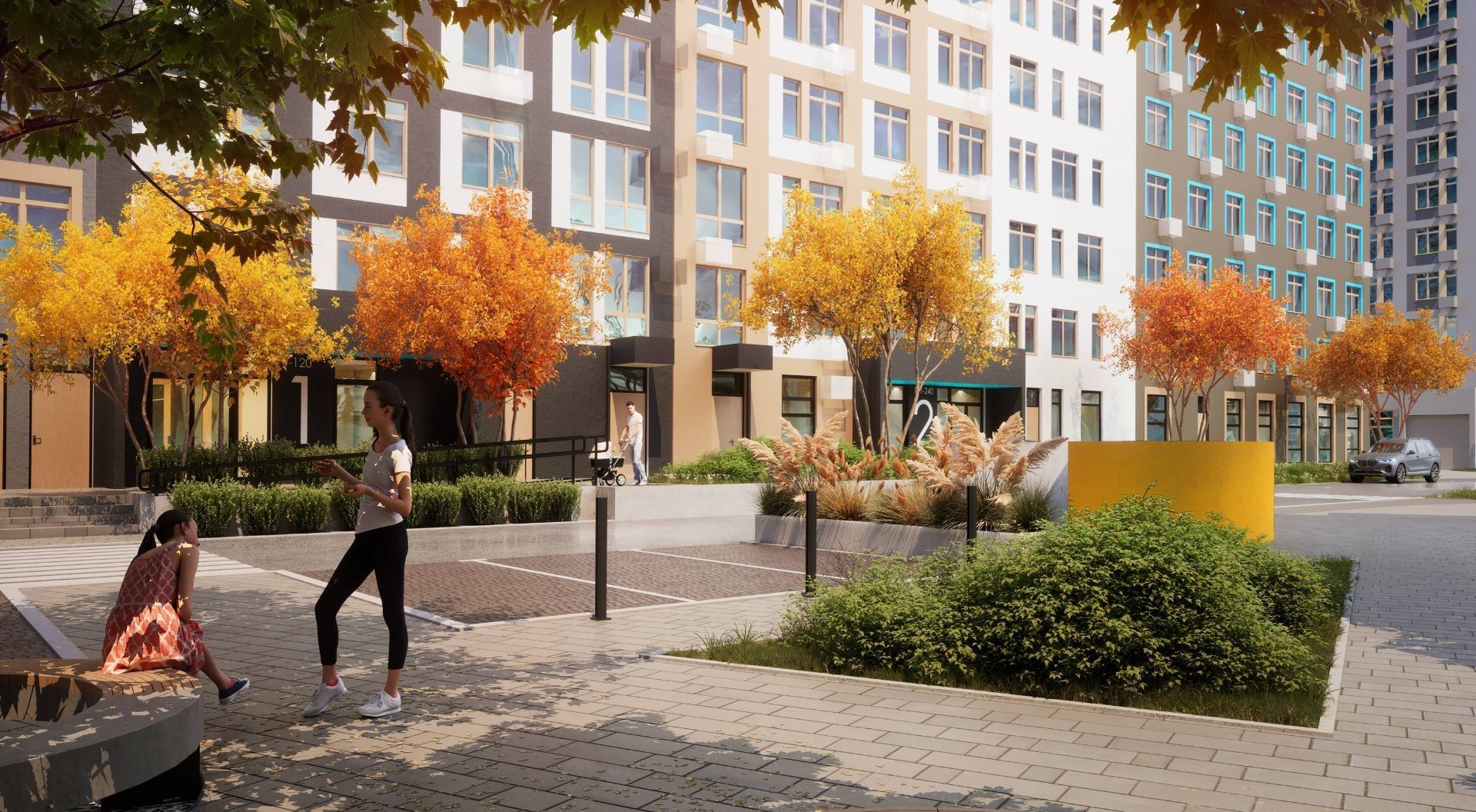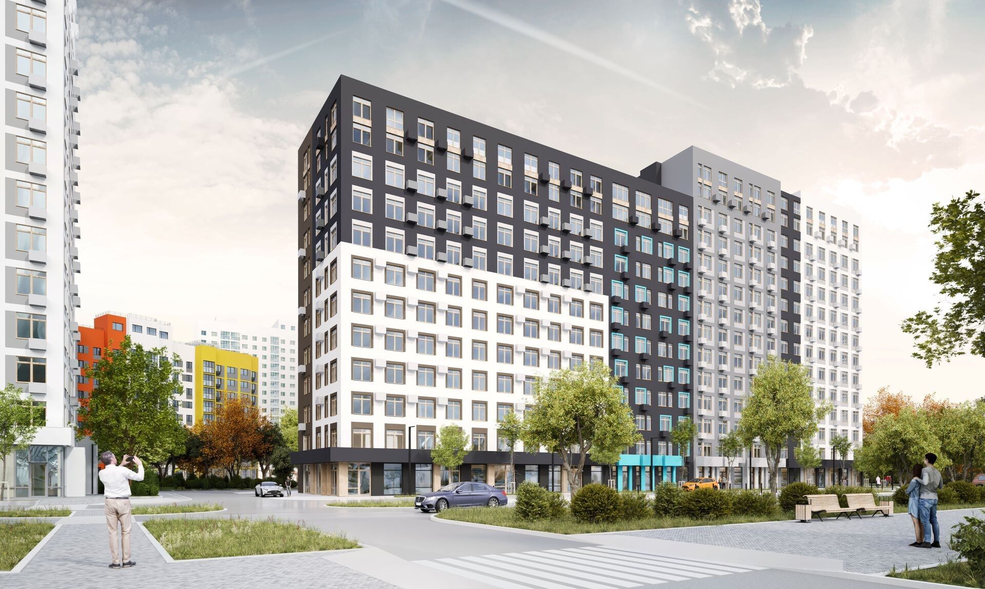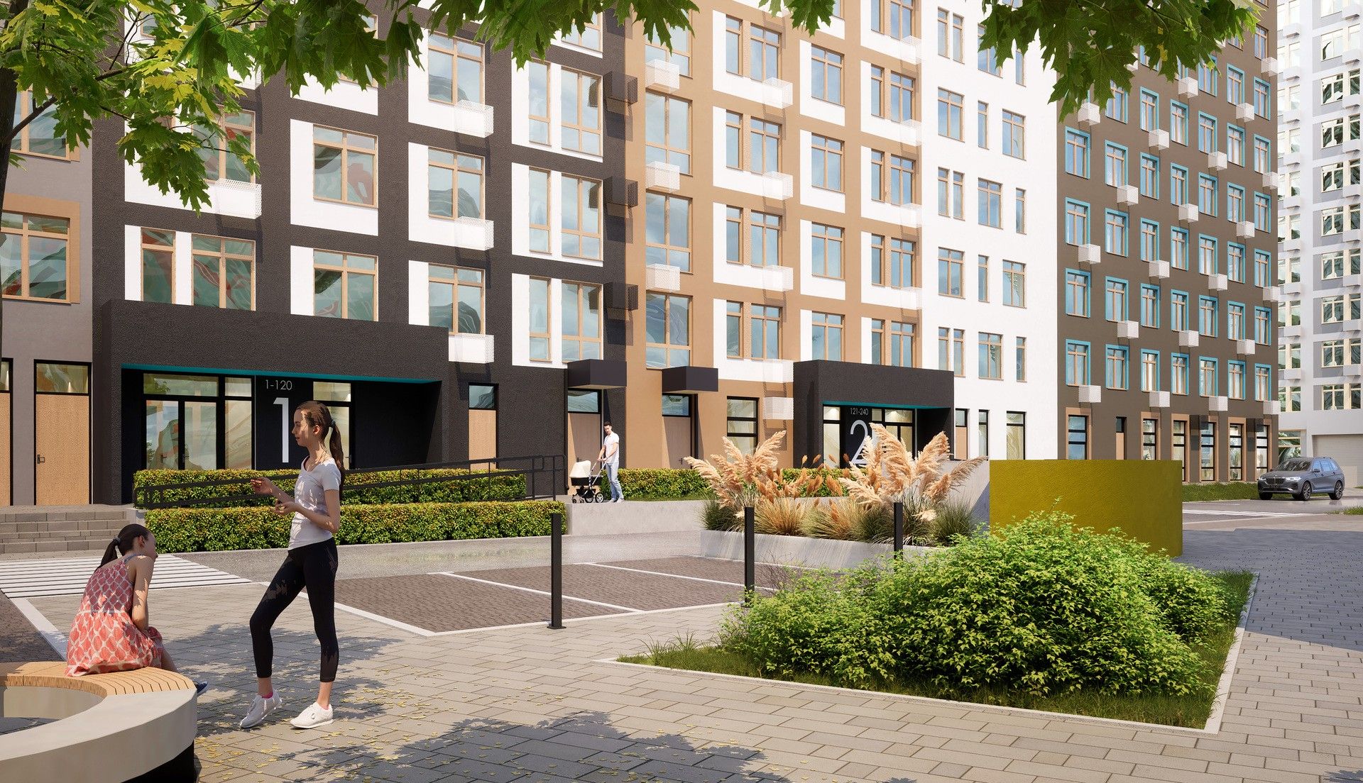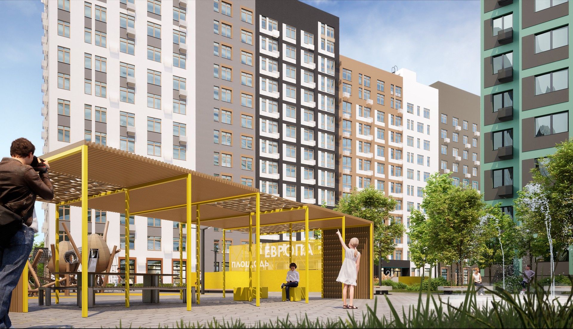 Дома «Европы» носят названия европейских стран — «Черногория», «Сербия», «Великобритания». Торцы украшают муралы с мотивами культурного кода: «Италия», «Германия», «Швеция» от стрит-арт художника Александра Волкова. Это не просто акцент — визуальный язык квартала.