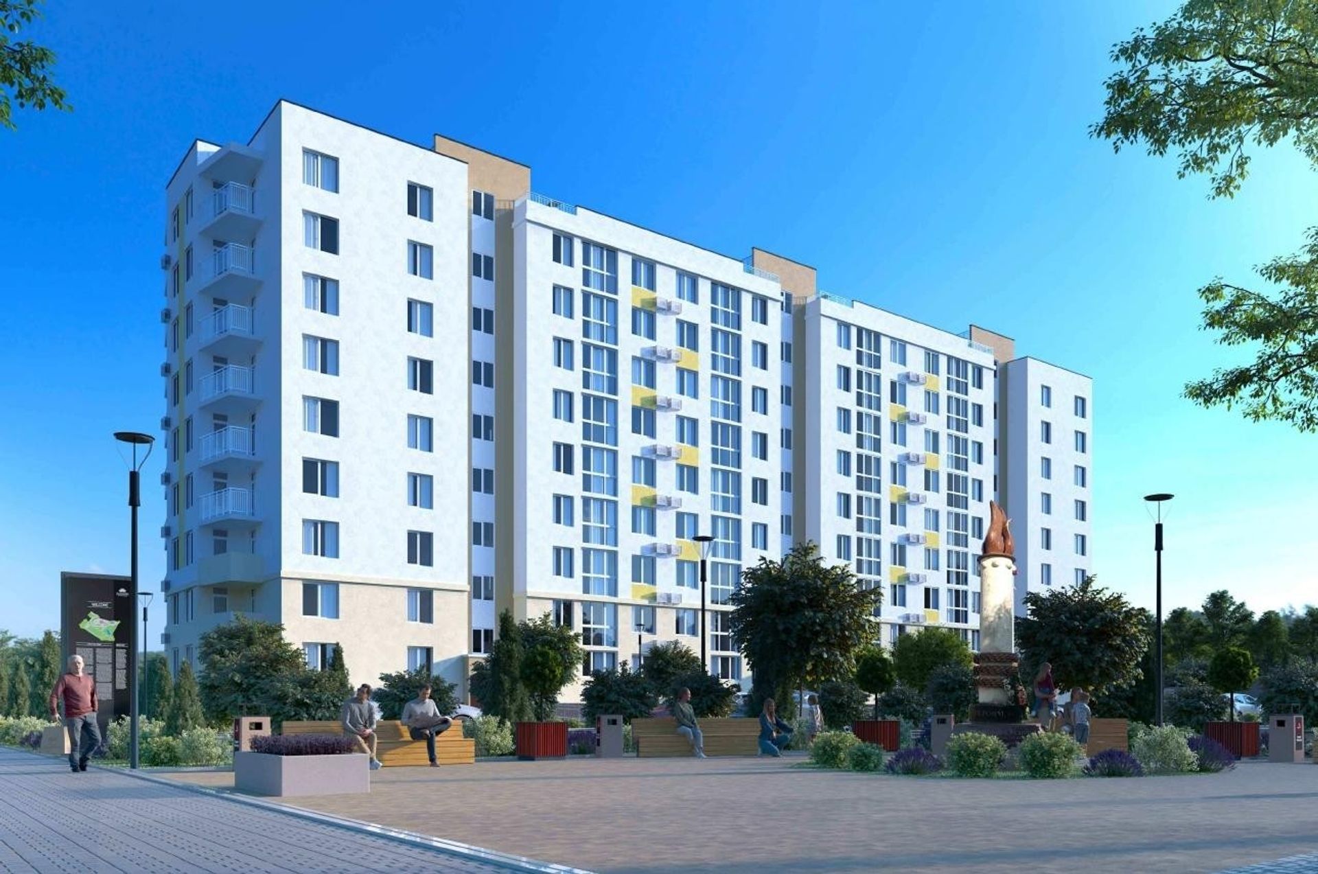 Особое внимание уделено благоустройству вокруг дома: прилегающая территория вымощена дорожками, разбиты газоны и клумбы, установлены фонари уличного освещения и скамейки для отдыха. Благодаря этому двор жилого комплекса выглядит уютным и ухоженным, создавая приятное пространство для повседневной жизни.