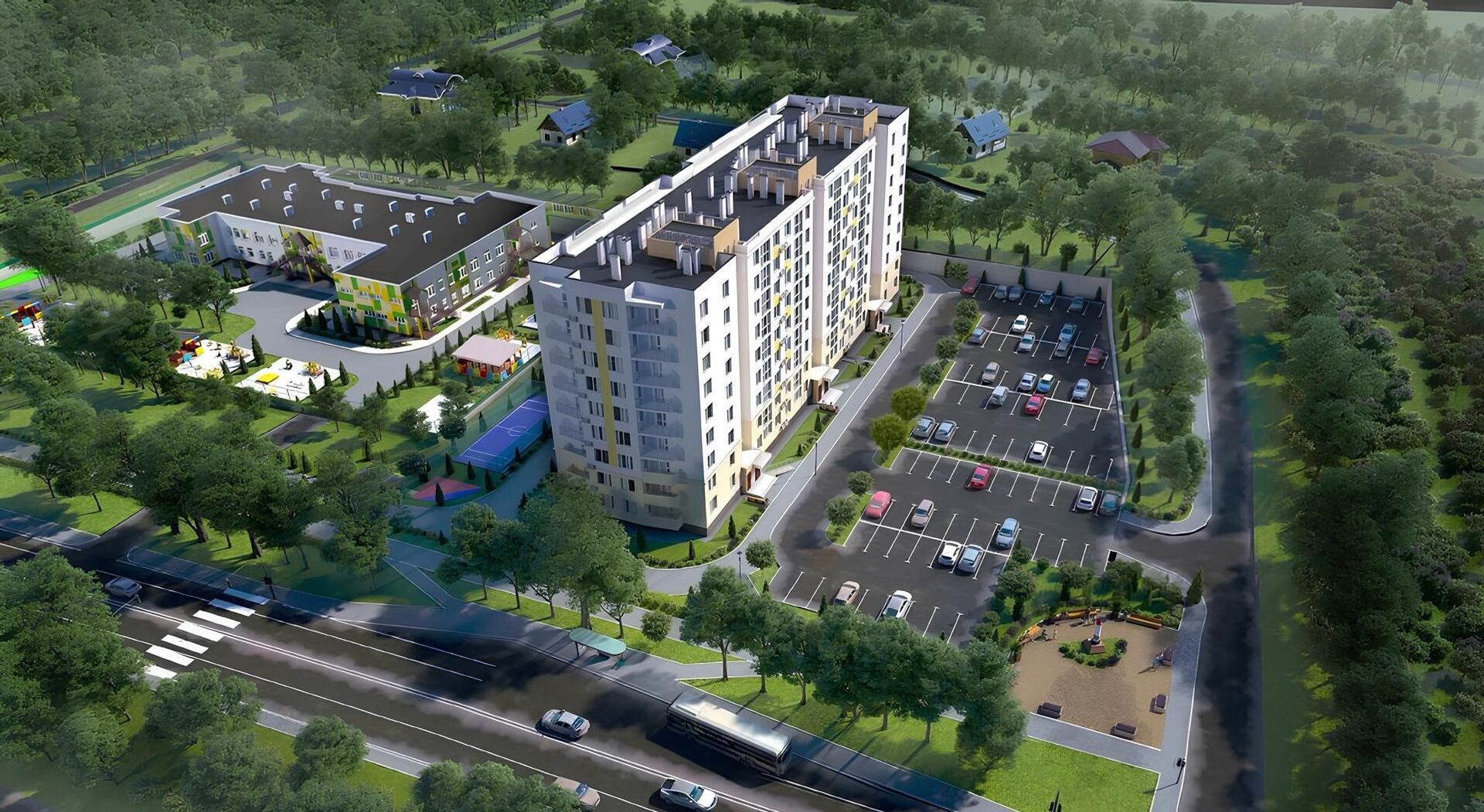 Во дворе оборудуют 2 современные детские площадки с безопасным покрытием и игровыми комплексами для разных возрастов, а также 3 спортивные площадки – для занятий на тренажёрах, игры в командные виды спорта и воркаута на свежем воздухе. Предусмотрены удобные прогулочные дорожки и зелёные зоны: жители смогут гулять по тенистым дорожкам прямо у дома или отдыхать в беседках и на лавочках.