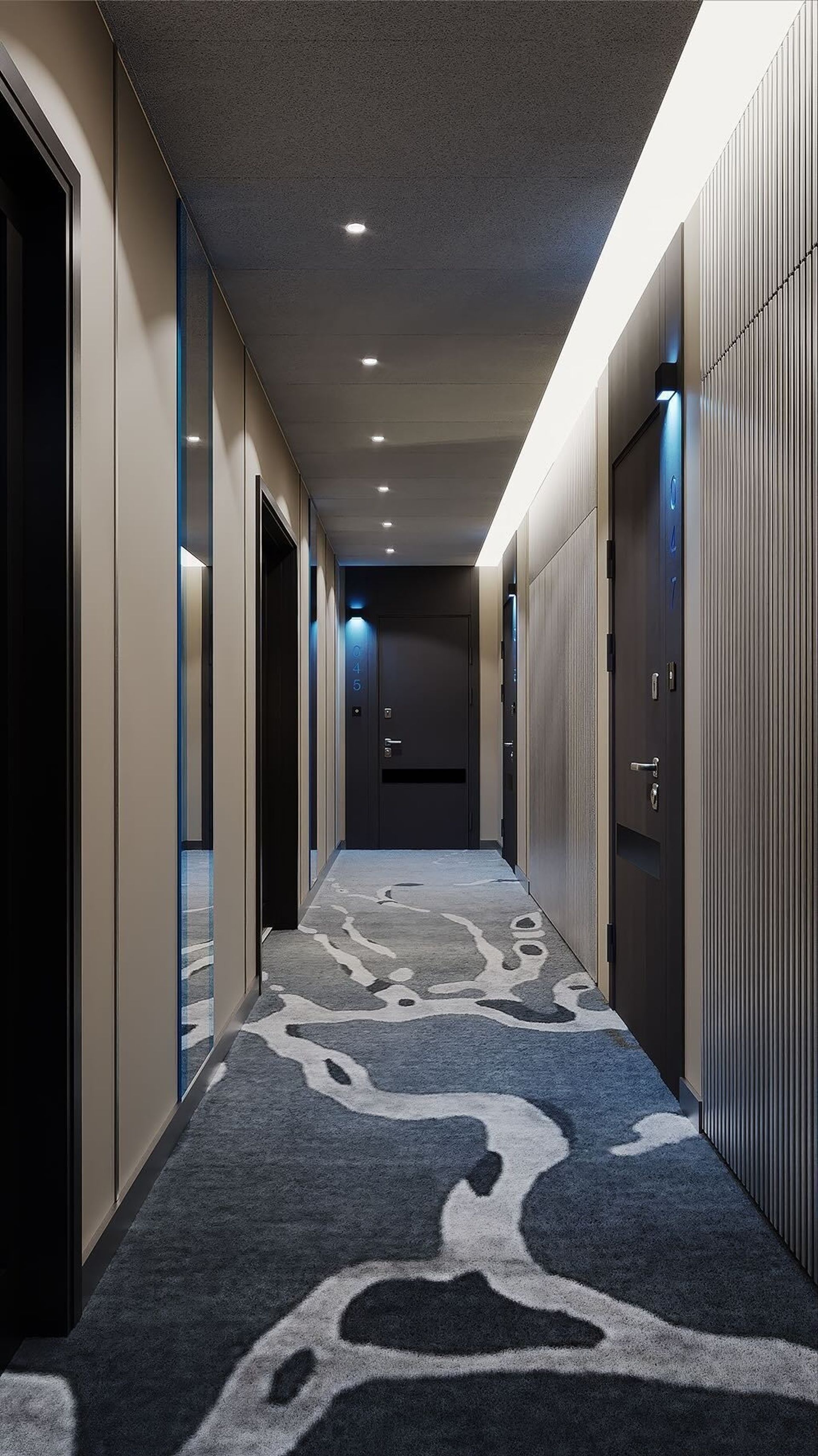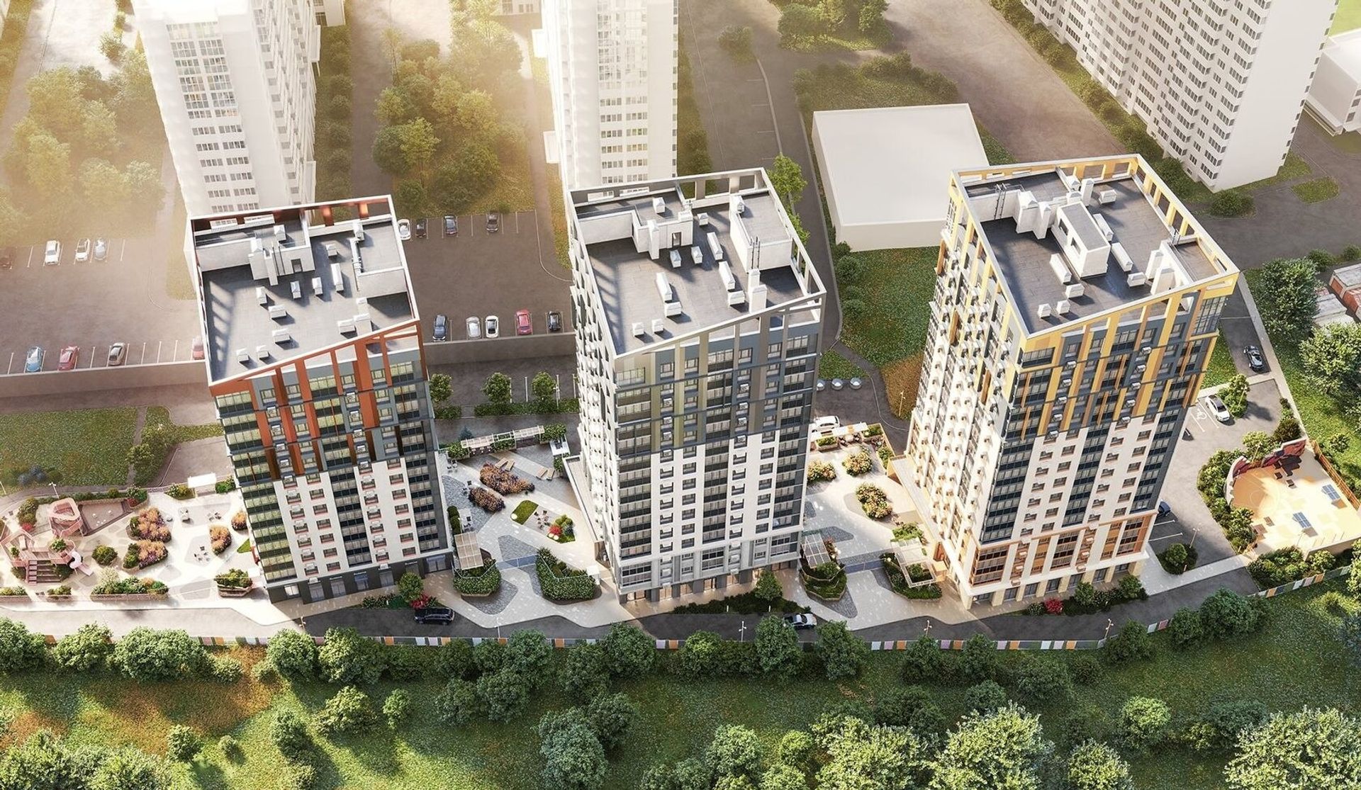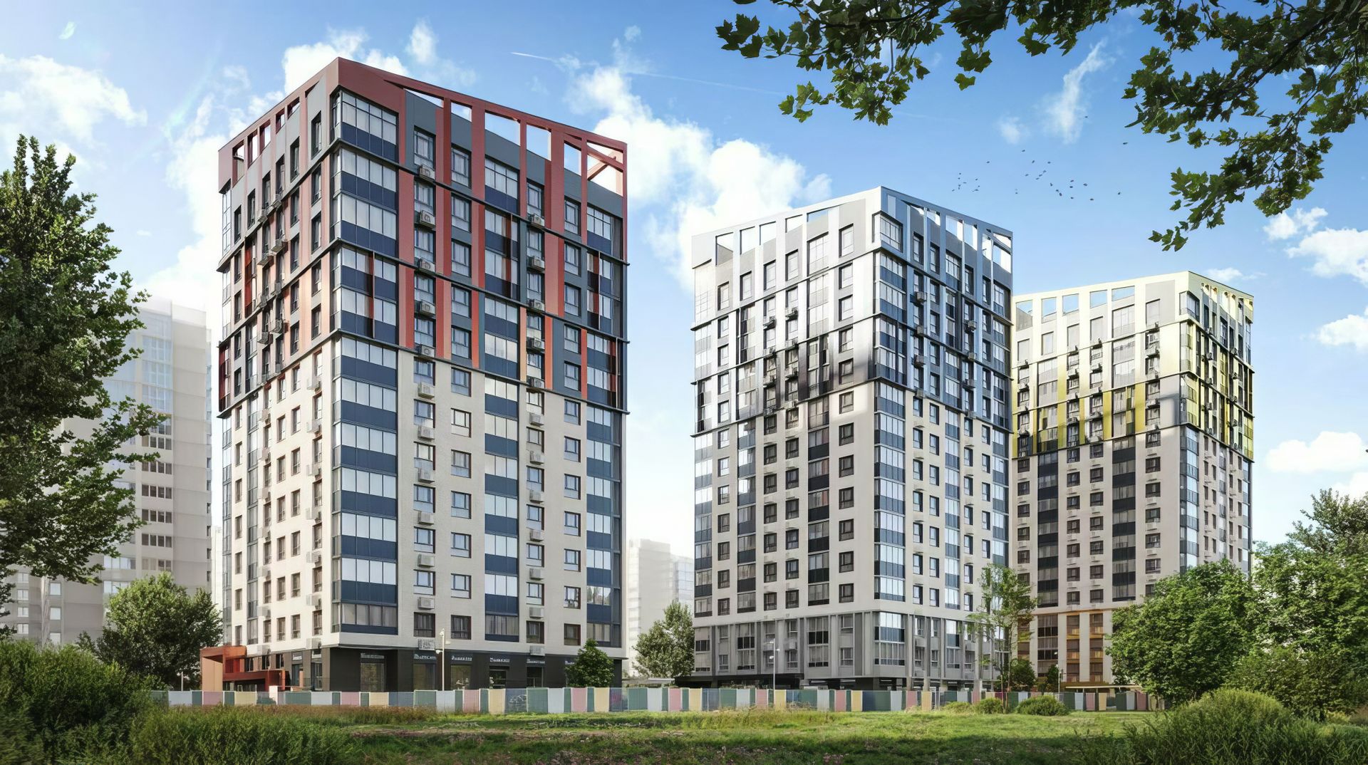 Отдельный акцент сделан на верхних уровнях: каждый корпус имеет характерное архитектурное обрамление. В одном случае это насыщенный красный, в другом — сдержанный серый, а в третьем — динамичный золотисто-жёлтый. Такие «короны» формируют индивидуальность каждого здания и одновременно объединяют их в единую композицию.