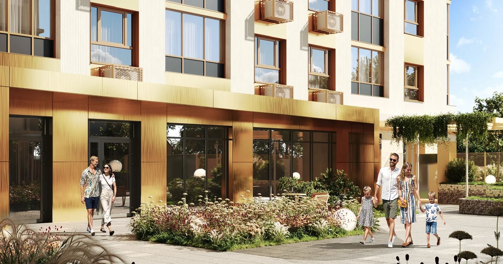 Витражные элементы и панорамные окна усиливают впечатление открытости и наполняют фасады светом. Чёткая геометрия линий, контрастные цветовые блоки и яркие верхние конструкции создают динамичный облик, который выделяет комплекс среди других домов и делает его узнаваемым.