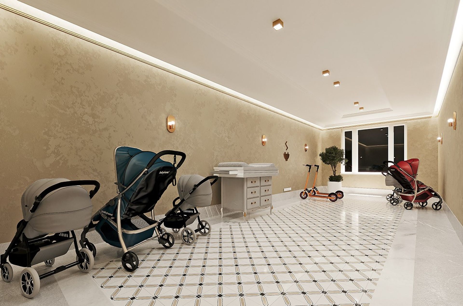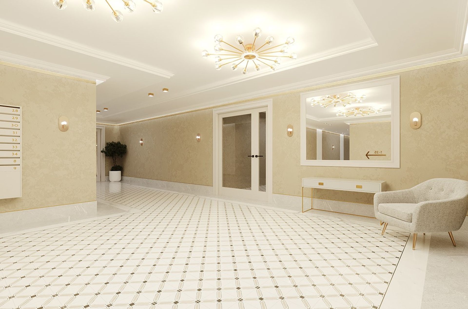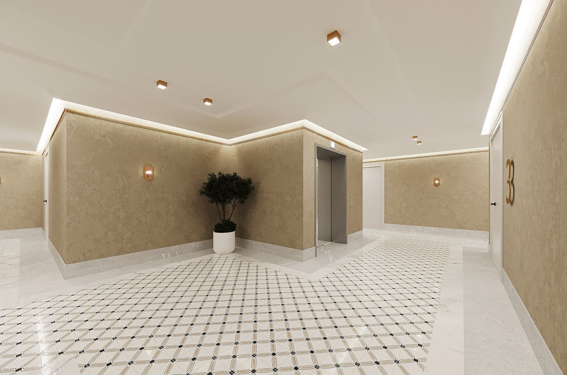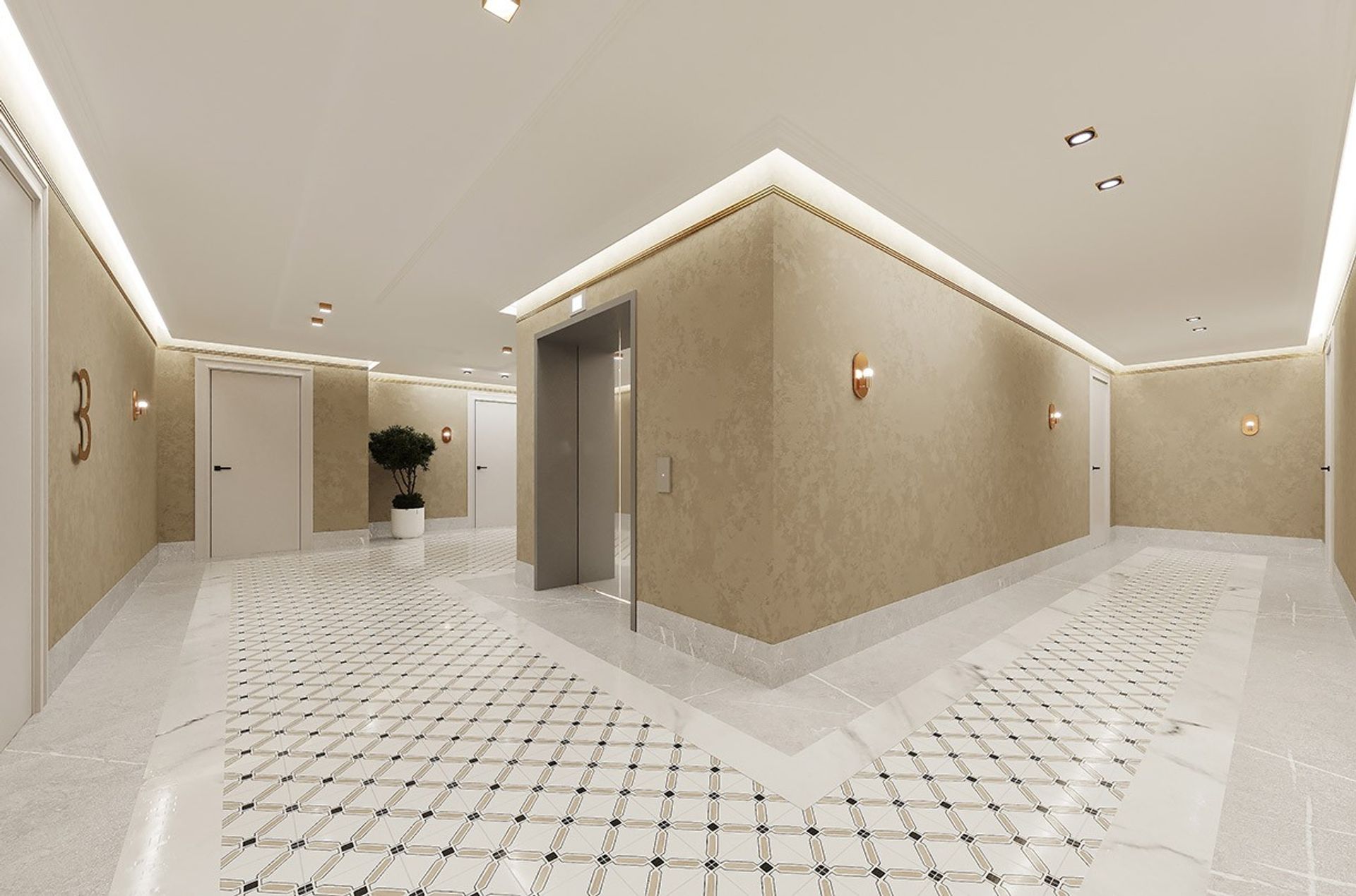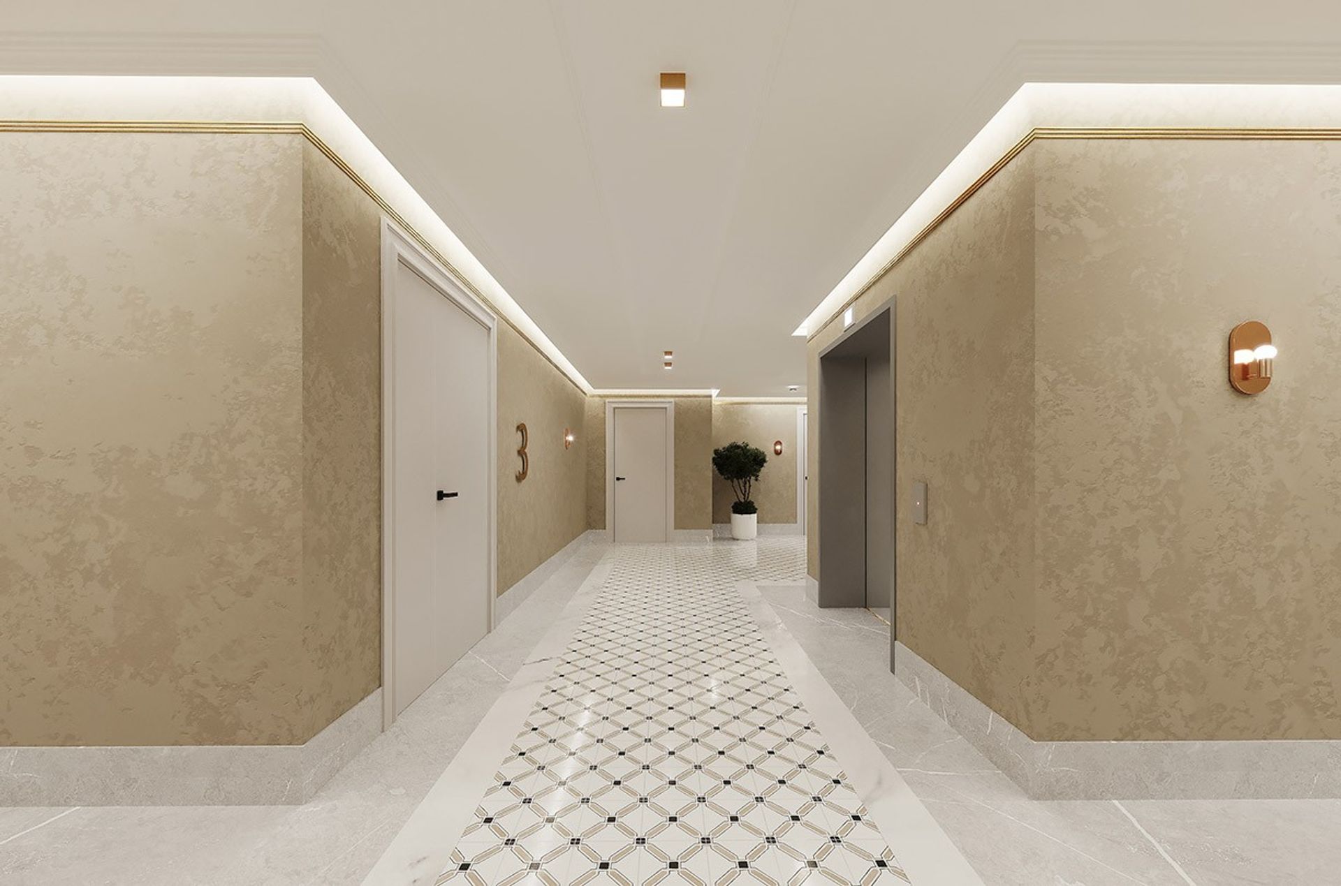 Холл воспринимается как камерное лобби: спокойная тёплая палитра, благородная фактура стен и тонкая «ювелирная» линия золотых акцентов по периметру потолка. Свет выстроен слоями, мягкая контурная подсветка и аккуратные споты дают ровное, «дорогое» освещение без резких теней.