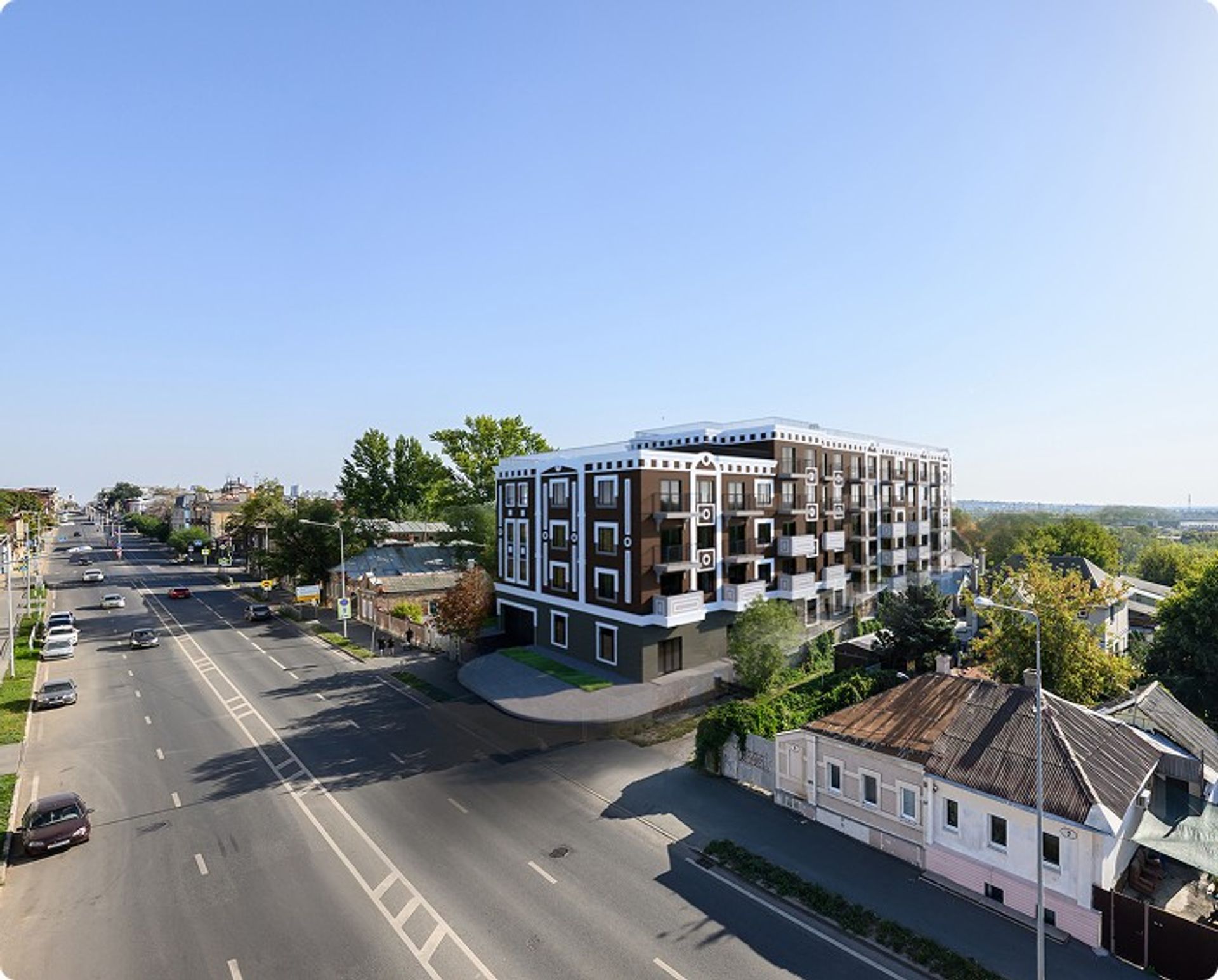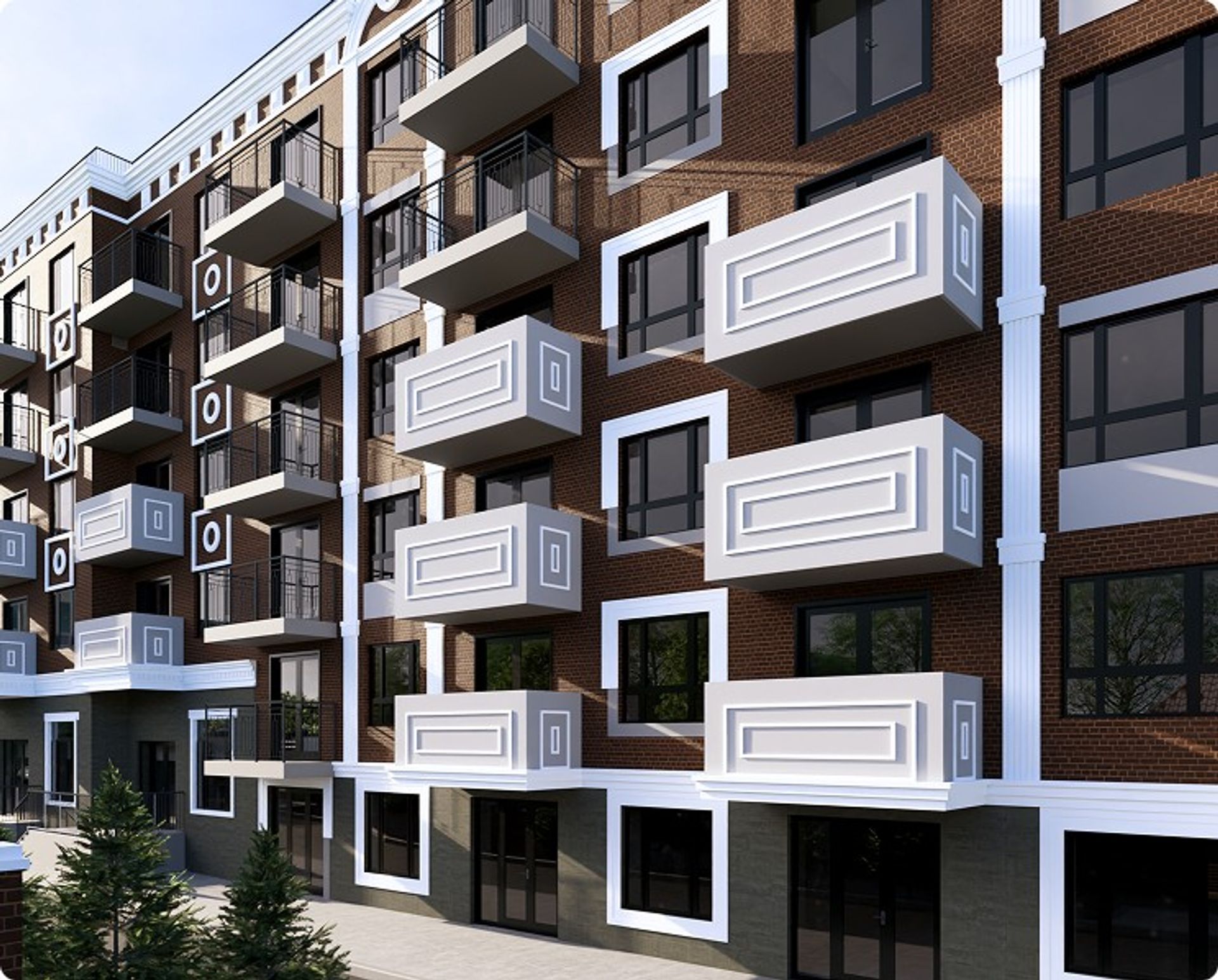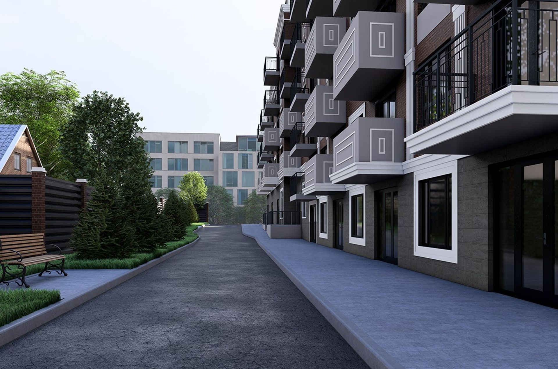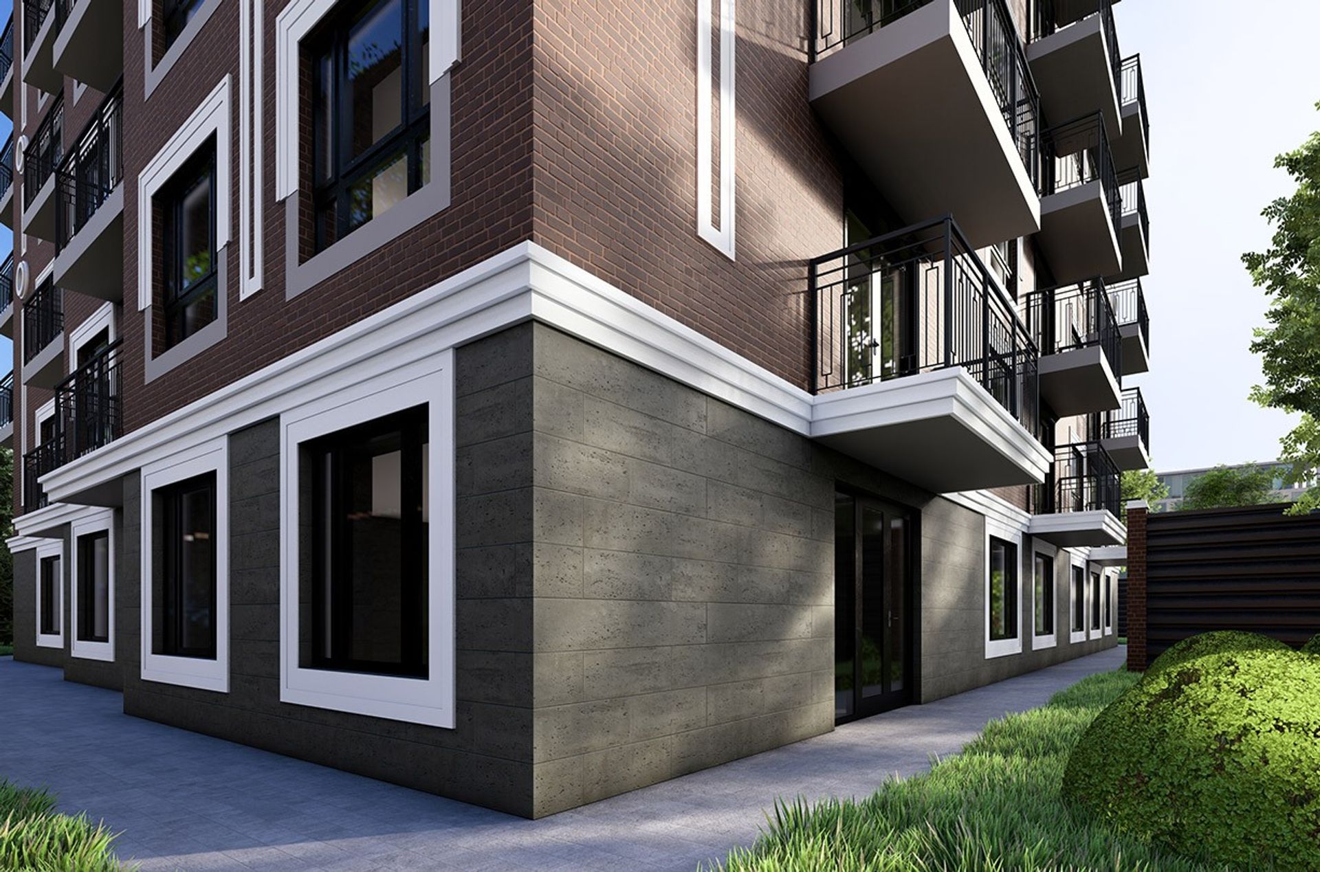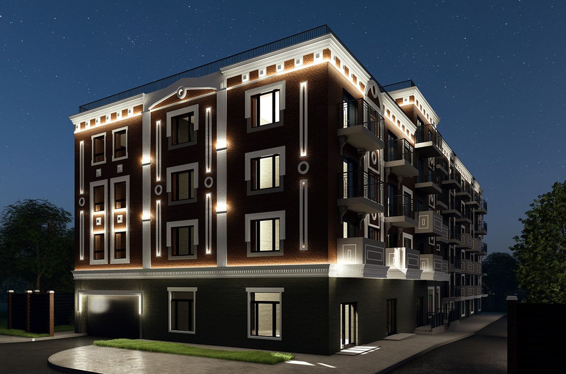 Нижний уровень выполнен в тёмном каменном тоне, как солидная база. Балконы с чёрными ограждениями добавляют графичности, а архитектурная подсветка вечером аккуратно выделяет линии и детали.