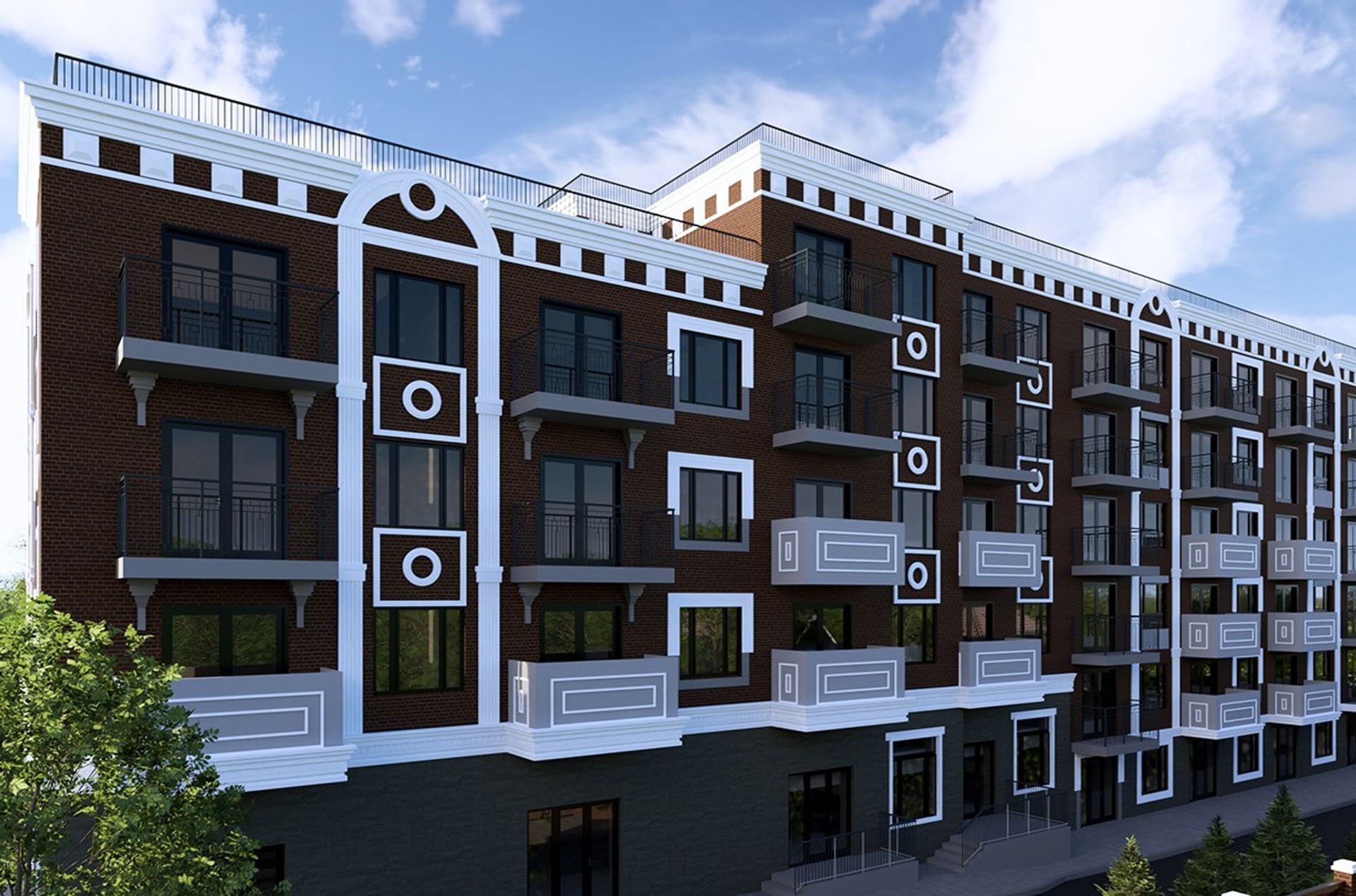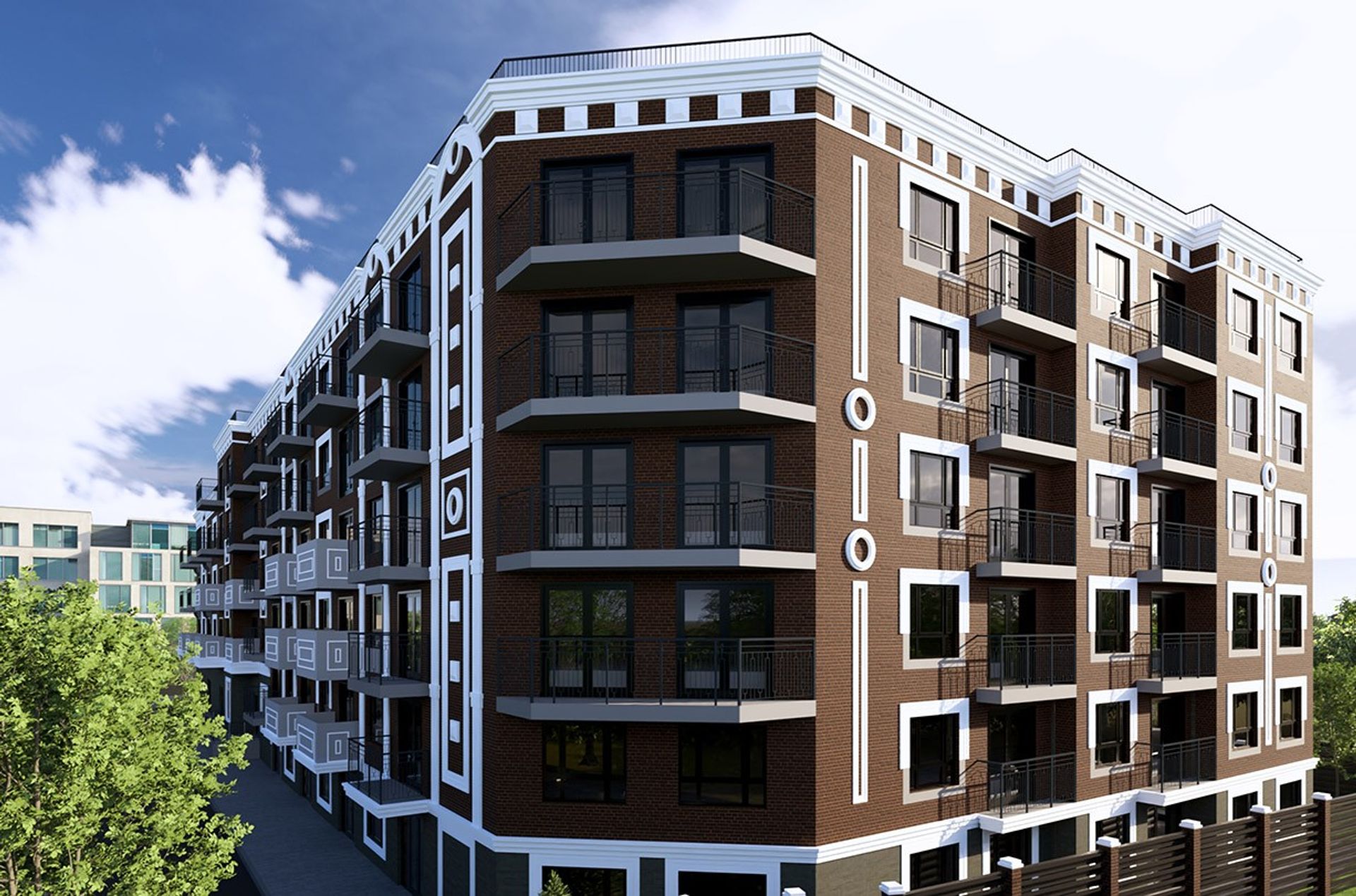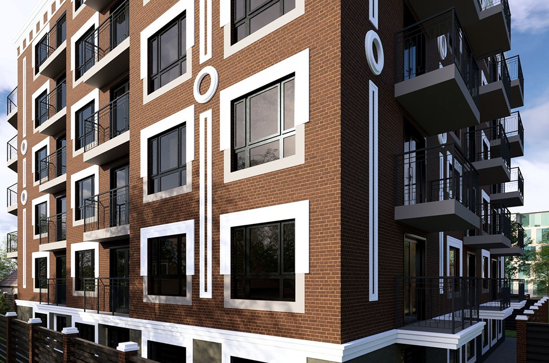 Фасады собраны в классическую, «городскую» композицию: тёмный кирпич держит объём, белые обрамления и декоративные вставки задают ритм и глубину, а выразительный карниз подчёркивает силуэт дома.