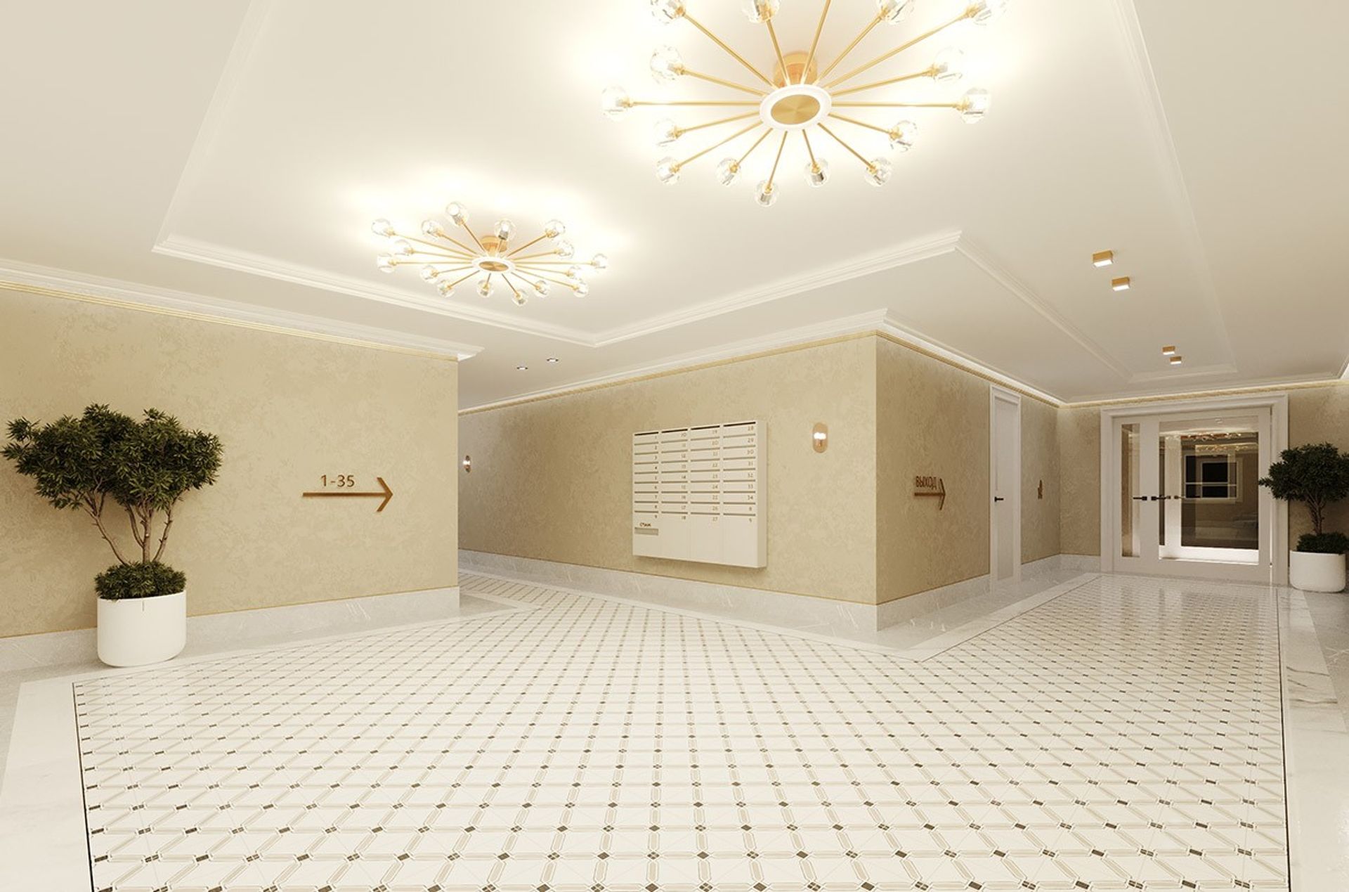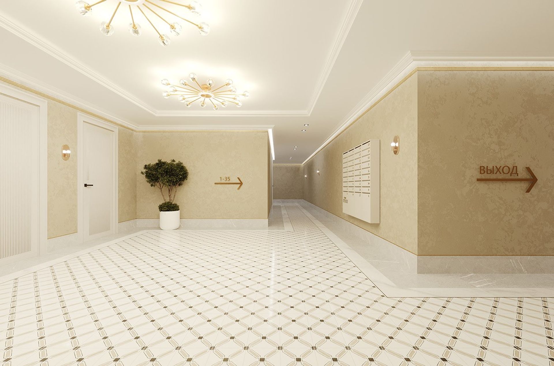 Пол собран на контрасте материалов: светлый камень по контуру и декоративная плитка в центре задают рисунок движения и визуально держат пространство. У лифтов чистая геометрия, лаконичные двери и ощущение порядка.