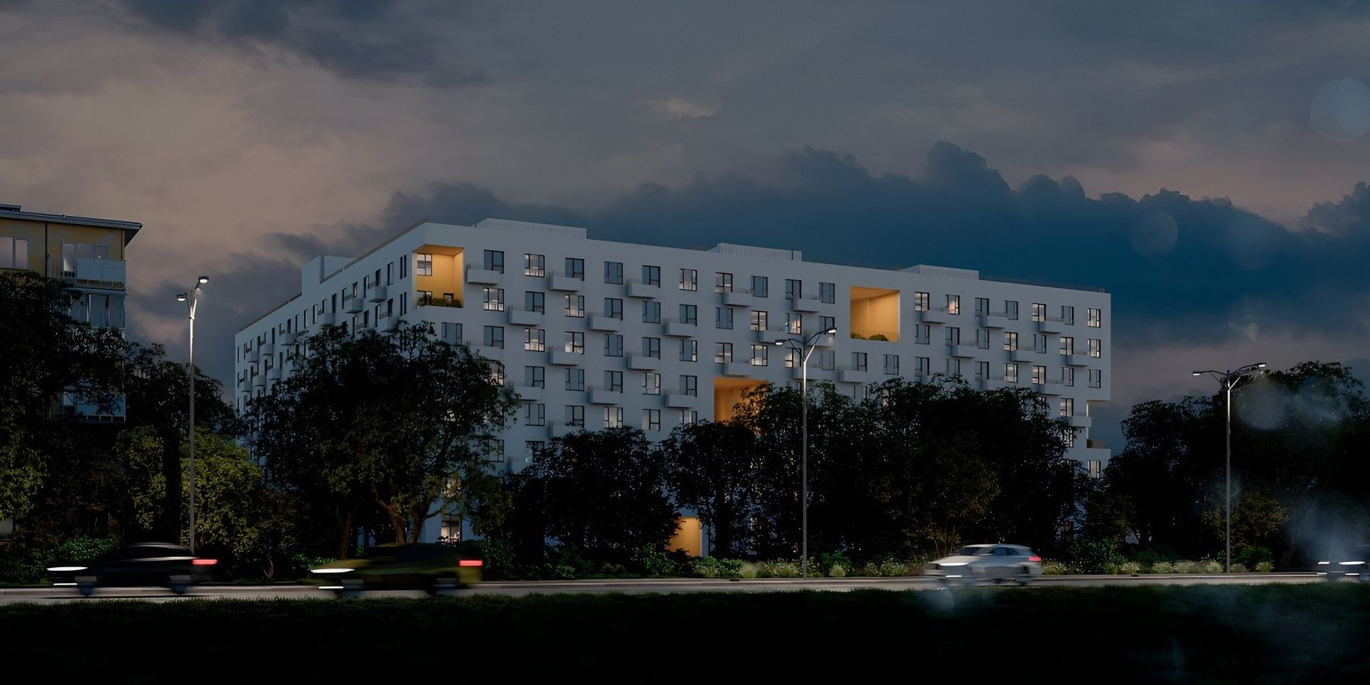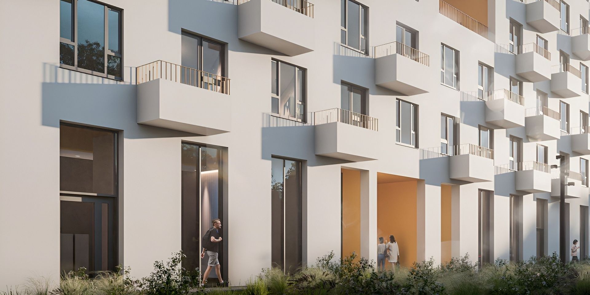 - Коммерческие помещения на первых этажах обращены к улицам. Первый этаж визуально легче за счёт увеличенного остекления и входных групп,