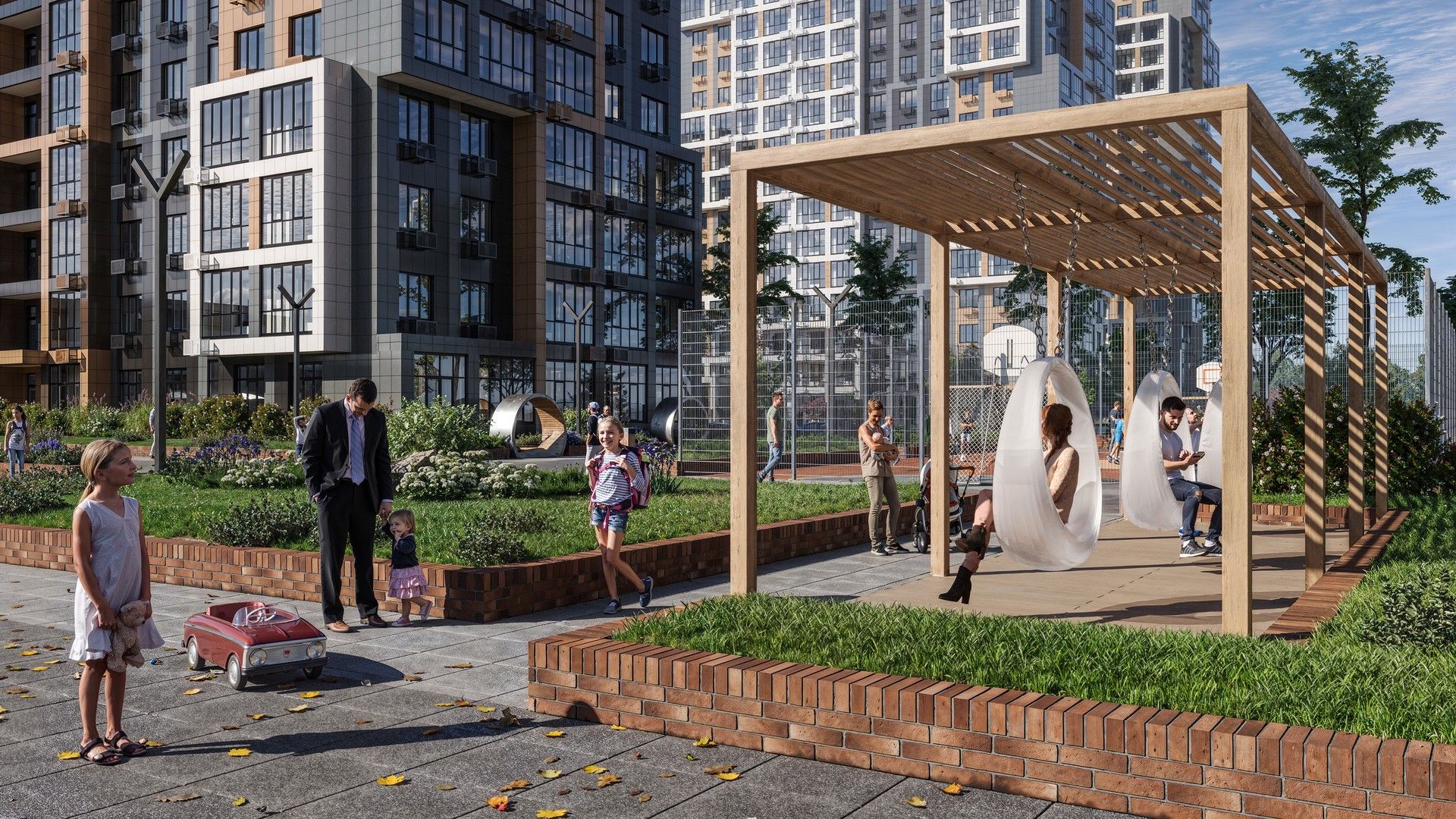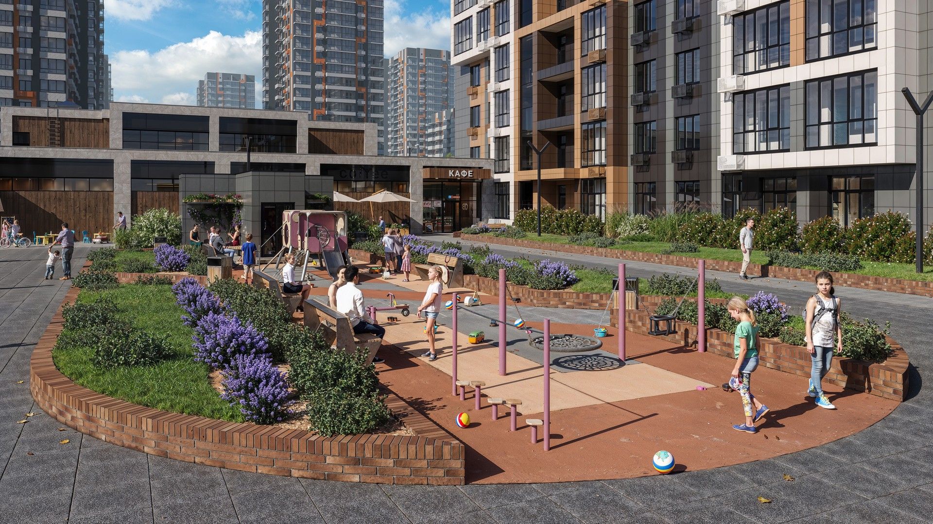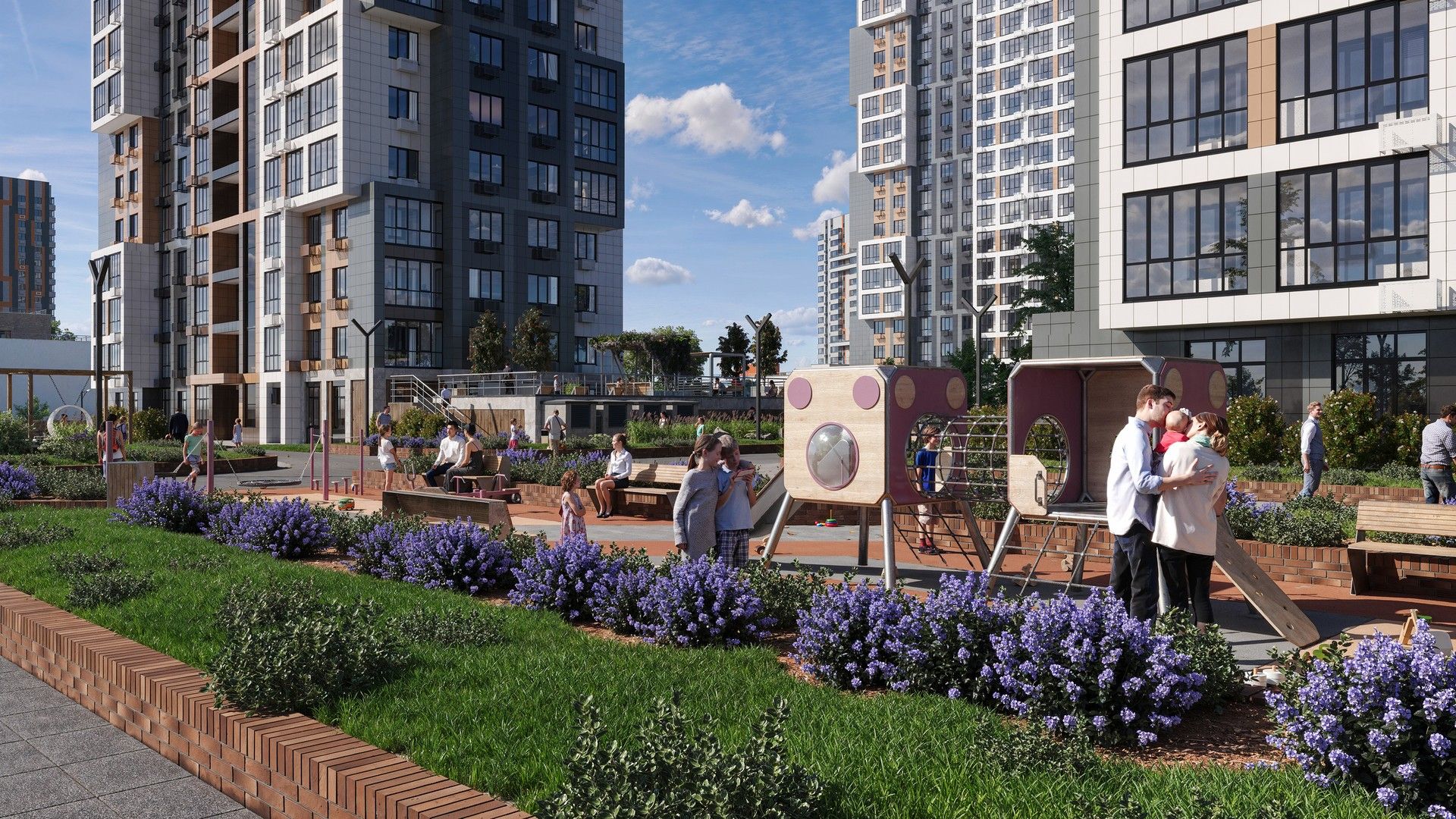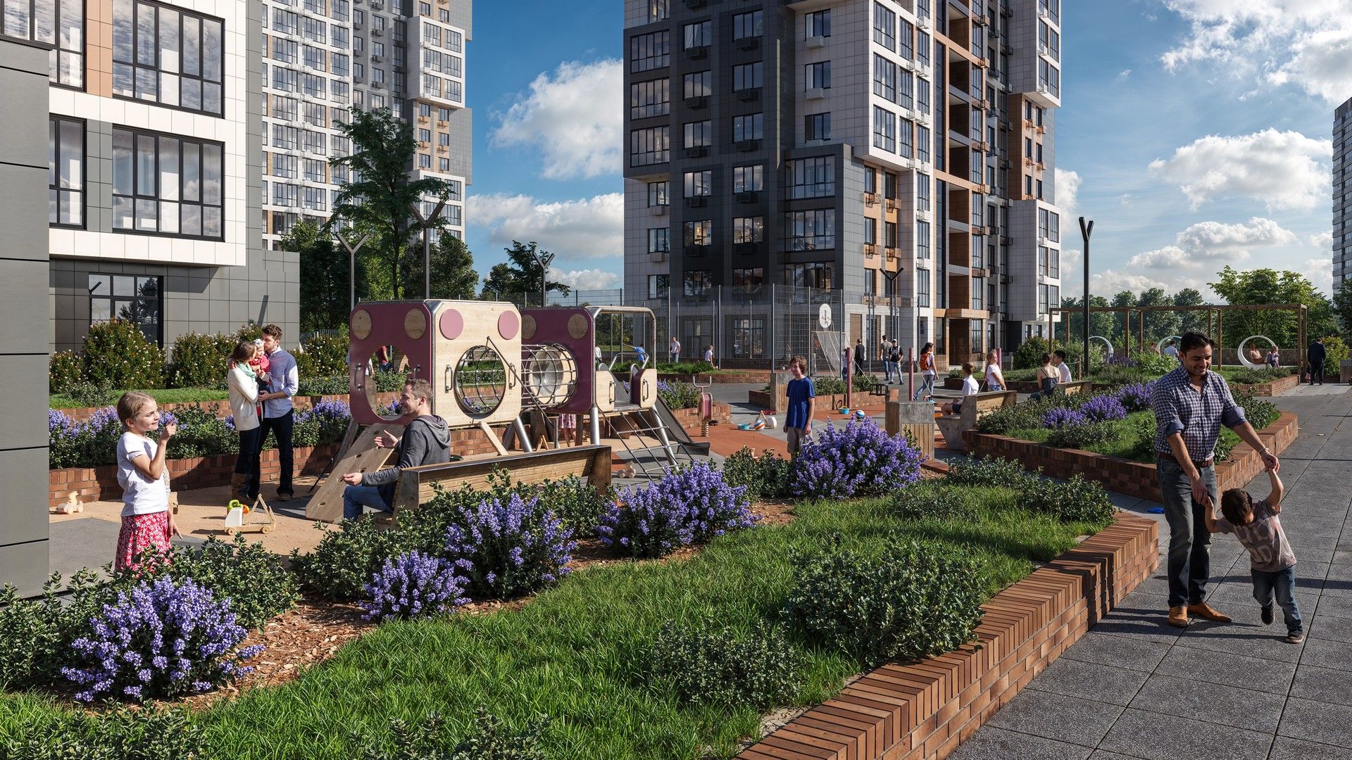 Для детей предусмотрены оборудованные игровые площадки, также есть воркаут зона для любителей физической активности. На территории жилого квартала есть собственный детский сад и школа.