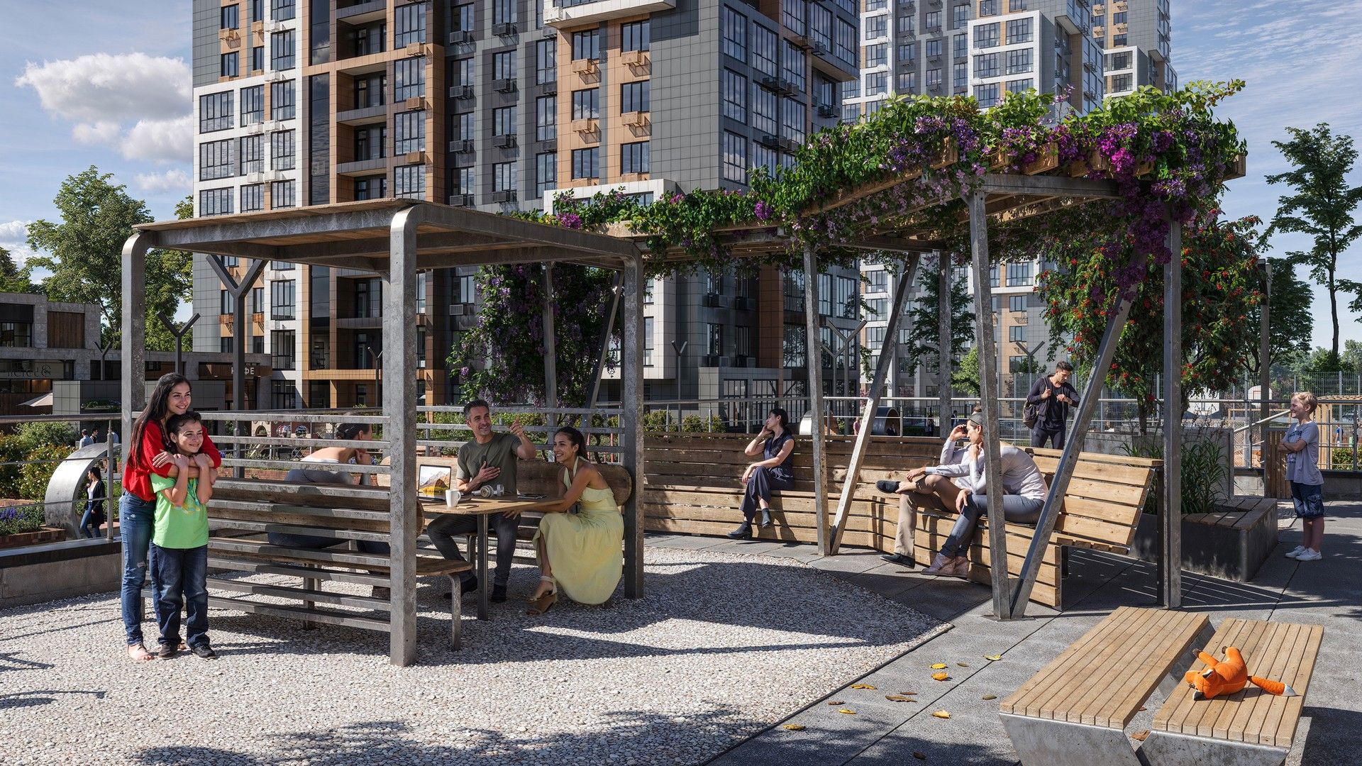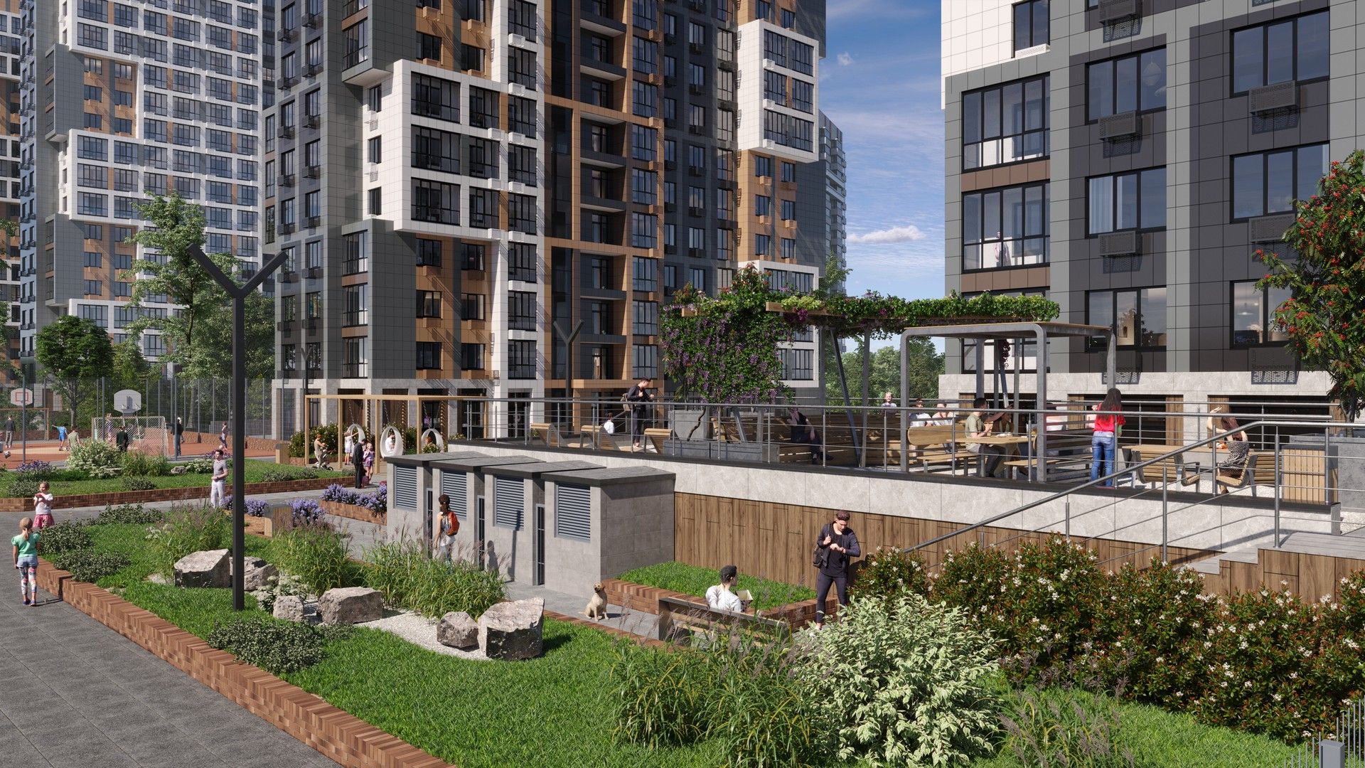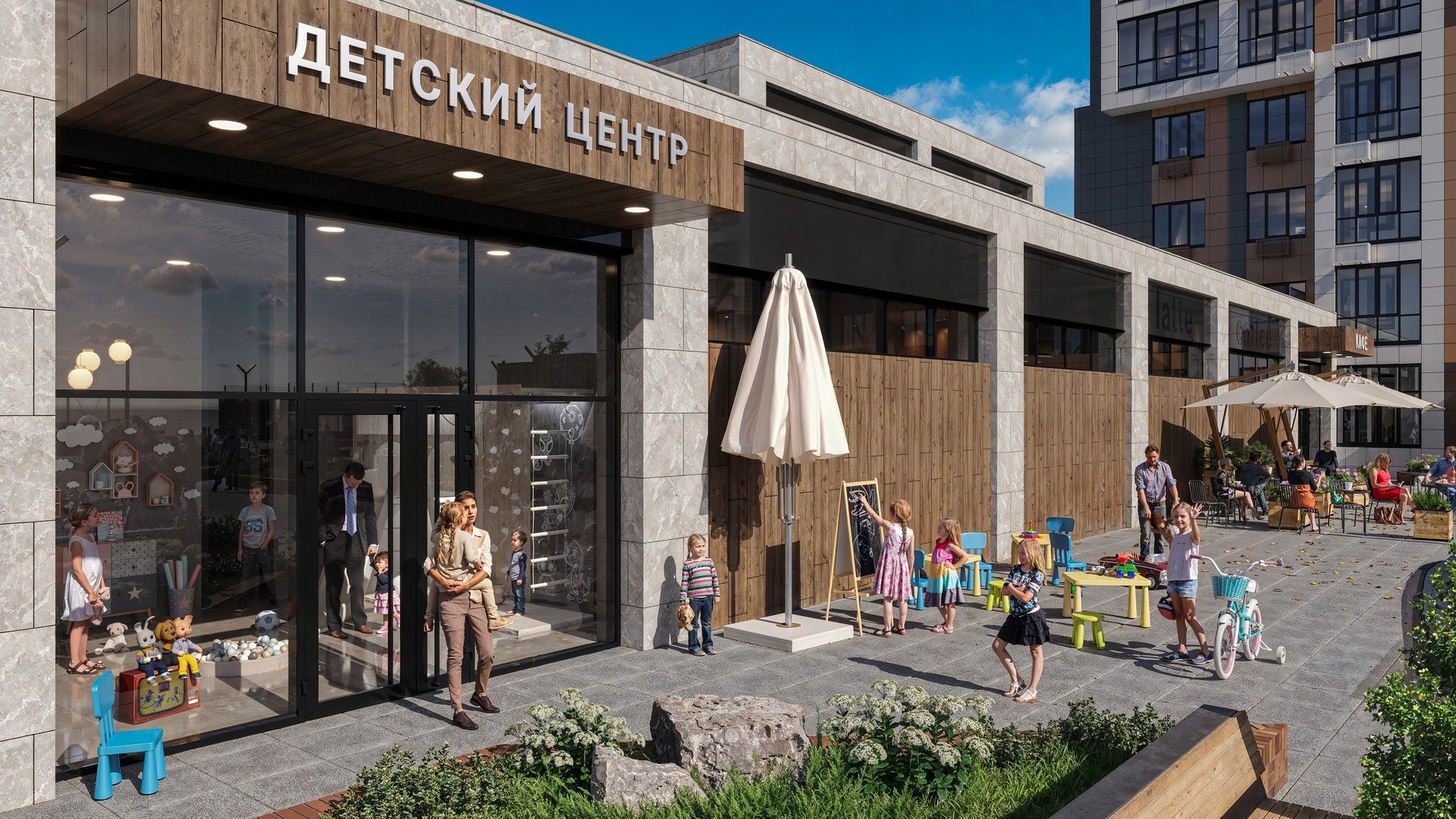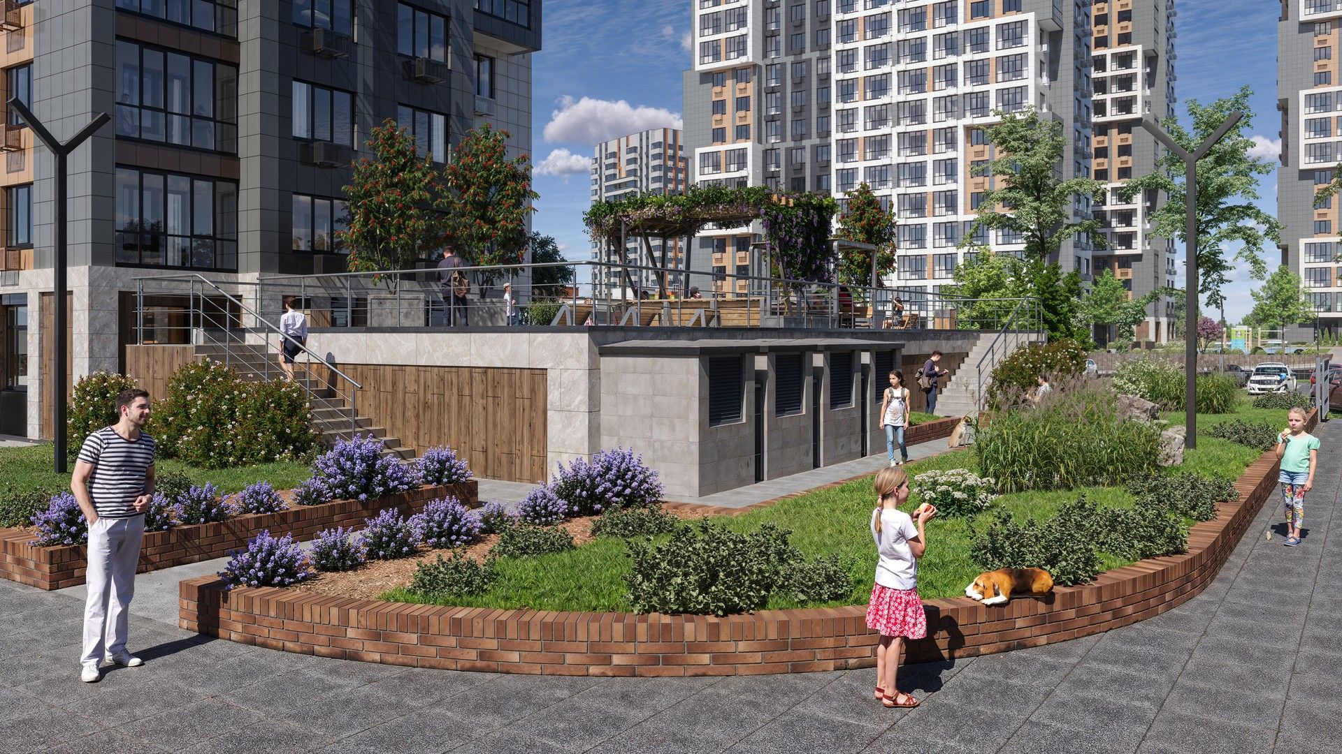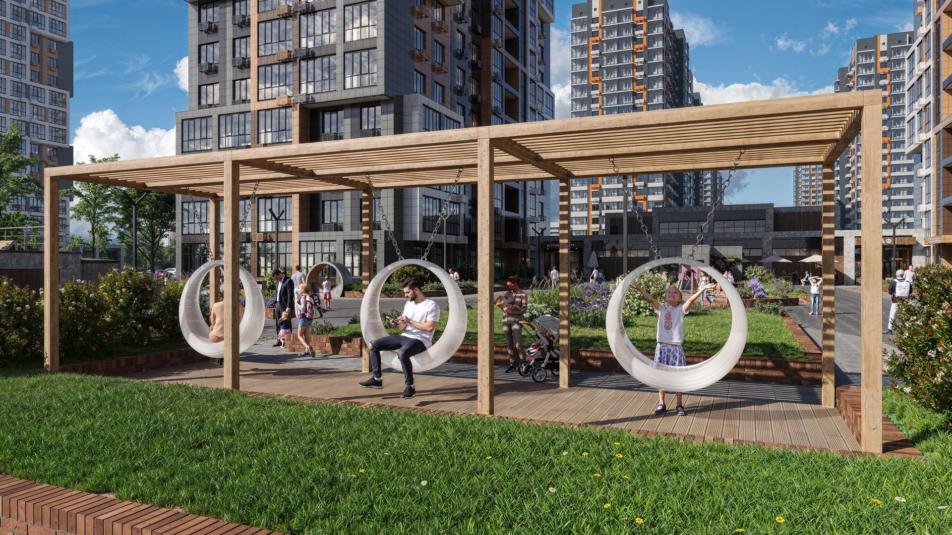 Для детей предусмотрены оборудованные игровые площадки, также есть воркаут зона для любителей физической активности. На территории жилого квартала есть собственный детский сад и школа.