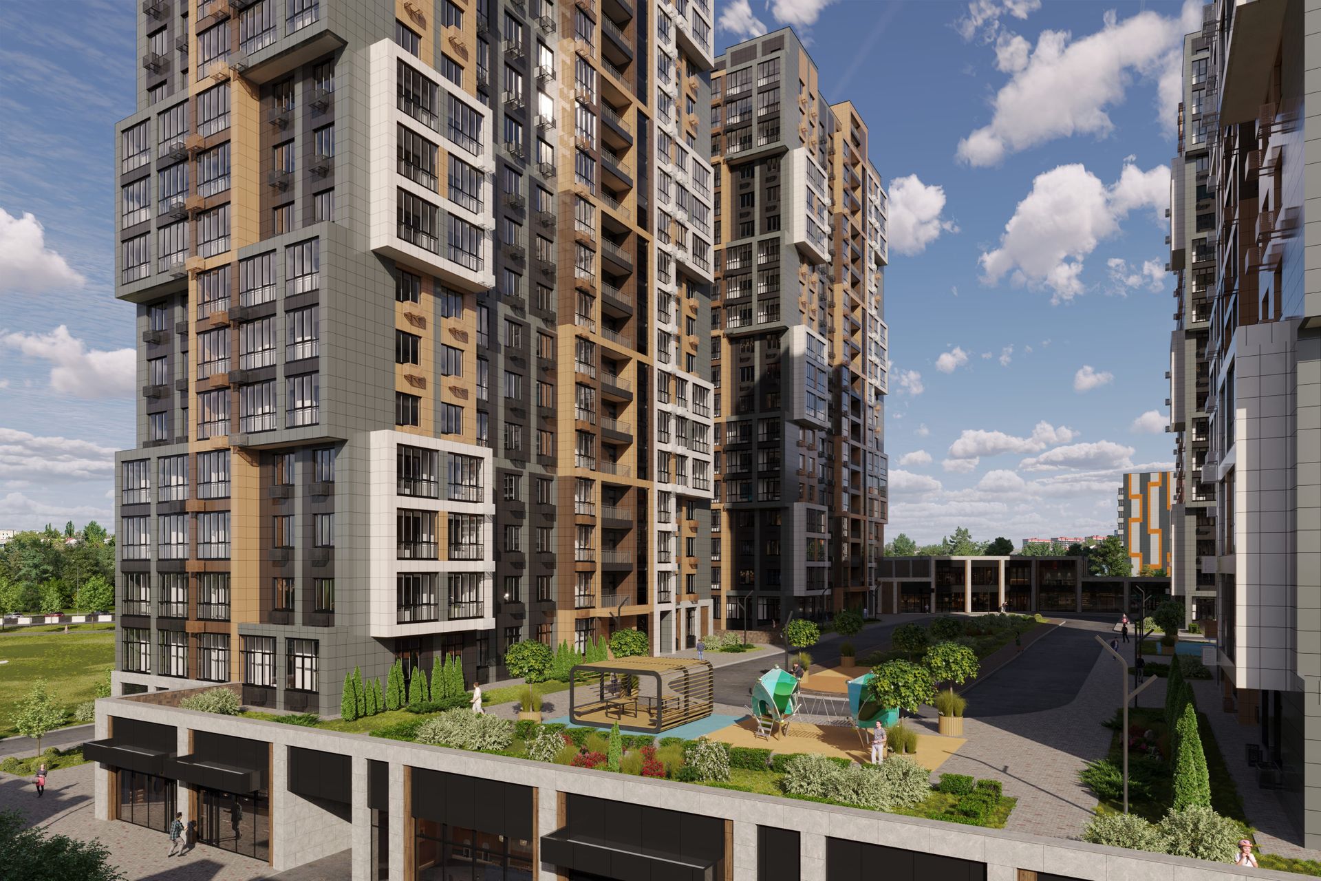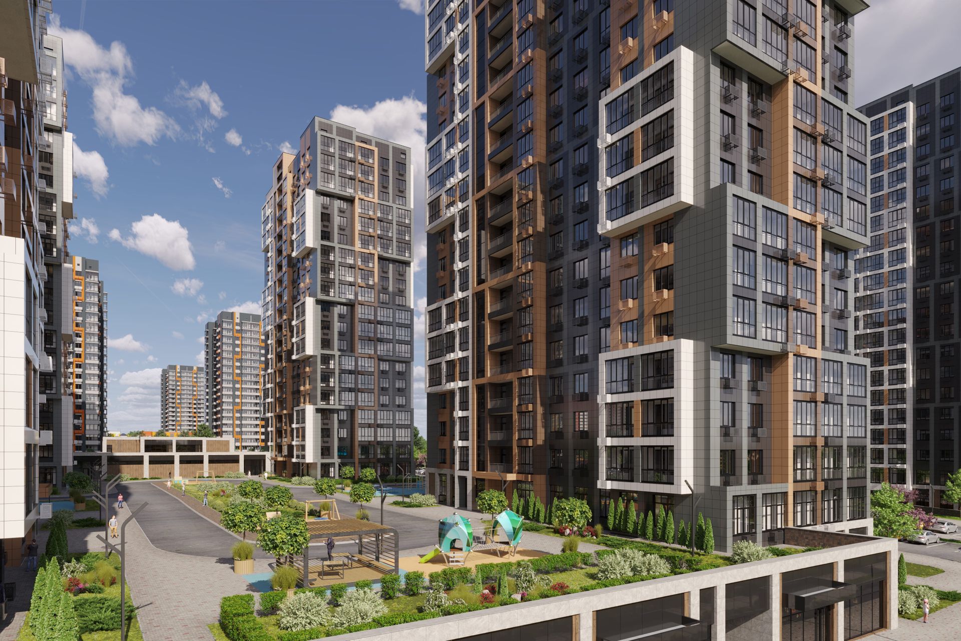 ЖК «Притяжение» - это полностью благоустроенная территория, где все пространство продумано до мелочей. Спроектировано комплексное озеленение, установлены малые архитектурные формы, облагорожены зоны отдыха для детей и взрослых. Зеленые газоны, деревья, кустарники и цветники будут создавать уютную атмосферу во дворе.