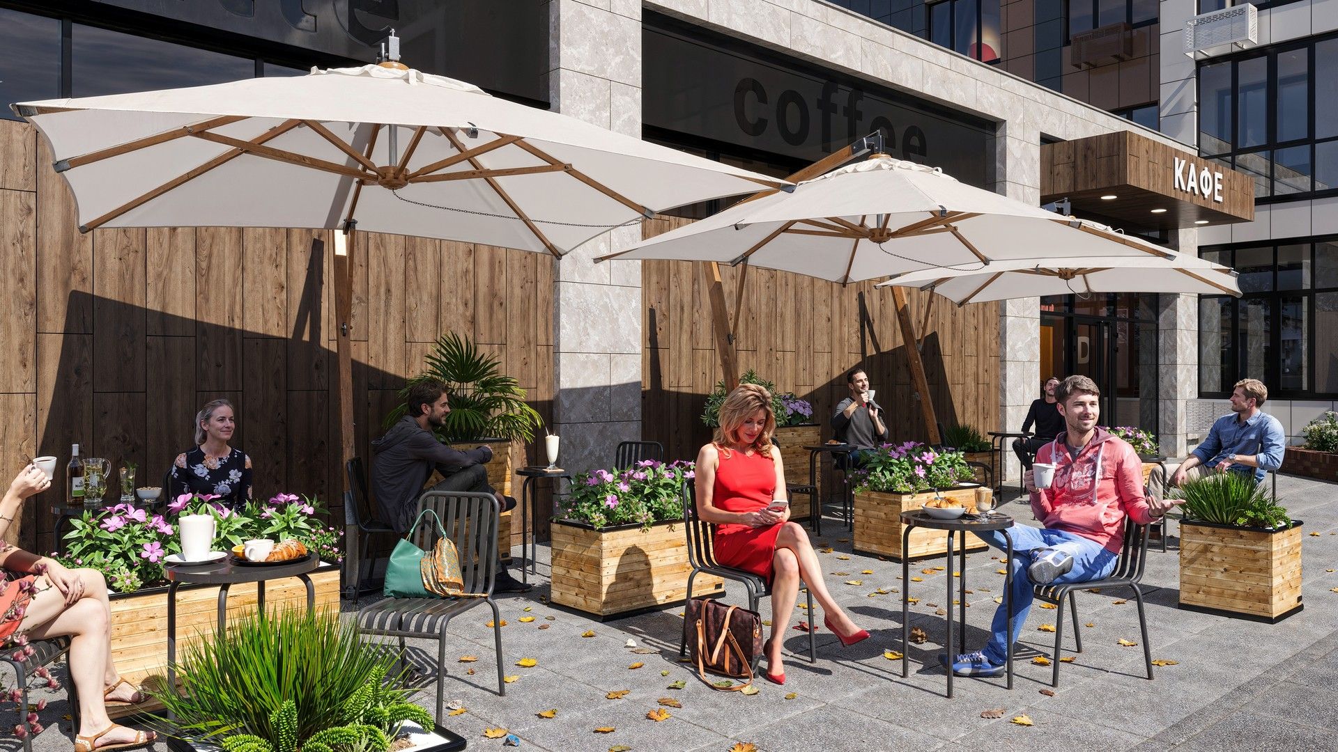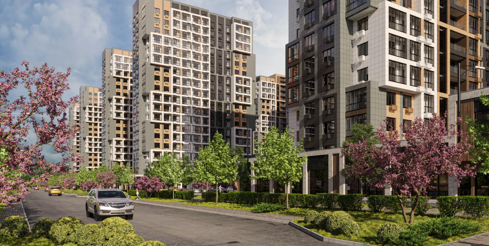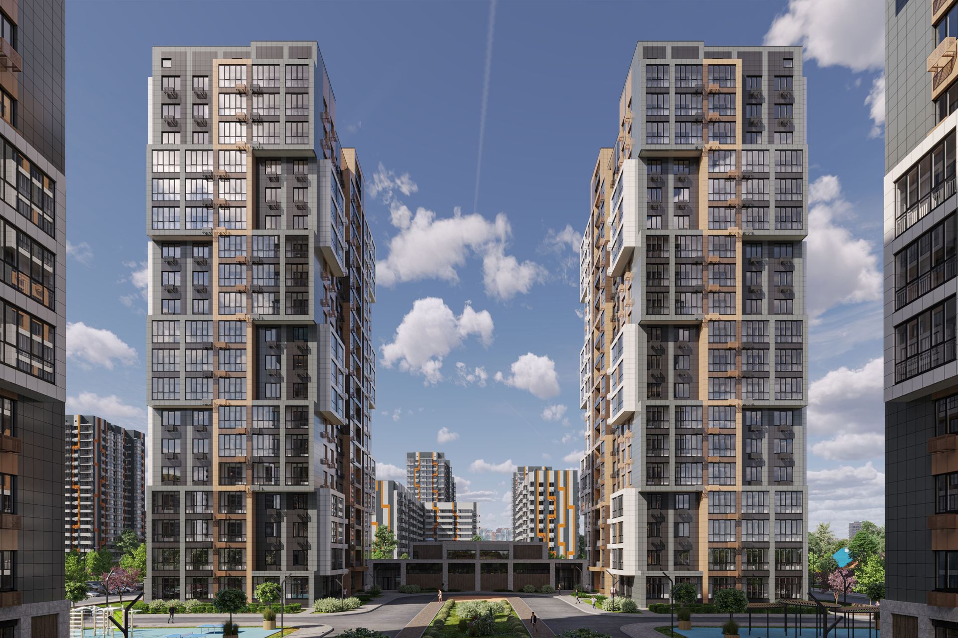 Навесные вентилируемые фасады из керамогранита с утеплителем из минераловатной плиты. Фасады домов выполнены в стильном современном дизайне с эффектным сочетанием коричневого, серого цветов и цвета «слоновая кость». Окна в квартирах с внешней стороны тонированы под цвет фасада, а для того чтобы сохранить архитектурный облик зданий используются корзины для кондиционеров. В вечернее время на фасадах включается стильная подсветка, которая понравится даже искушенным жителям.