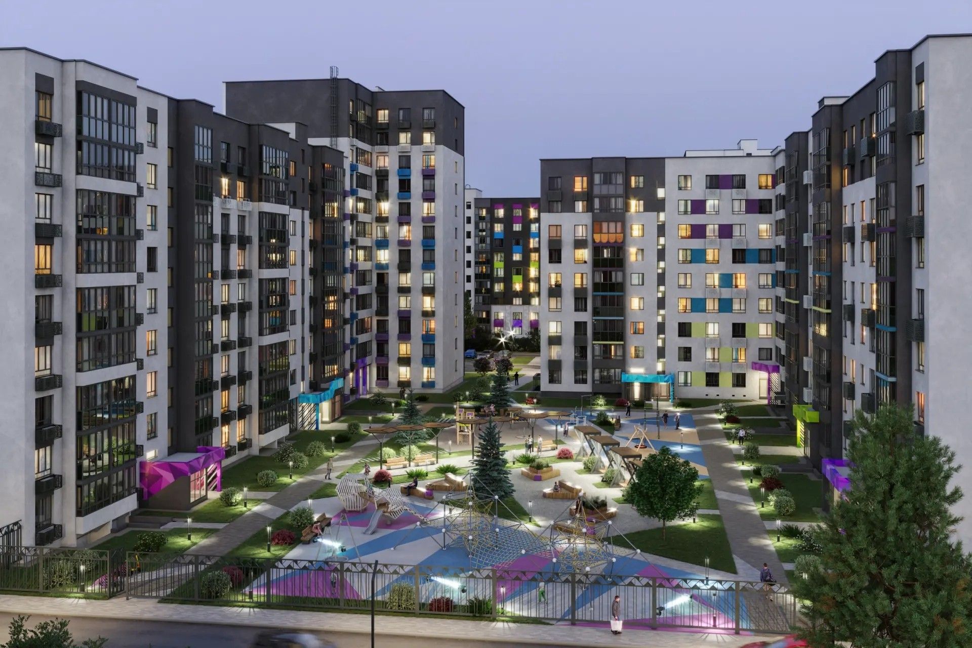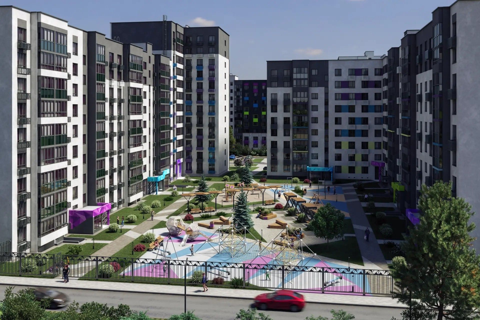 - Двор без машин — парковка вынесена за пределы территории, пешеходы и транспорт не пересекаются.