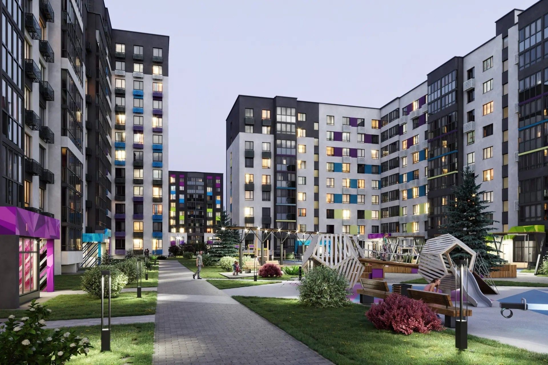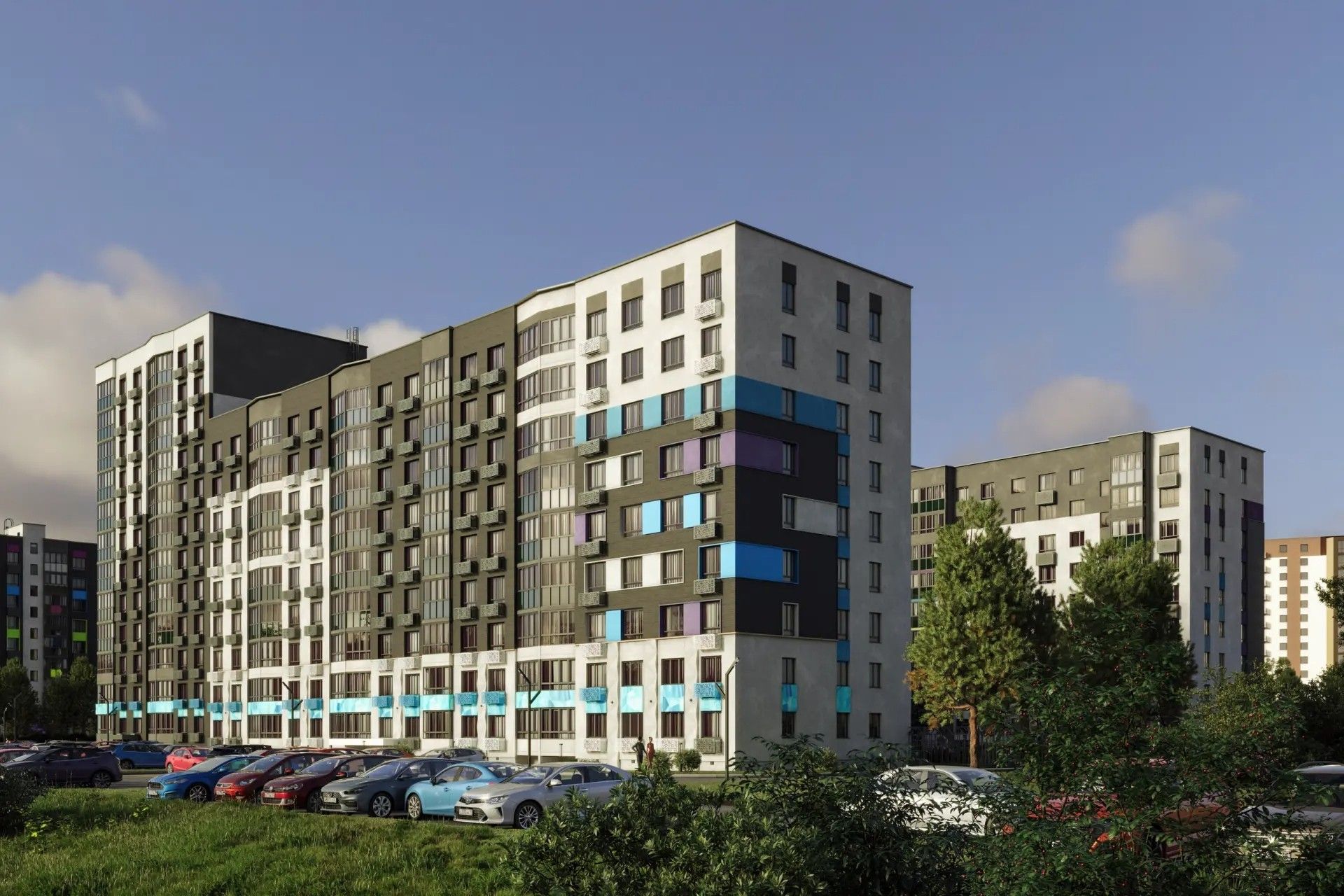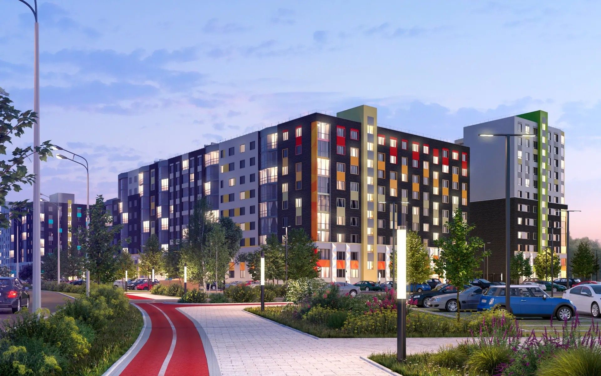 Визуальный акцент — игра цветов и фактур: яркие акценты уравновешены сдержанными оттенками, а современные формы делают облик домов узнаваемым.