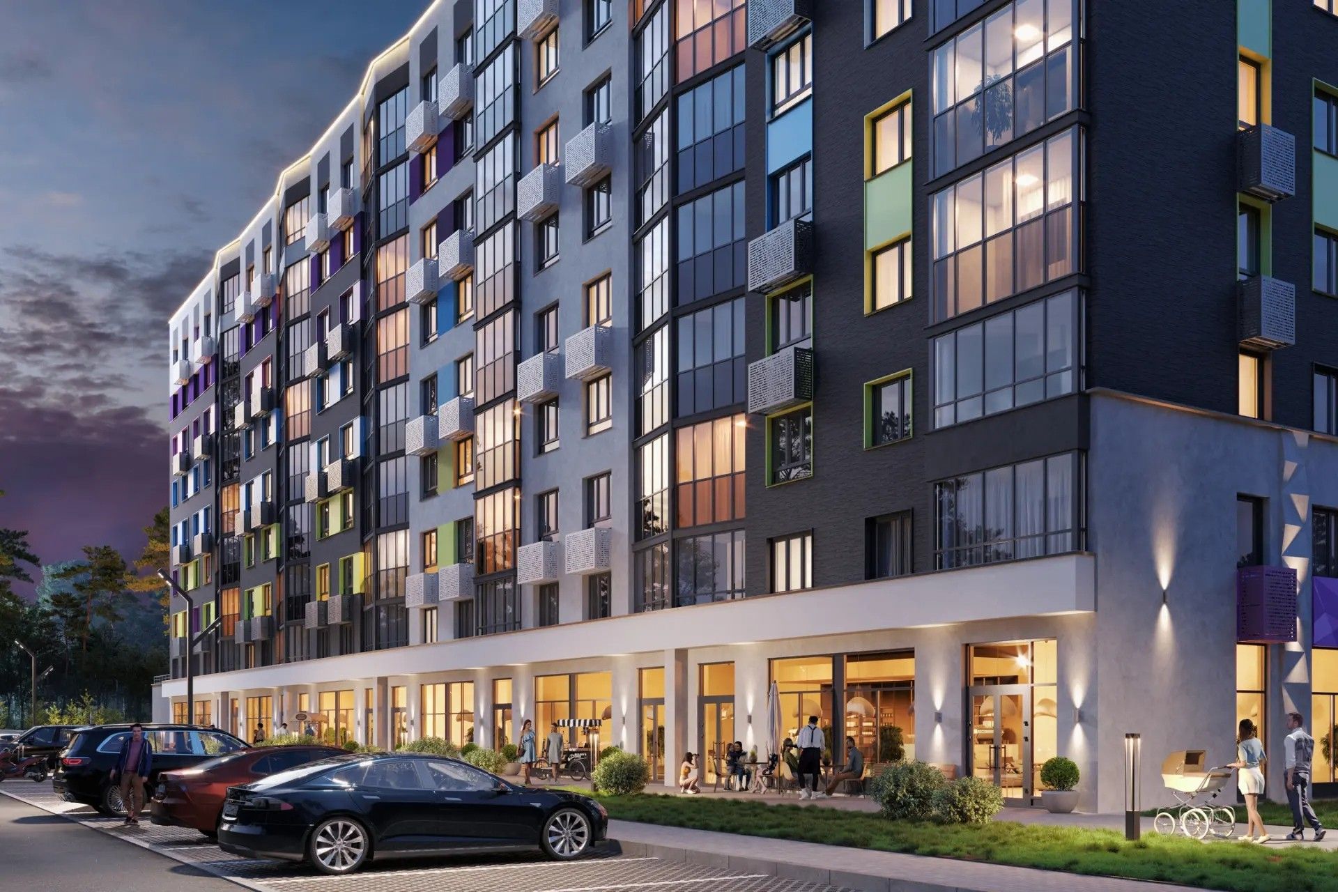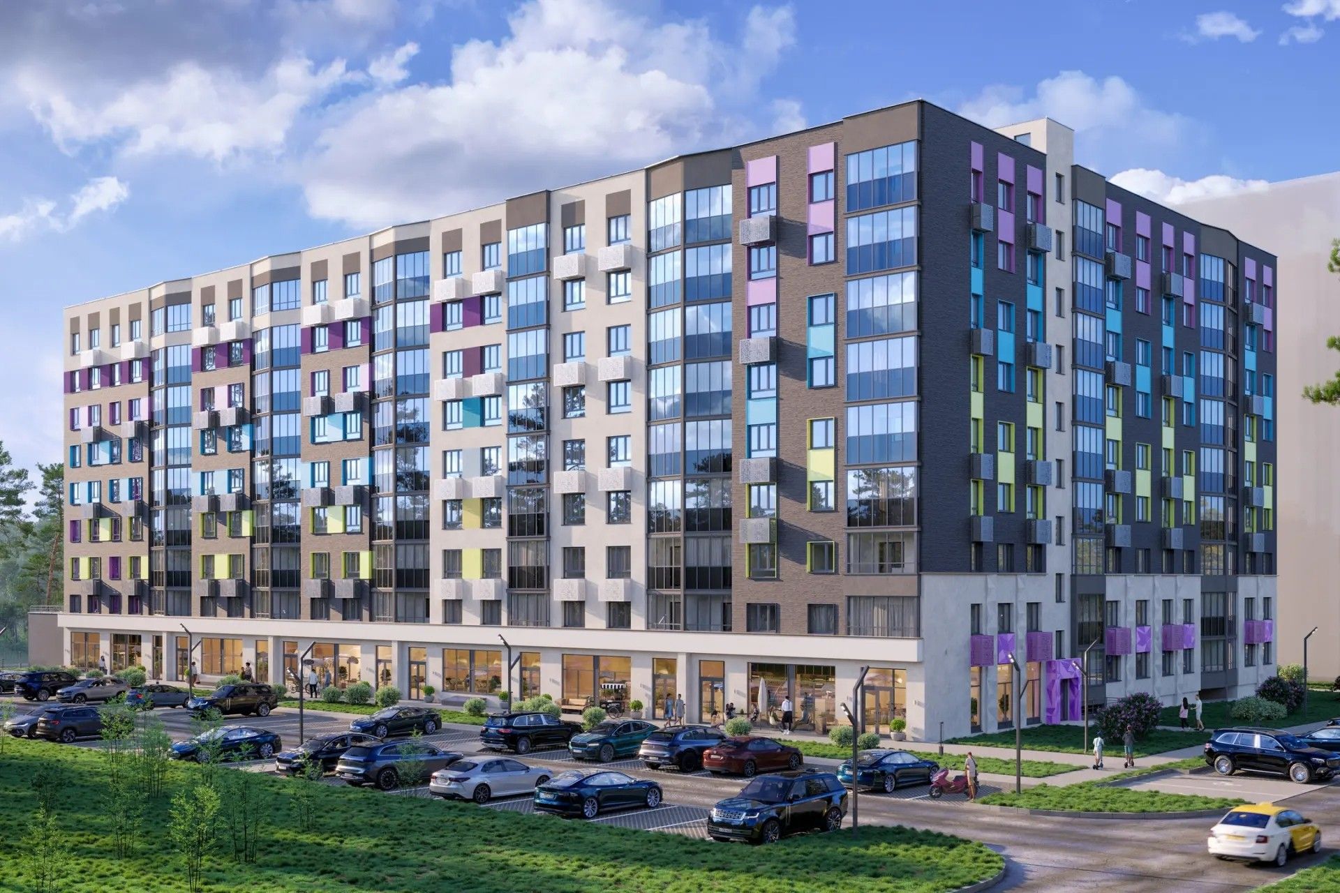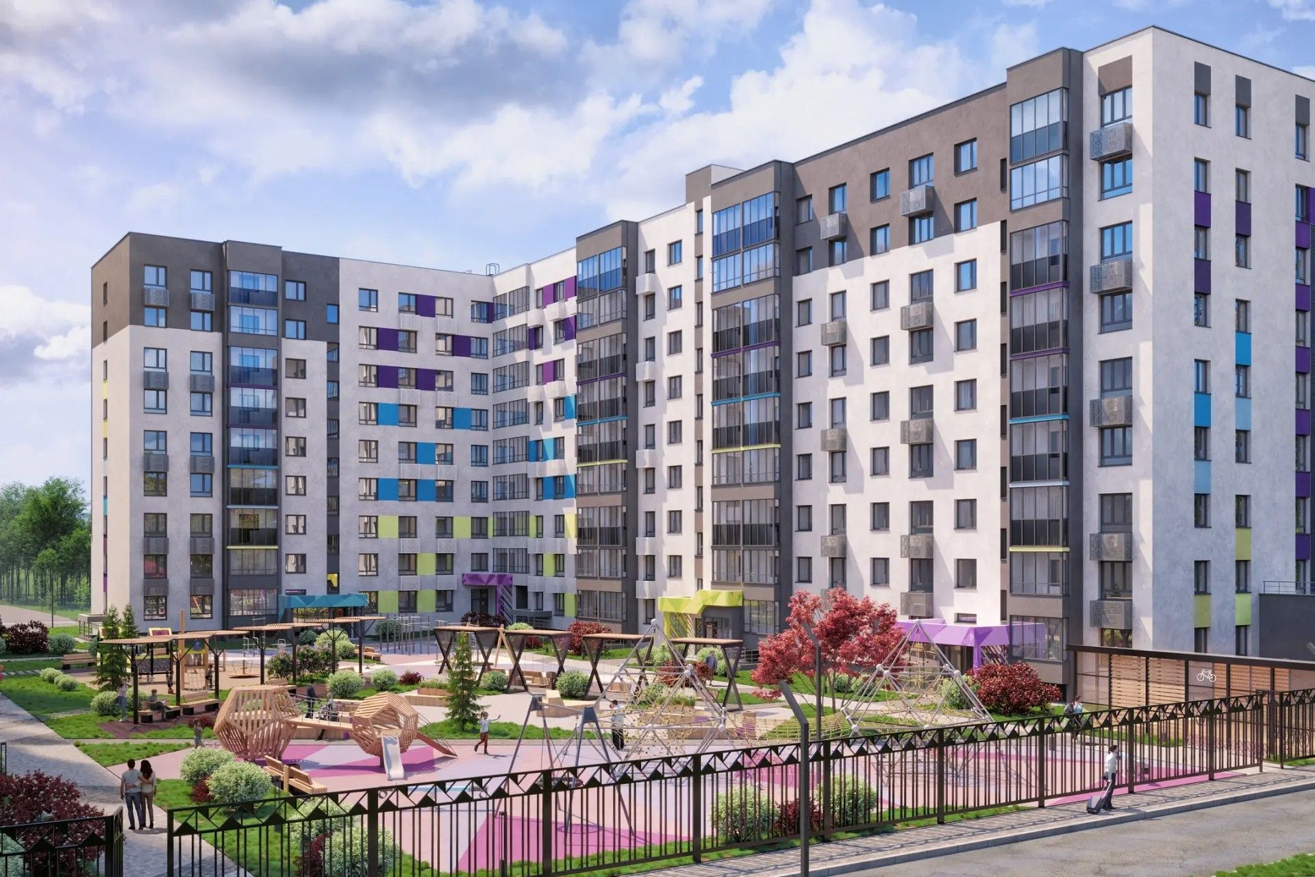 Визуальный акцент — игра цветов и фактур: яркие акценты уравновешены сдержанными оттенками, а современные формы делают облик домов узнаваемым.