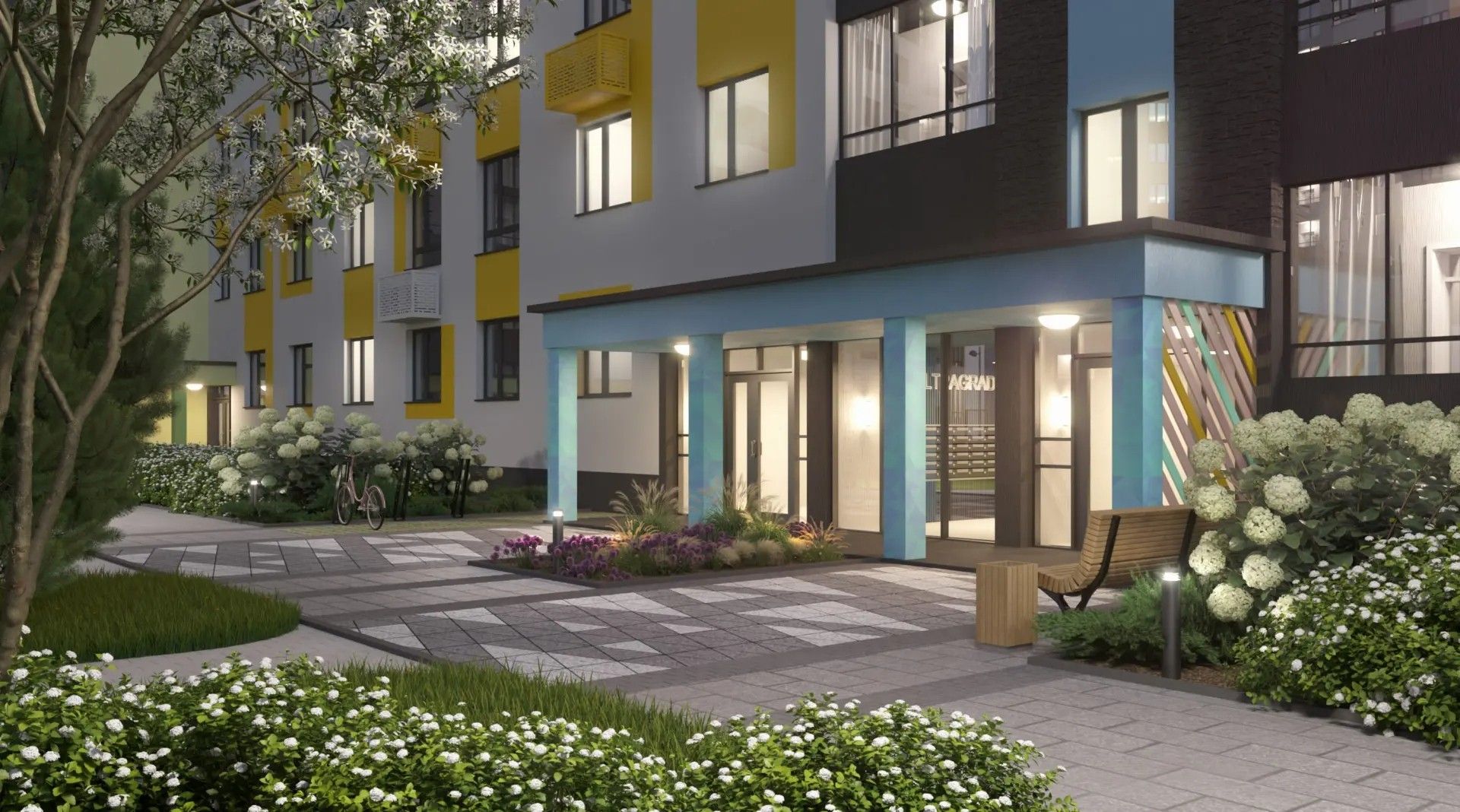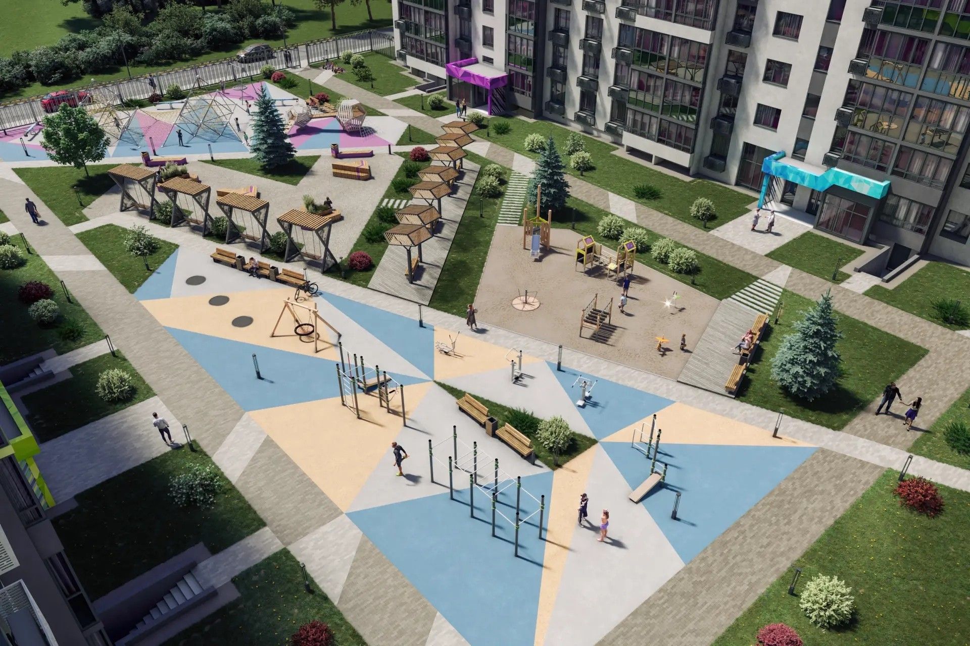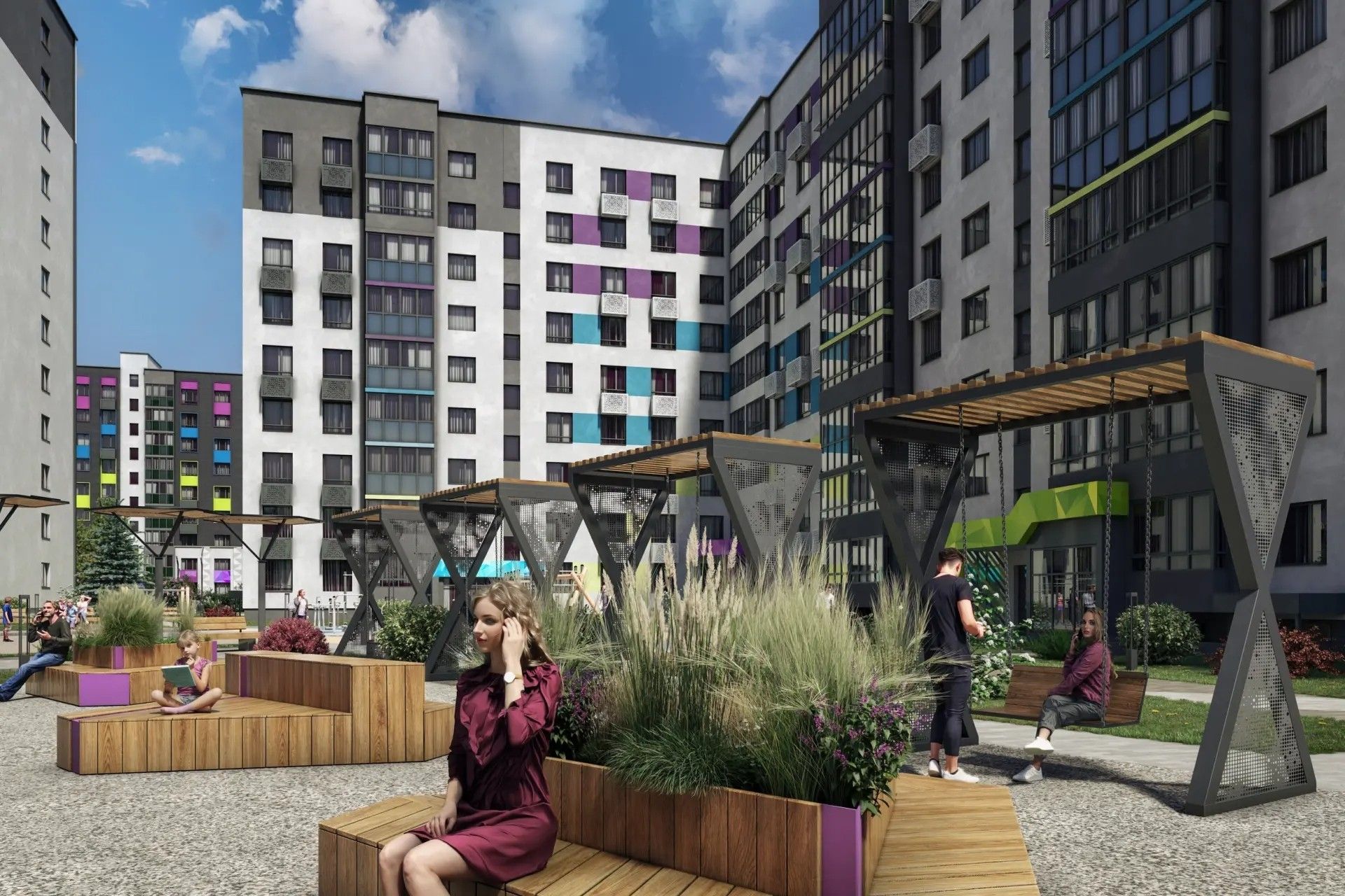 - Озеленение — взрослые деревья, кустарники, цветы и газоны превращают пространство в зелёный оазис.
