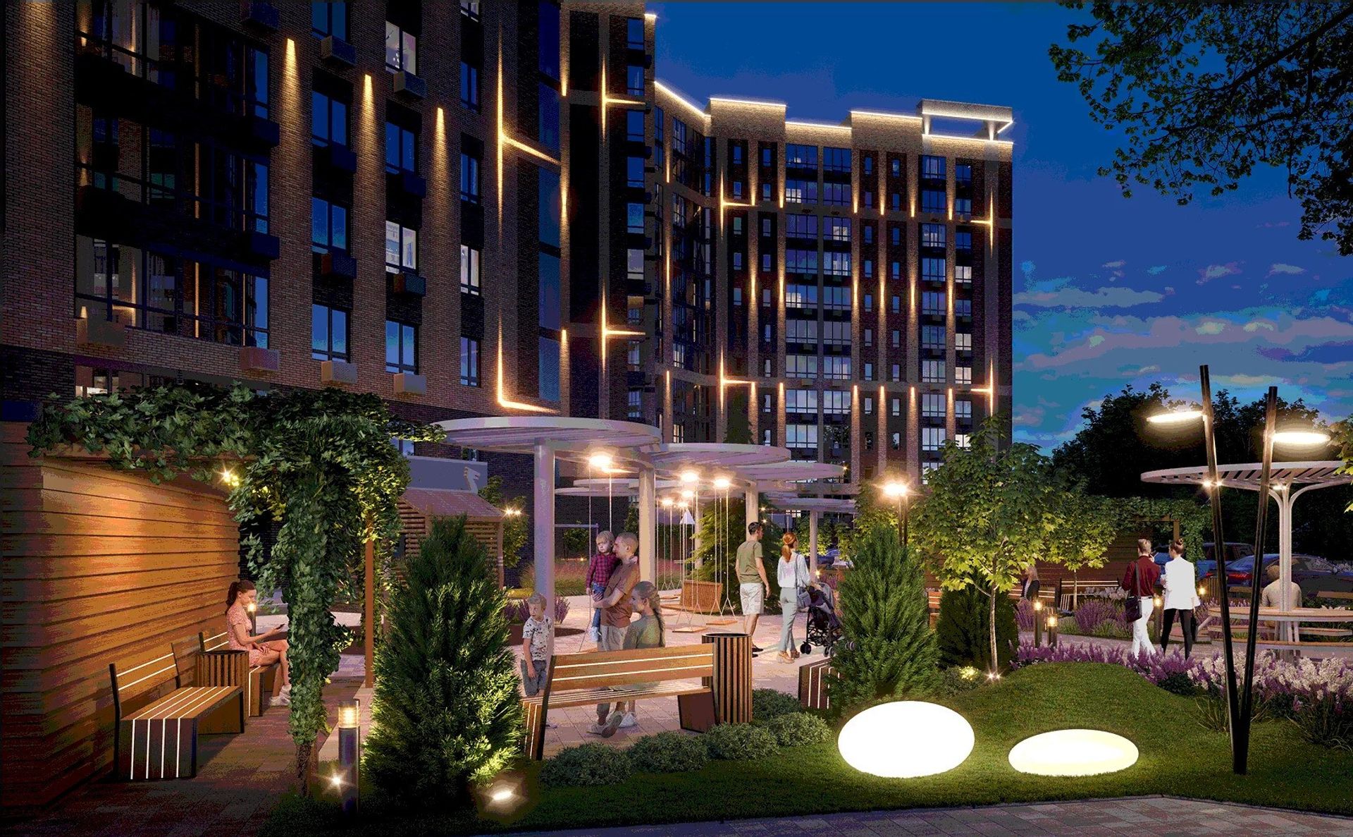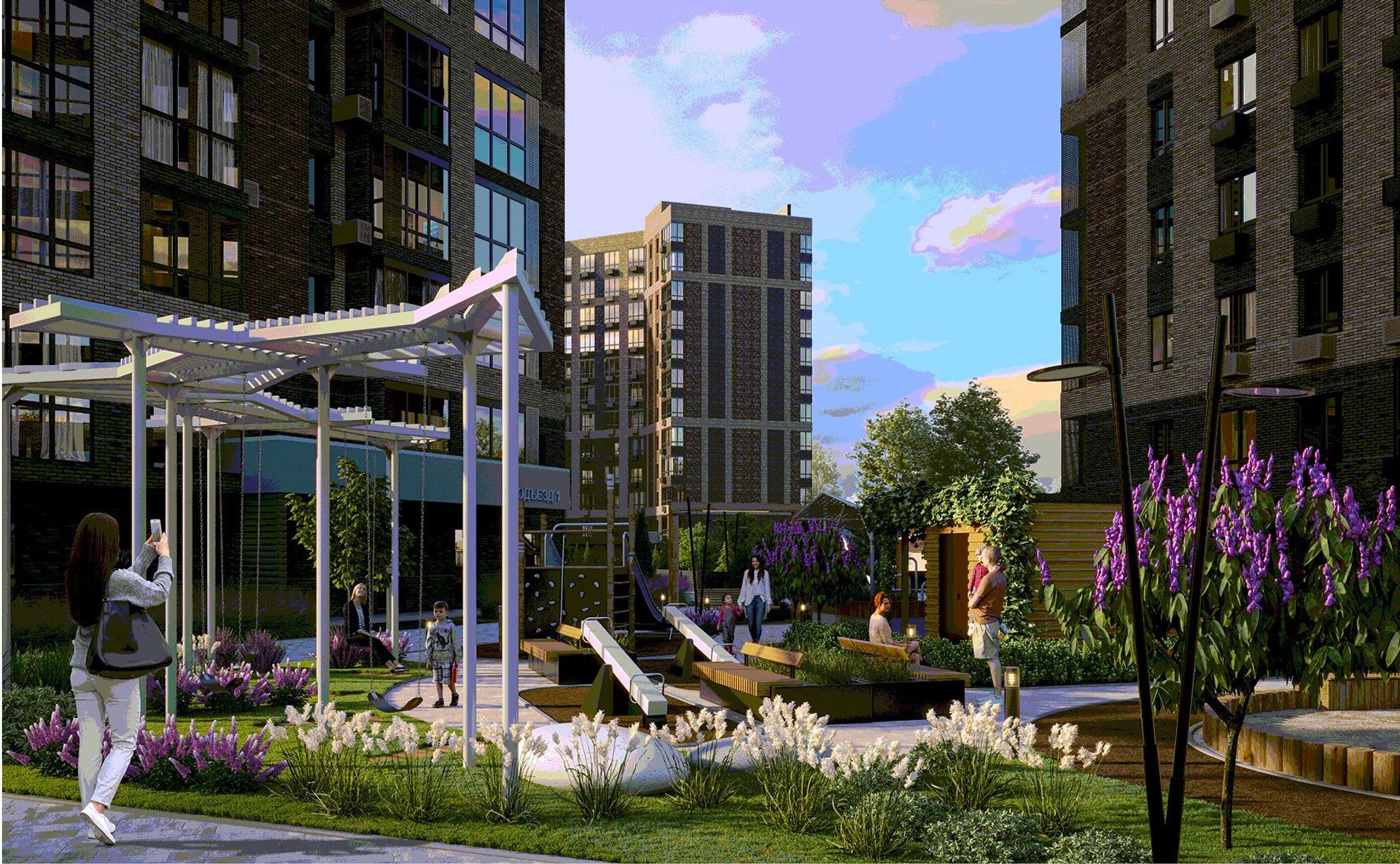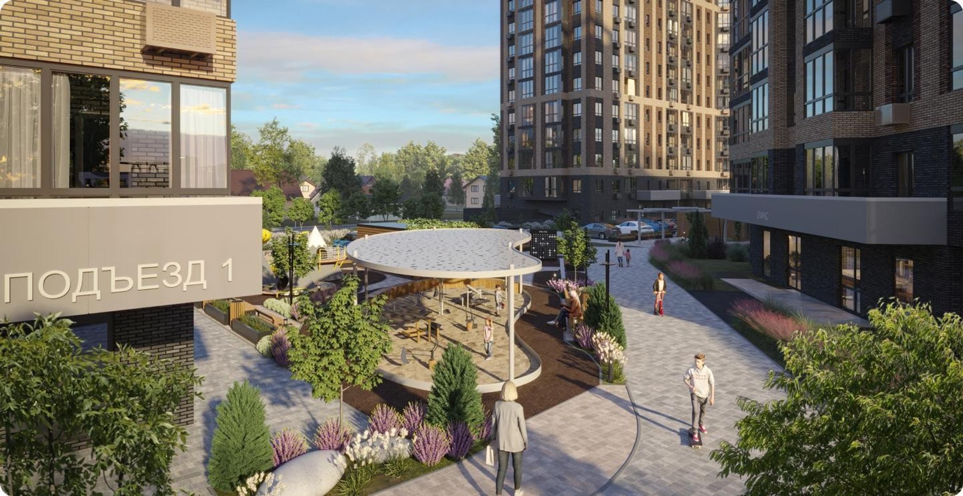 Территория закрыта от посторонних и наполнена зеленью. Двор без машин — дети спокойно играют, взрослые отдыхают в скверах. Для прогулок предусмотрены аллеи, для спорта — площадки, а для питомцев — отдельные зоны и лапомойки.