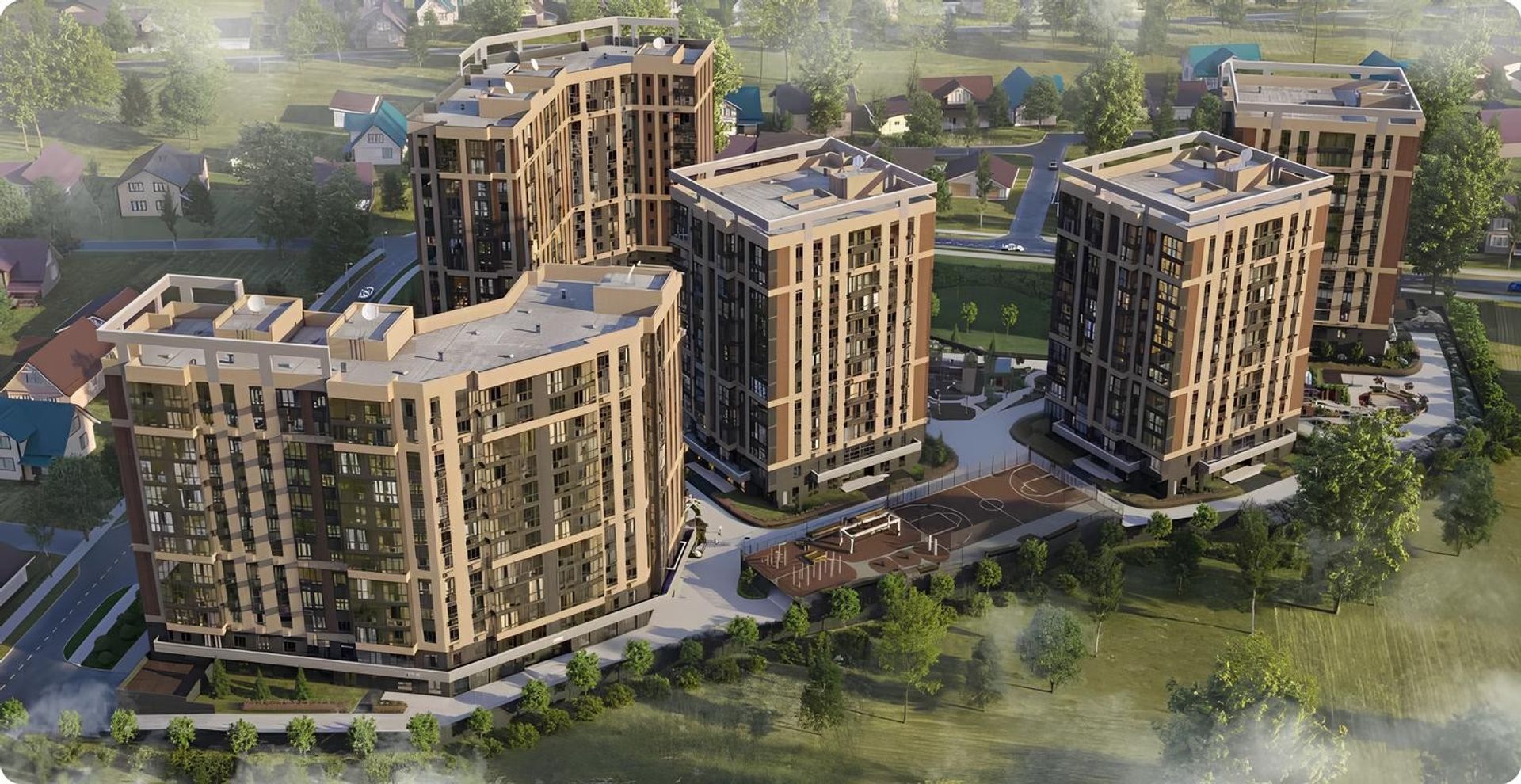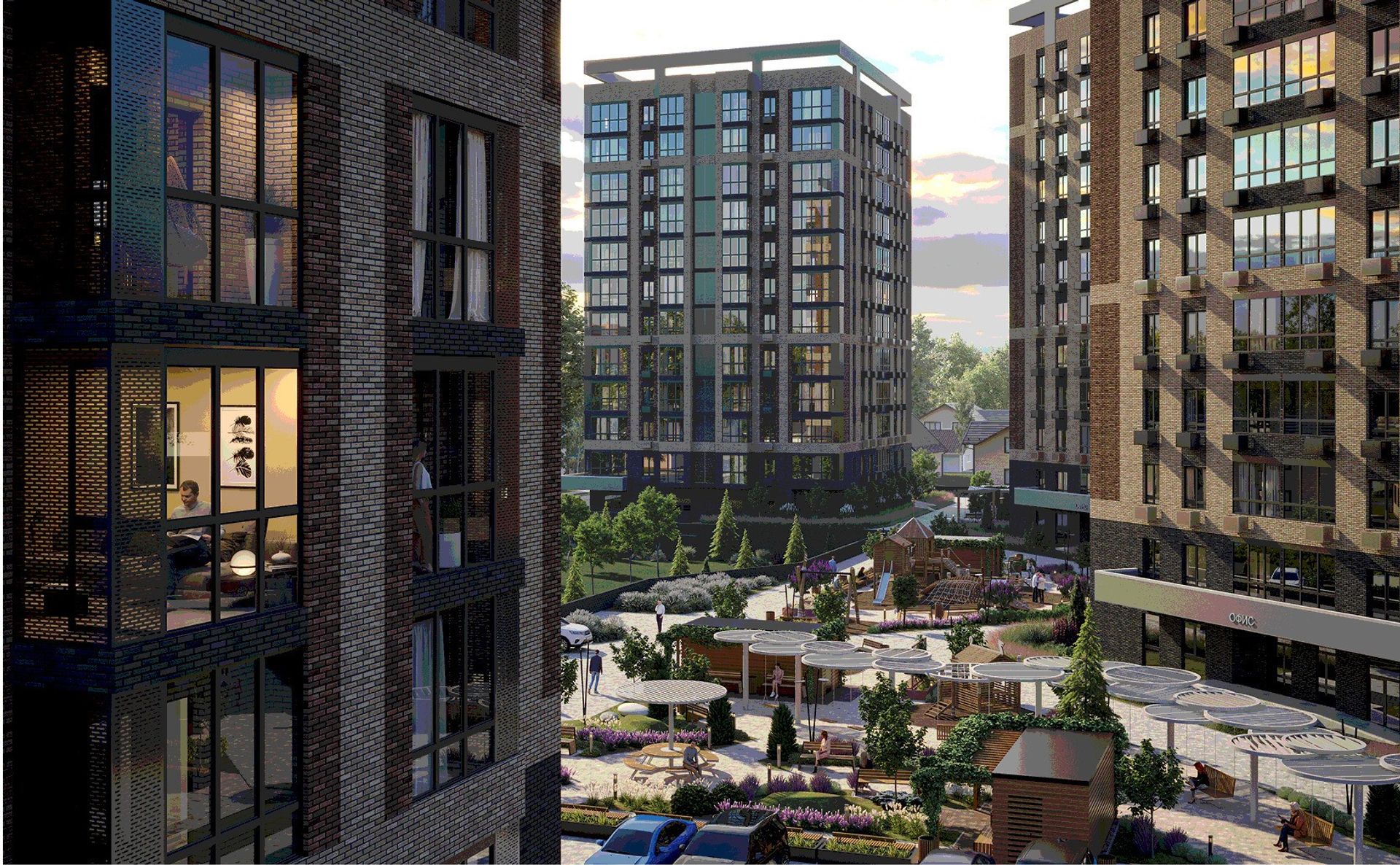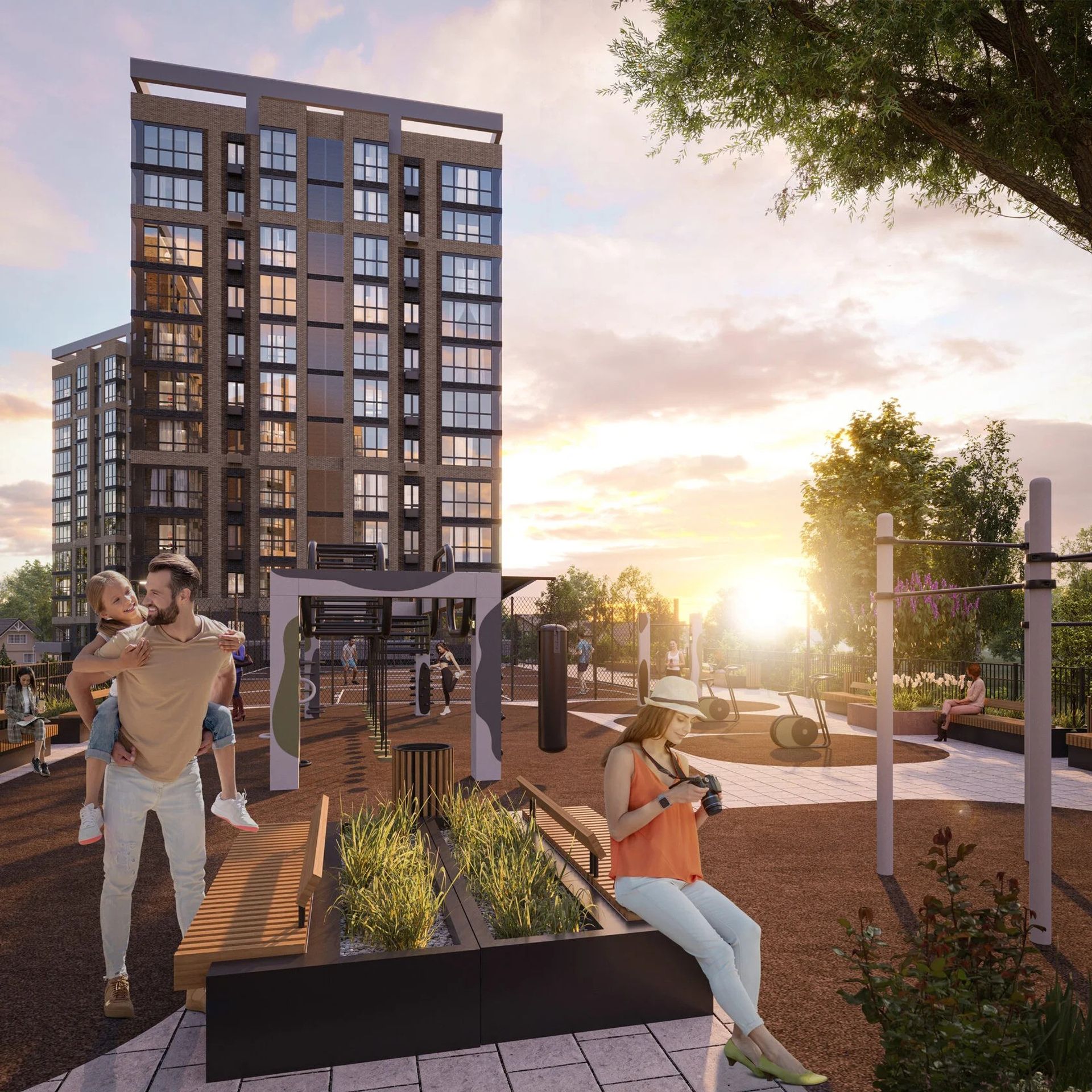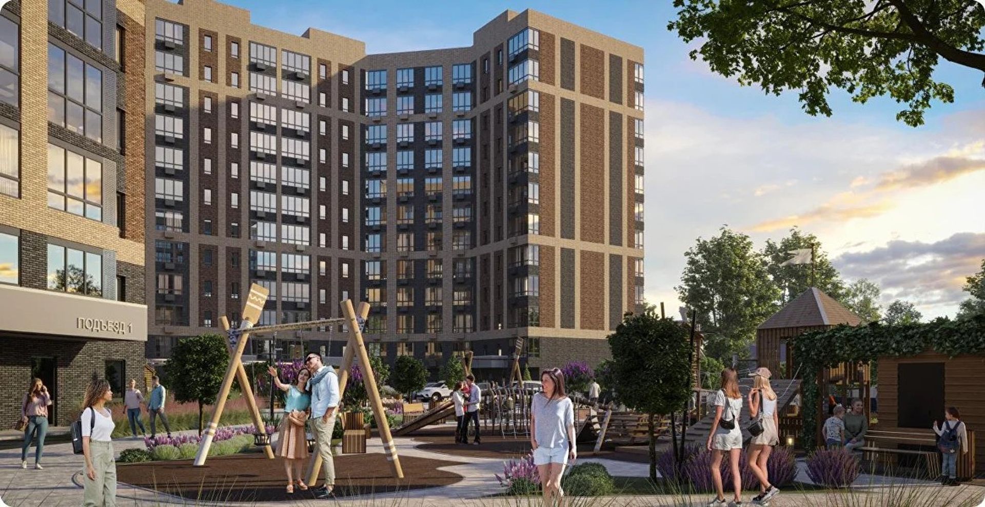Территория закрыта от посторонних и наполнена зеленью. Двор без машин — дети спокойно играют, взрослые отдыхают в скверах. Для прогулок предусмотрены аллеи, для спорта — площадки, а для питомцев — отдельные зоны и лапомойки.