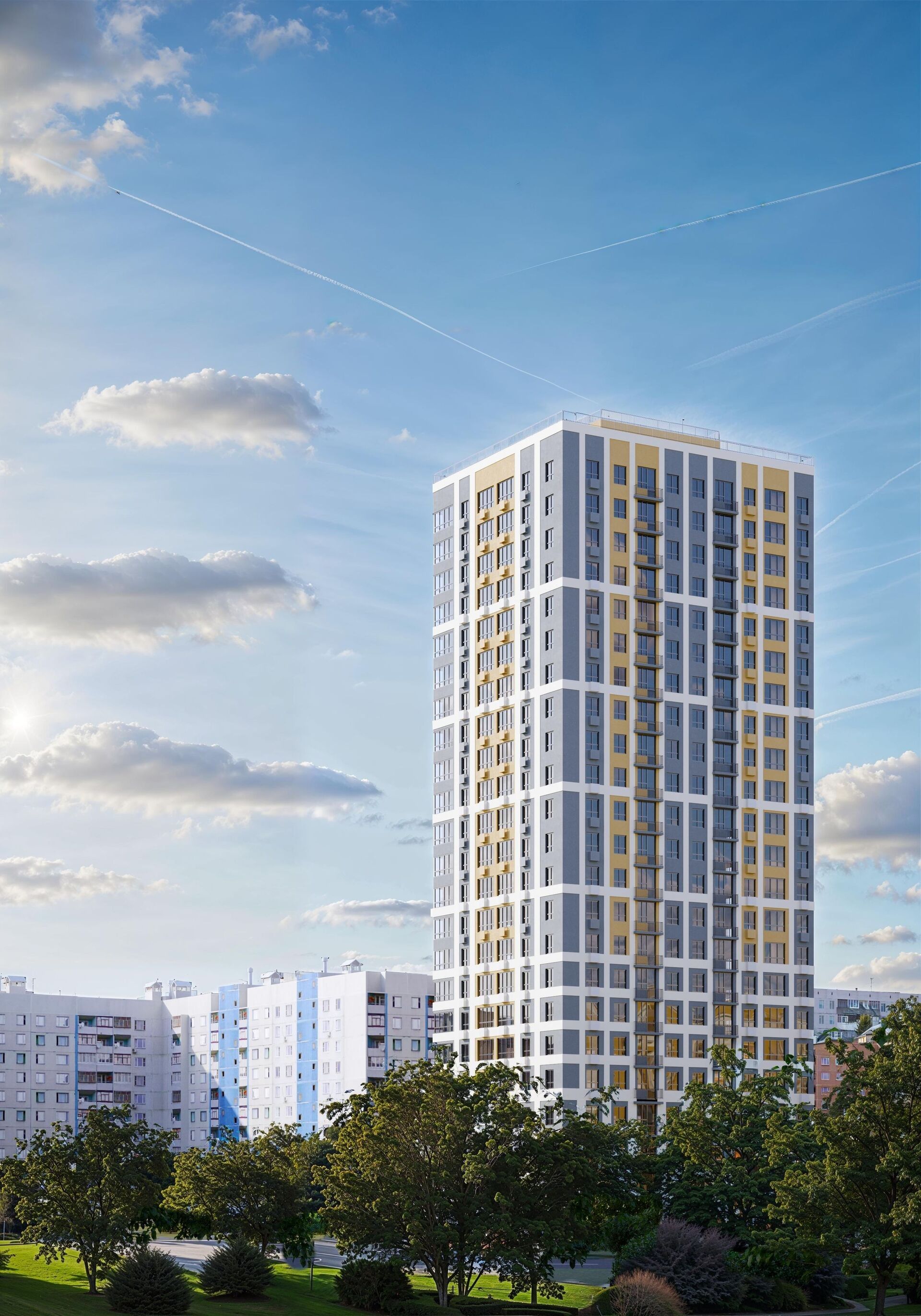 Акцент района — 21-этажная башня в единой стилистике проекта.