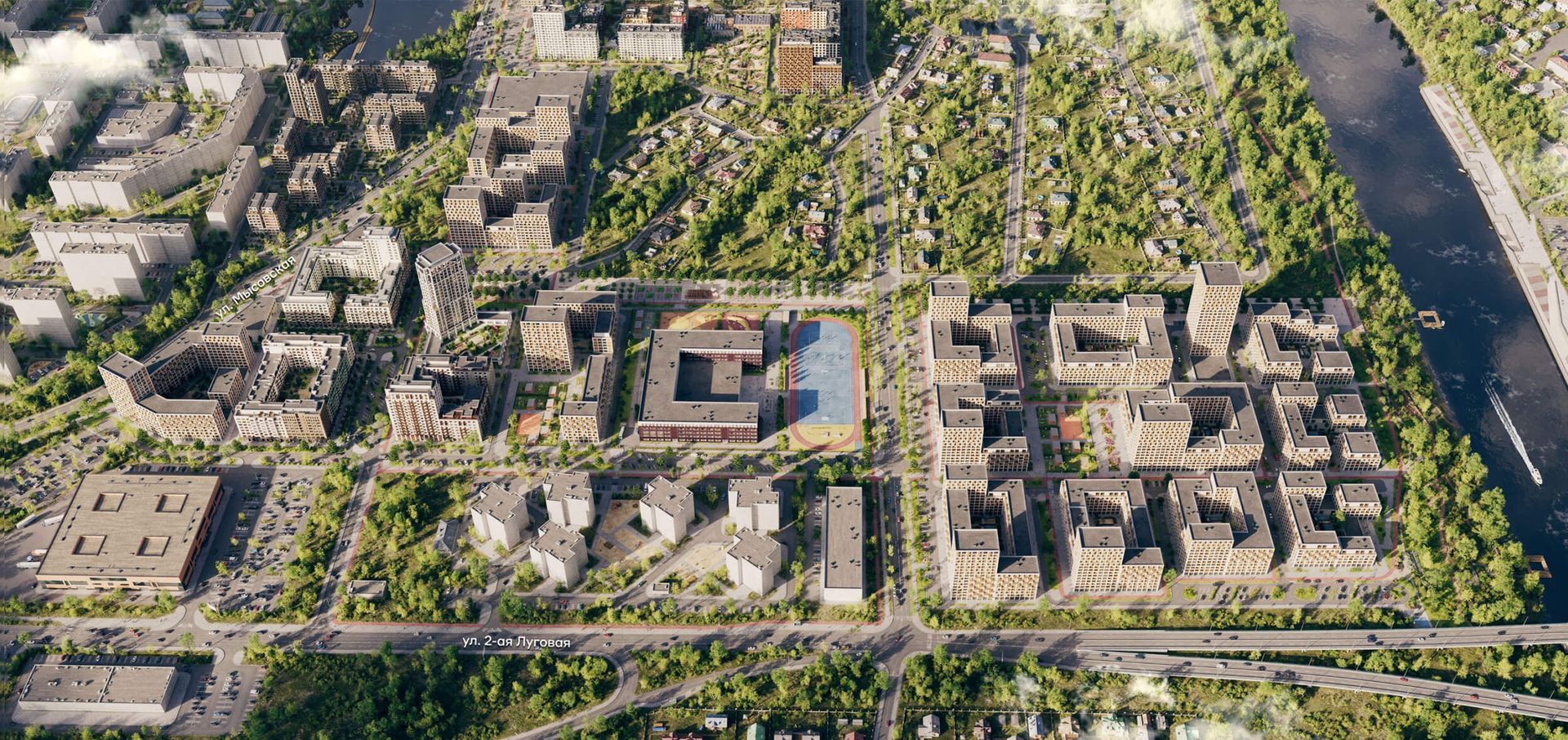 Проект застройки охватывает территорию около 29 гектаров в границах улиц 2-я Луговая, Береговая и Урайская. Архитектура комплекса решена с понижением этажности к реке и акцентными башнями. Жилые здания размещены ступенчато, создавая буфер от моста и проезжей части. Фасады выполнены в спокойной цветовой гамме — бежевые, терракотовые, пастельные оттенки, зелёный и кирпичный.