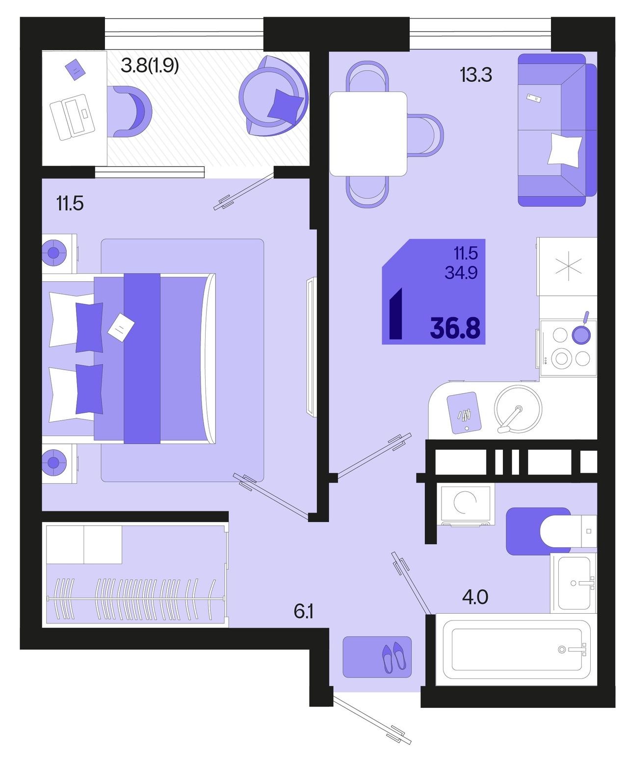 1-комнатная — 36,8 м² 5/18 эт. в Первое место