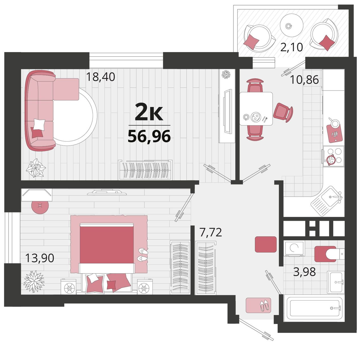 2-комнатная — 56,96 м² 2/18 эт. в Родные Просторы