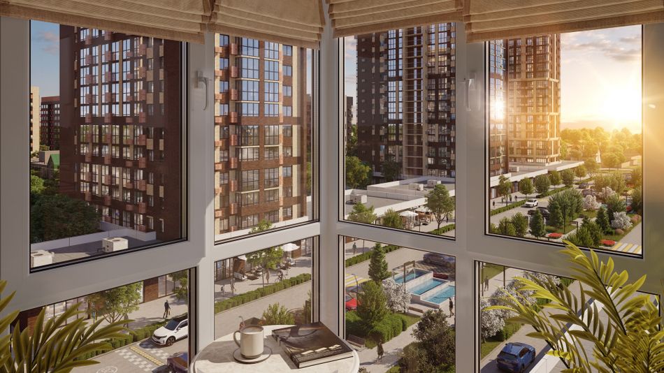 Современная концепция благоустройства - три детских садика, школа, поликлиника и фитнес-центр с бассейном на территории. Большой зеленый парк с фонтаном и зонами отдыха для всех.