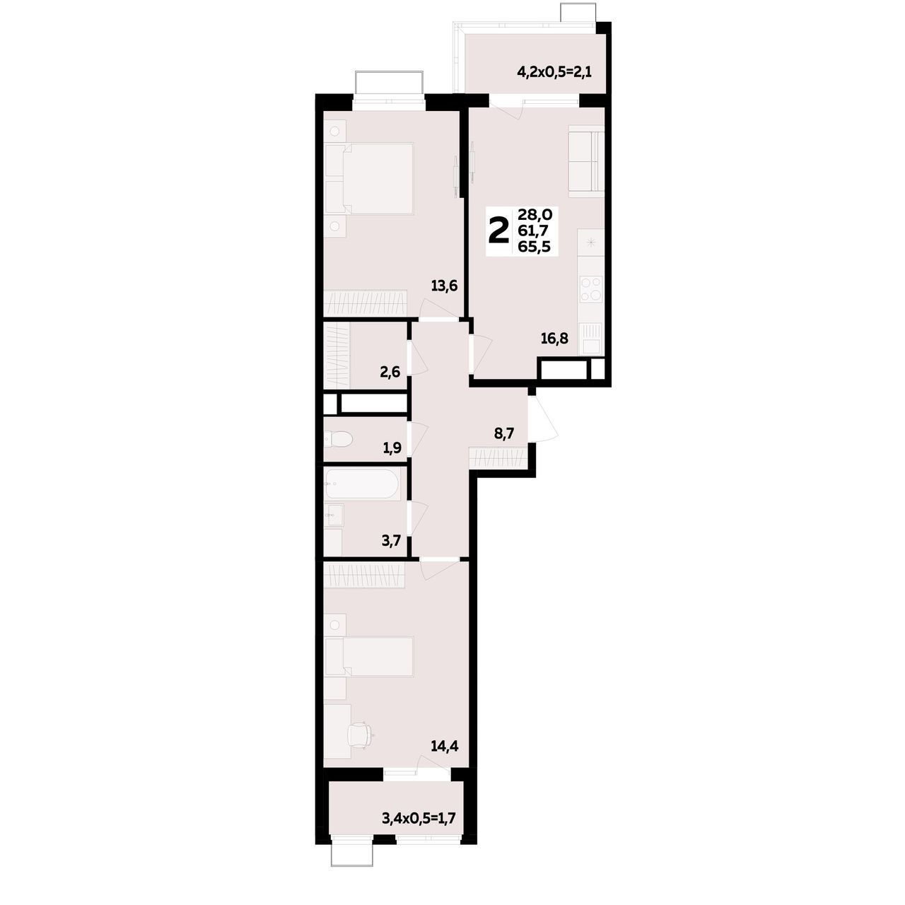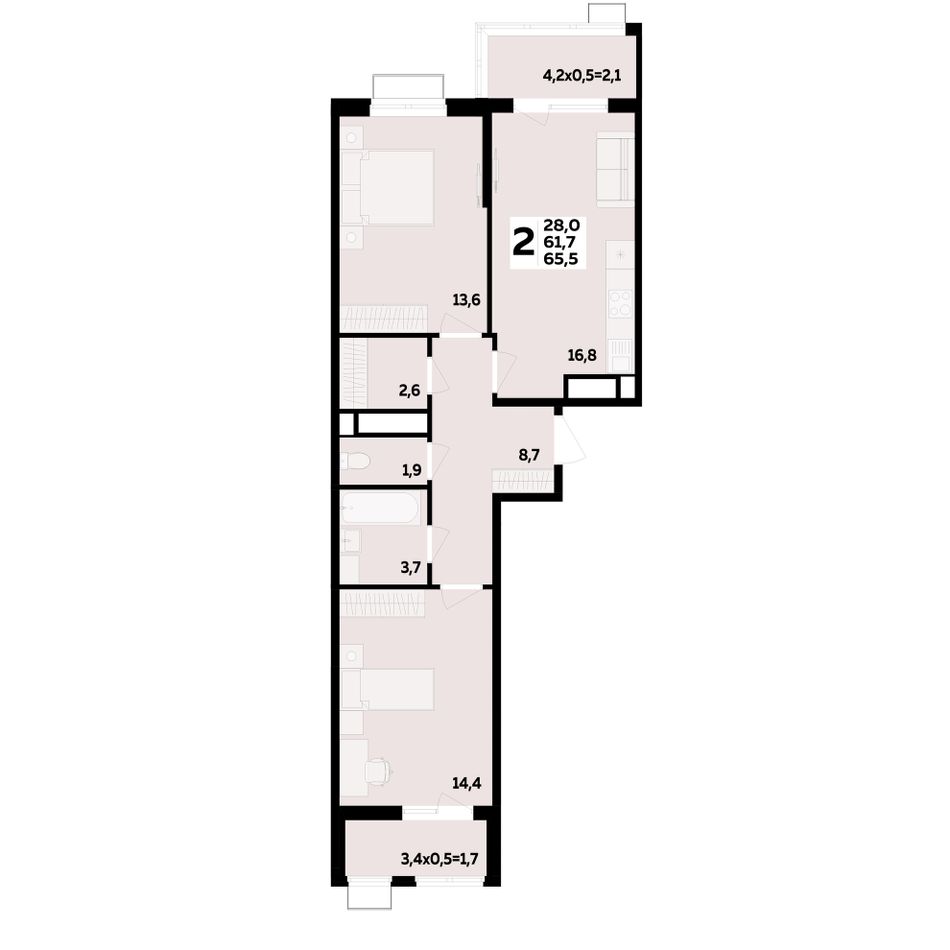 2-комнатная — 65,5 м² 9/16 эт. в МЕГАСИТИ