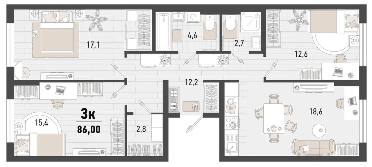 3-комнатная — 86 м² 1/15 эт. в Барса