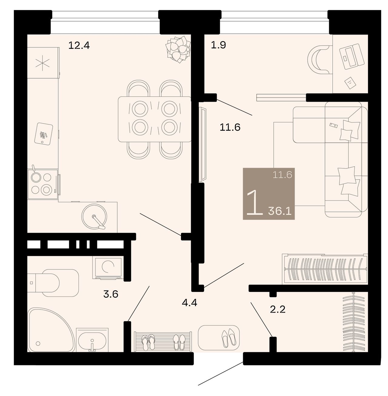 1-комнатная — 36,1 м² 5/9 эт. в Хозяин морей