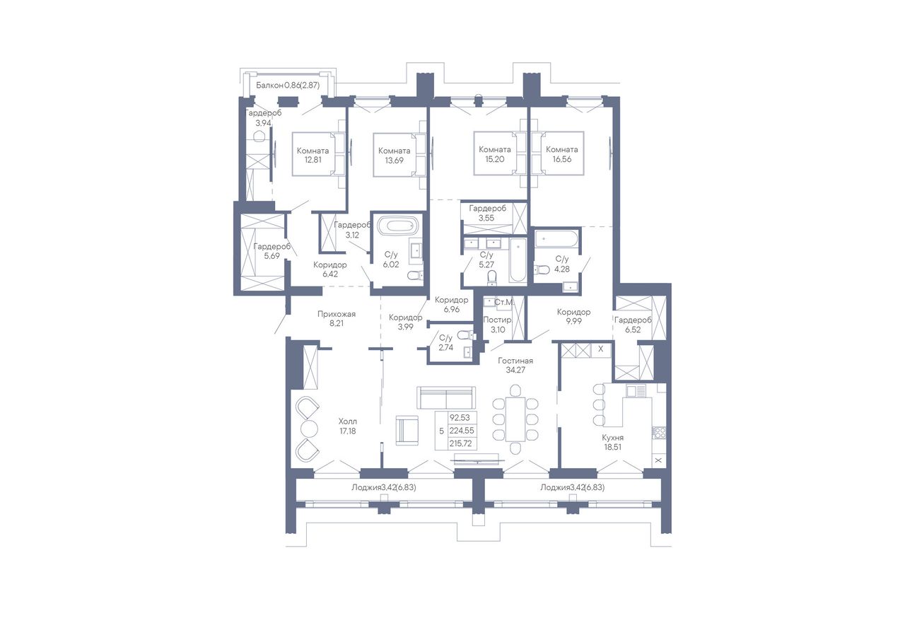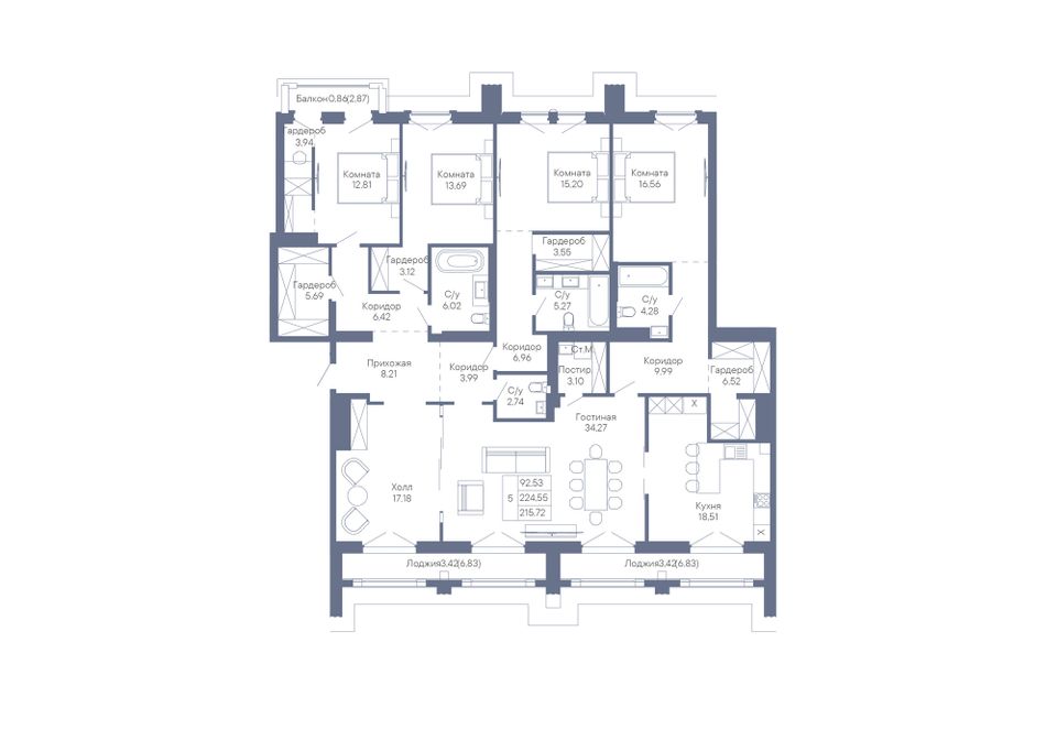 4+ комнатная — 215,72 м² 5/7 эт. в Дом-Резиденция Собрание