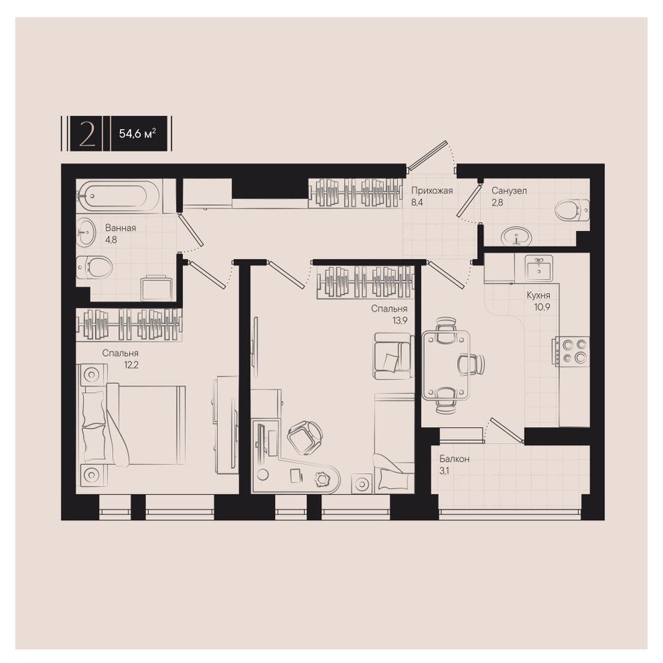 2-комнатная — 54,6 м² 2/18 эт. в Эрмитаж