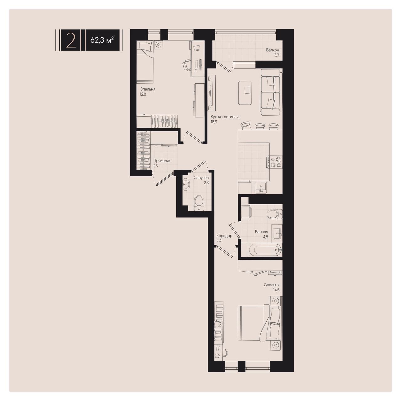 2-комнатная — 62,3 м² 9/18 эт. в Эрмитаж