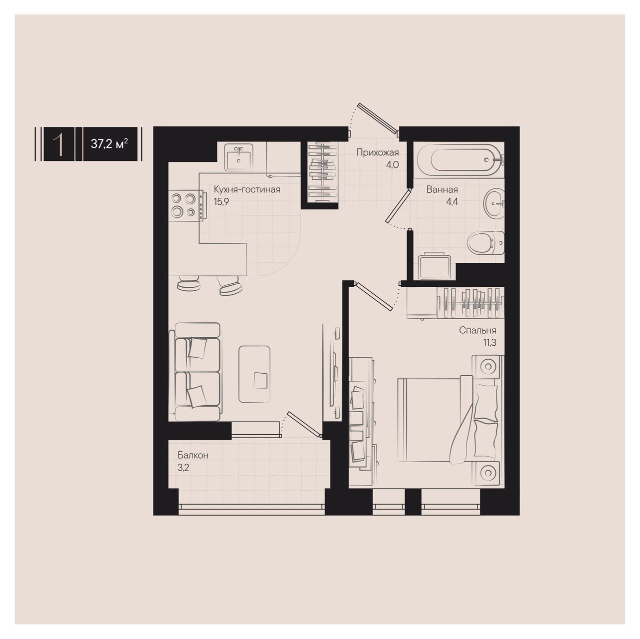 1-комнатная — 37,2 м² 4/18 эт. в Эрмитаж