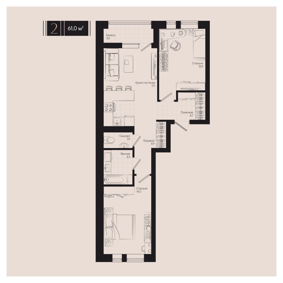 2-комнатная — 61 м² 6/18 эт. в Эрмитаж