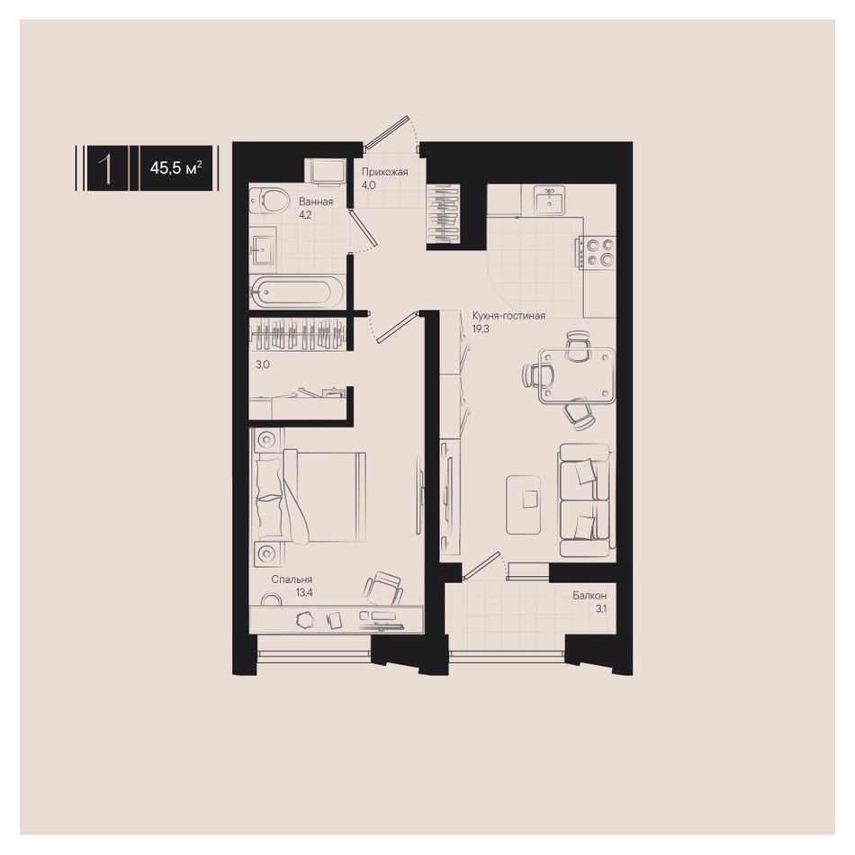 1-комнатная — 45,5 м² 6/18 эт. в Эрмитаж