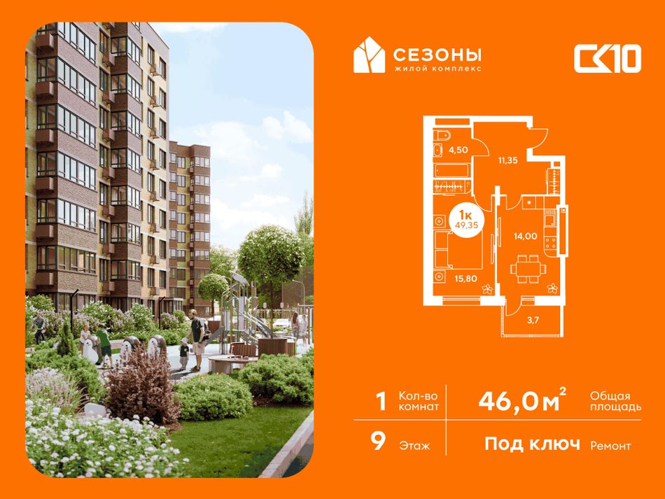 Квартира на 9 этаже в жилом комплексе «СЕЗОНЫ». 1-комнатная квартира площадью 46 м². Современное пространство с удобной планировкой, просторной кухней 14 м², светлыми жилыми комнатами 15.8 м² и функциональным санузлом [ПлощадиСанузловСовместных] м².