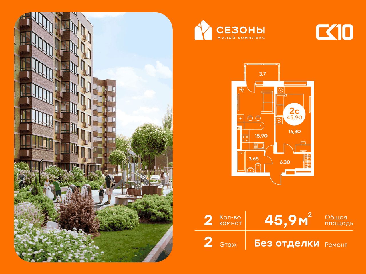 2-комнатная — 45,85 м² 2/9 эт. в Сезоны