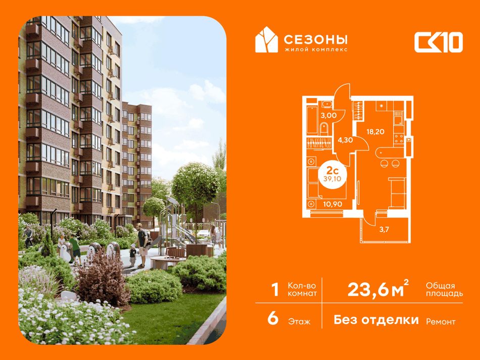Квартира на 6 этаже в жилом комплексе «СЕЗОНЫ». 1-комнатная квартира площадью 23,65 м². Современное пространство с удобной планировкой, просторной кухней 5,75 м², светлыми жилыми комнатами 7.5 м² и функциональным санузлом [ПлощадиСанузловСовместных] м².