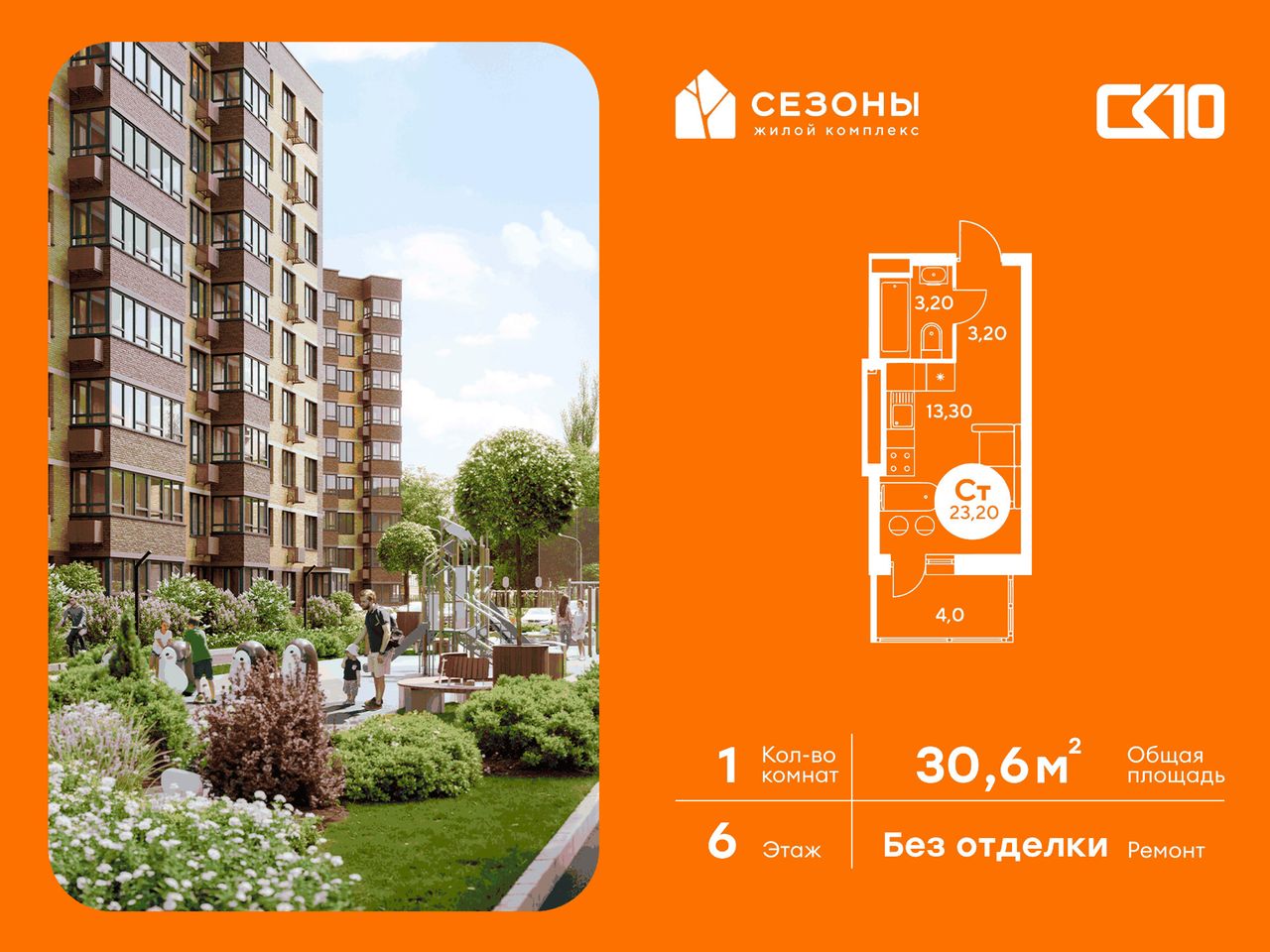 Студия — 30,6 м² 6/9 эт. в Сезоны