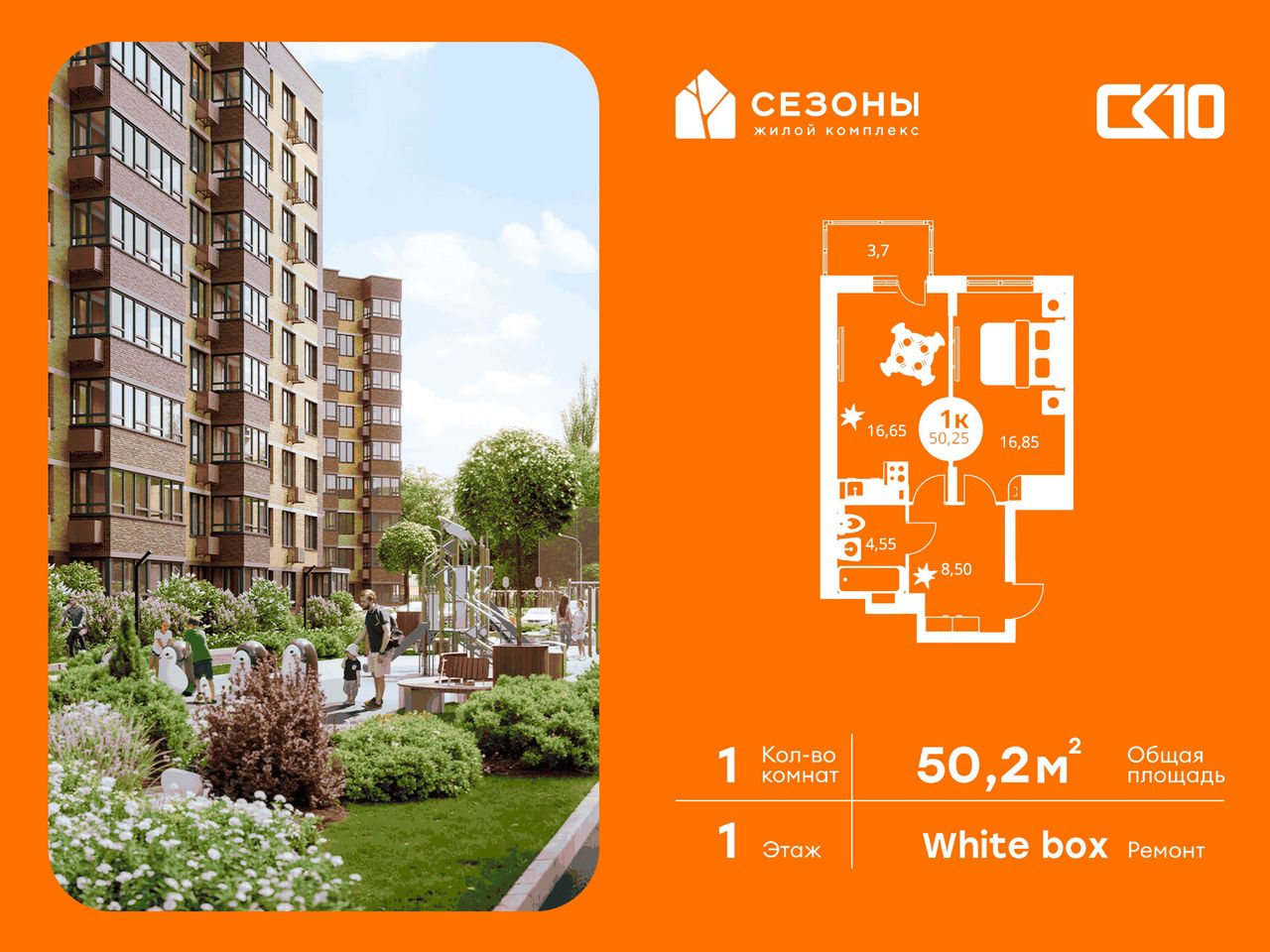 Квартира на 1 этаже в жилом комплексе «СЕЗОНЫ». 1-комнатная квартира площадью 50,25 м². Современное пространство с удобной планировкой, просторной кухней 16,65 м², светлыми жилыми комнатами 16.85 м² и функциональным санузлом [ПлощадиСанузловСовместных] м².