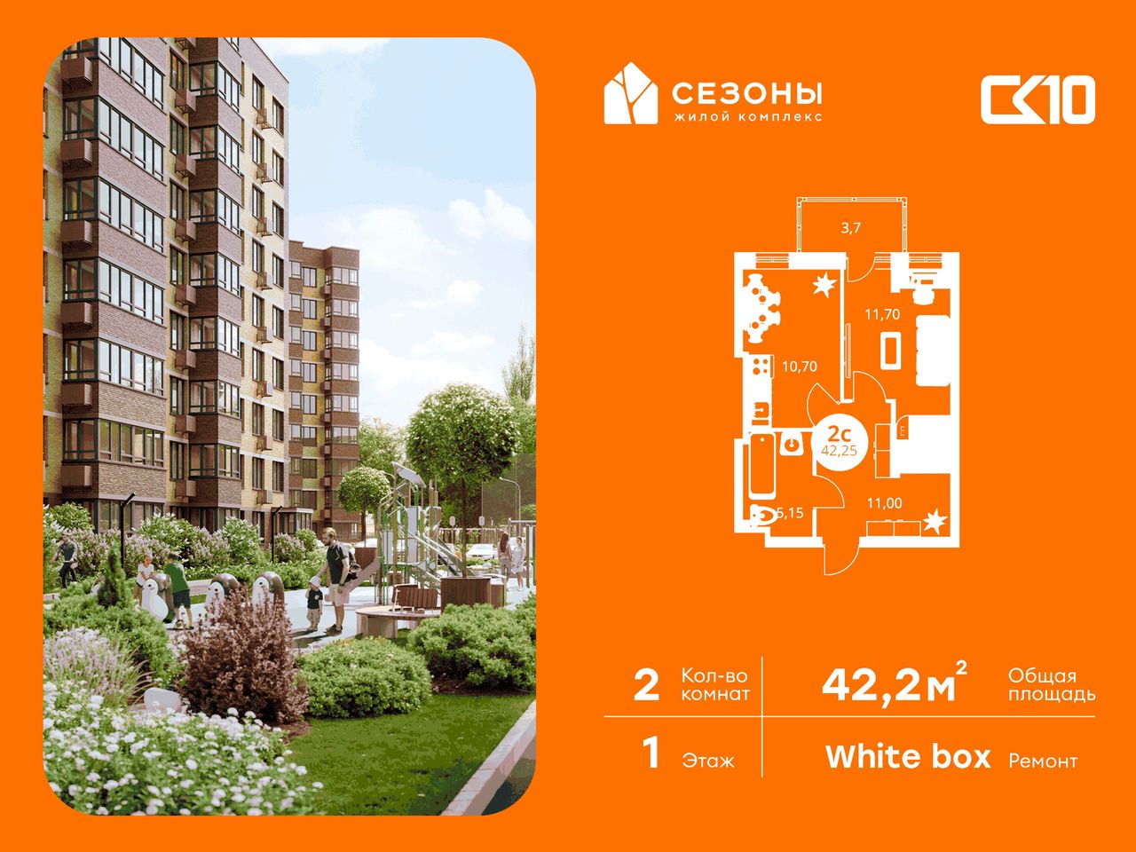 Квартира на 1 этаже в жилом комплексе «СЕЗОНЫ». 2-комнатная квартира площадью 42,25 м². Современное пространство с удобной планировкой, просторной кухней 10,7 м², светлыми жилыми комнатами 21,1 м² и функциональным санузлом [ПлощадиСанузловСовместных] м².
