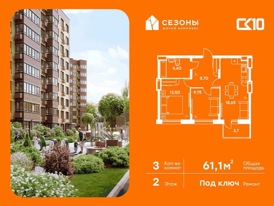 3-комнатная — 61,1 м² 2/9 эт. в Сезоны