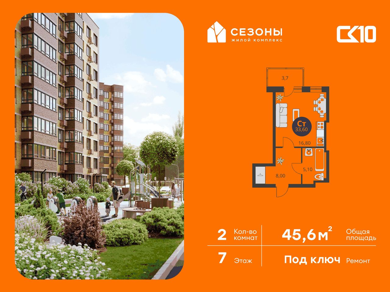 Квартира на 7 этаже в жилом комплексе «СЕЗОНЫ». 2-комнатная квартира площадью 45,65 м². Современное пространство с удобной планировкой, просторной кухней 14,8 м², светлыми жилыми комнатами 16/14,7 м² и функциональным санузлом [ПлощадиСанузловСовместных] м².