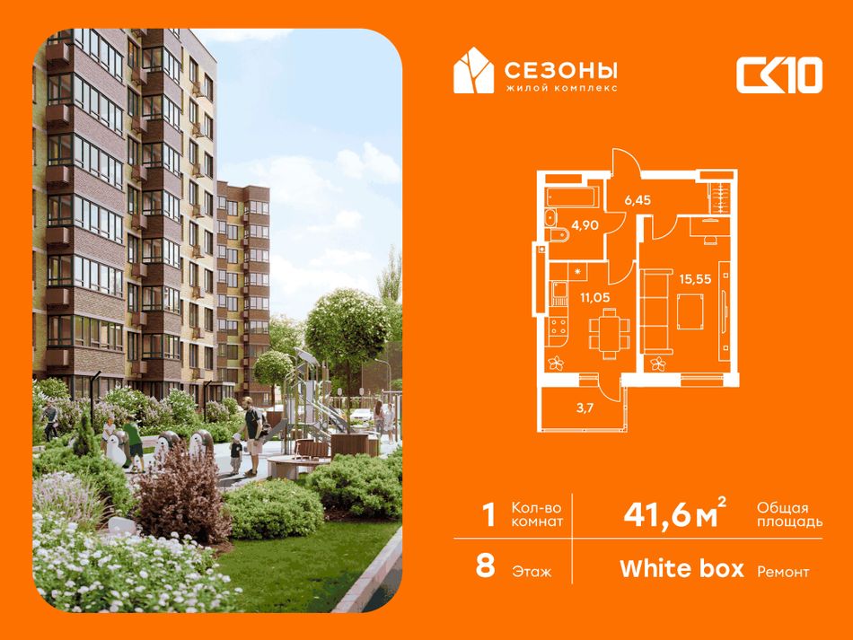 Квартира на 8 этаже в жилом комплексе «СЕЗОНЫ». 1-комнатная квартира площадью 41,65 м². Современное пространство с удобной планировкой, просторной кухней 11,1 м², светлыми жилыми комнатами 15.6 м² и функциональным санузлом [ПлощадиСанузловСовместных] м².