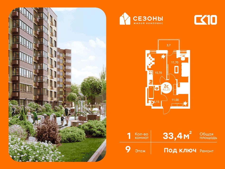 Студия — 33,35 м² 9/25 эт. в Сезоны