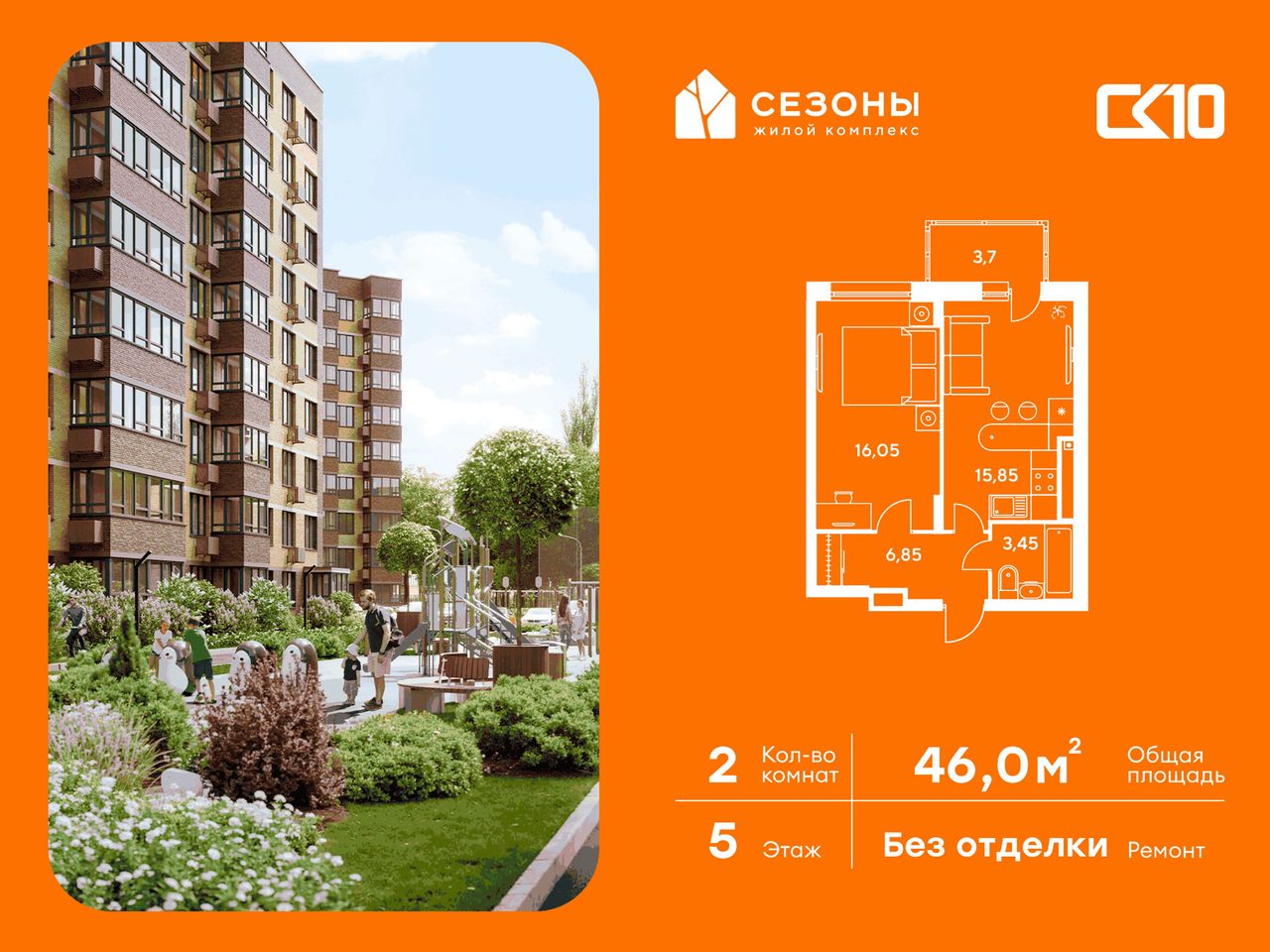 Квартира на 5 этаже в жилом комплексе «СЕЗОНЫ». 2-комнатная квартира площадью 45,95 м². Современное пространство с удобной планировкой, просторной кухней 16,2 м², светлыми жилыми комнатами 16,05/15,85 м² и функциональным санузлом [ПлощадиСанузловСовместных] м².