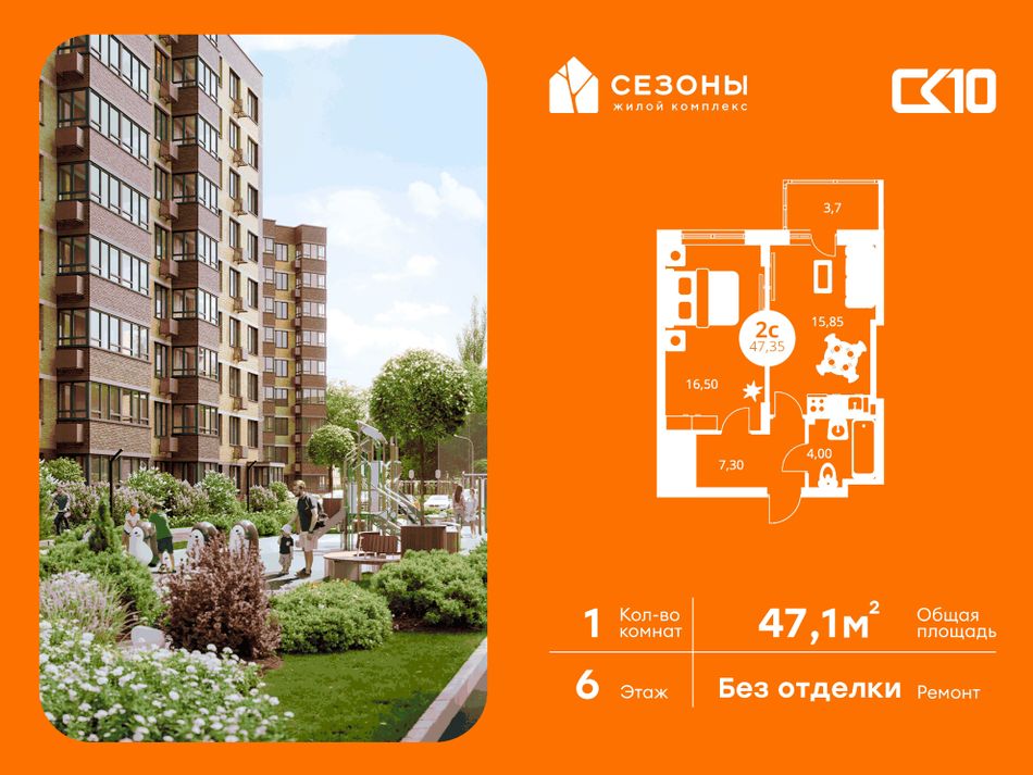 Квартира на 6 этаже в жилом комплексе «СЕЗОНЫ». 1-комнатная квартира площадью 47,1 м². Современное пространство с удобной планировкой, просторной кухней 14 м², светлыми жилыми комнатами 14.3 м² и функциональным санузлом [ПлощадиСанузловСовместных] м².