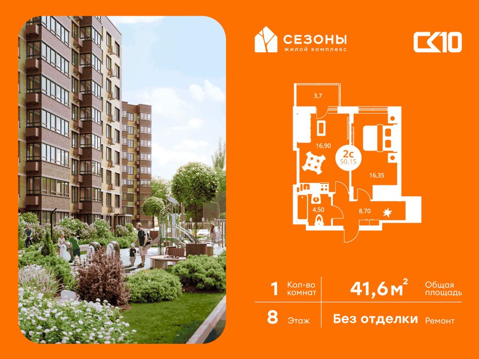 Квартира на 8 этаже в жилом комплексе «СЕЗОНЫ». 1-комнатная квартира площадью 41,65 м². Современное пространство с удобной планировкой, просторной кухней 11,1 м², светлыми жилыми комнатами 15.6 м² и функциональным санузлом [ПлощадиСанузловСовместных] м².